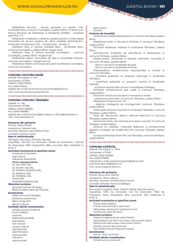 WWW.GHIDULPRIMARIILOR.RO JUDE%u021aUL BIHOR / 101Reabilitare termic%u0103%u00a0 %u2013 %u0218coala generala cu clasele I-VIII, localitatea Boiu, comuna Ciumeghiu, jude%u021bul Bihor, finan%u021bat prin Planul Na%u021bional de Redresare %u0219i Rezilien%u021b%u0103 (PNRR) - investi%u021bia specific%u0103 - I.3Reabilitare moderat%u0103 a cl%u0103dirilor publice pentru a %u00eembun%u0103t%u0103%u021bi furnizarea de servicii publice de c%u0103tre unit%u0103%u021bile administrativteritoriale Componenta C10 %u2013 Fondul local %u2013 Runda%u00a0 2.Realizare foraj %u0219i ci%u0219mea stradal%u0103 Boiu%u00a0 , localitatea Boiu, comuna Ciumeghiu, jude%u021bul Bihor.-buget localRealizare foraj %u0219i ci%u0219mea stradal%u0103 Ciumeghiu , comuna Ciumeghiu, jude%u021bul Bihor.-buget localReabilitare sistem centralizat de ap%u0103 %u00een localitatea Ghiorac, comuna Ciumeghiu %u201d-buget local 22Reabilitare sistem centralizat de ap%u0103 %u00een localitatea Ciumeghiu, comuna CiumeghiuCOMUNA COCIUBA MAREAdres%u0103: Principal%u0103, nr. 210Cod po%u0219tal: 417200Telefon: 0259-311232; Fax: 0259-311324; Adresa de e-mail: primaria.cociubamare@cjbihor.roURL: www.primariacociubamare.roCOMUNA COMUNA T%u0102M%u0102%u015eEUAdres%u0103: nr. 149Cod po%u0219tal: 417056Telefon: 0259-458553; Fax: 0259-458580; Adresa de e-mail: primaria@tamaseu.ro, office@tamaseu.roURL: www.tamaseu.roPersoane din primarie:Primar: Matyi Mikl%u00f3sViceprimar: N%u00e9meti IuliuSecretar General:%u00a0Ioana Elena%u00a0Flore%u00a0Contabil: Carmen%u00a0Oni%u021baSate %u00een administra%u021bie:T%u0103m%u0103%u015feu, Satu Nou, Parhida, NiuvedSuprafa%u021ba:%u00a0 4614,94 ha; Intravilan:%u00a0 187,58 ha; Extravilan:%u00a0 4427,36 ha; Popula%u021bia:%u00a01990; Gospod%u0103rii:%u00a0882; Locuin%u021be:%u00a0882; Gr%u0103dini%u021be:%u00a03; %u0218coli:%u00a01; Activitati economice si specifice zonei:Cre%u0219terea animalelorAgricultur%u0103Industrie alimentar%u0103Firme reprezentative:SC AVI-VEST SRLSC NUTRI -AVI SRLSC PATROL SERVICE SRLSC SADELLI SRLSC TARSING SRLOASIS SRL PARTNER DRINKS SRLObiective turistice:%u015etrandul Termal T%u0103m%u0103%u015feu Biserica Reformat%u0103 din ParhidaEvenimente:Zilele Comunei T%u0103m%u0103%u0219eu%u00cent%u00e2nlirea v%u00e2rstnicilorBalul strugurilorBal de Cr%u0103ciunFacilit%u00e3%u0163i oferite investitorilor:Infrastructur%u0103 modern%u0103:Drum asfaltatInternetRe%u021bea ap%u0103 potabil%u0103Cale ferat%u0103Gaz naturalAcces la DN 19Ap%u0103 termal%u0103Ap%u0103 Mineral%u0103Oportunit%u0103%u021bi:IndustrieAp%u0103 termal%u0103Agricultur%u0103Comer%u021bProiecte de investi%u0163ii:Construire %u0219i dotare baz%u0103%u00a0sportiv%u0103%u00a0%u00een comuna T%u0103m%u0103%u0219eu jude%u021bul BihorReabilitare str%u0103zi %u00een Niuved %u0219i Parhida %u00een comuna T%u0103m%u0103%u0219eu, jude%u021bul Bihor%u00cenfiin%u021bare dispensar medical %u00een localitatea T%u0103m%u0103%u0219eu, jude%u021bul BihorAchizi%u021bionare instala%u021bie de dezinfec%u021bie %u0219i dezinsec%u021bie %u00een comuna T%u0103m%u0103%u0219eu, jude%u021bul BihorModernizarea, renovarea %u0219i dotarea c%u0103minelor culturale %u00een comuna T%u0103m%u0103%u0219eu, jude%u021bul Bihor- c%u0103min cultural %u00een localitatea Niuved- c%u0103min cultural %u00een localitatea Parhida%u00cembun%u0103t%u0103%u021birea infrastructurii educa%u021bionale %u0219i sociale %u00een comuna T%u0103m%u0103%u0219eu:- %u00eenfiin%u021bare gr%u0103dini%u021b%u0103 cu program prelungit %u00een localitatea T%u0103m%u0103%u0219eu- reabilitare gr%u0103dini%u021b%u0103 cu program normal %u00een localitatea Parhida- %u00eenfiin%u021bare dotare after-school %u00een localitatea T%u0103m%u0103%u0219eu %u00cenfiin%u021bare infrastructur%u0103 apa uzat%u0103 %u00een comuna T%u0103m%u0103%u0219eu, jude%u021bul Bihor%u00cenfiin%u021bare infrastructur%u0103 pentru transportul verde- piste pentru biciclete, %u00een Comuna T%u0103m%u0103%u0219eu, jude%u021bul BihorRealizarea infrastructurii TIC%u2013 sisteme inteligente de management comuna T%u0103m%u0103%u0219eu, jude%u021bul BihorAmenajare trotuare %u0219i parc%u0103ri %u00een localitatea T%u0103mp%u0219eu, comuna T%u0103m%u0103%u0219eu, jude%u021bul BihorSta%u021bii de re%u00eenc%u0103rcare pentru vehicule electrice %u00een comuna T%u0103mp%u0219eu, jude%u021bul BihorConstruire centru de colectare prin aport voluntar %u00een Comuna T%u0103m%u0103%u0219eu Jude%u021bul BihorDotarea cu mobilier, materiale didactice %u0219i echipamente digitale a init%u0103%u021bilor de %u00eenv%u0103%u021b%u0103m%u00e2nt din comuna T%u0103mp%u0219ei, jude%u021bul BihorConstruire Baz%u0103 sportiv%u0103 TIP 2, sat T%u0103m%u0103%u0219eu, comuna T%u0103m%u0103%u0219eu, jude%u021bul Bihor COMUNA COP%u0102CELAdres%u0103: Principal%u0103, nr. 176ACod po%u0219tal: 417205Telefon: 0259-313598; Fax: 0259-313598; Adresa de e-mail: primariacopacel@yahoo.comprimaria.copacel@cjbihor.roURL: www.copacel-bihor.roPersoane din primarie:Primar: Silviu-Ioan%u00a0Petri%u021ba%u00a0Viceprimar: Petru V%u00e2%u015fcanSecretar General: Amalia Denisa%u00a0Conta%u00a0Contabil: Mihaela Maria%u00a0DindeleganSate %u00een administra%u021bie:Bucuroaia, Cop%u0103cel, Chijic, Poiana-T%u0103%u015fad, S%u0103rand, SurducSuprafa%u021ba:%u00a0 7476 ha; Intravilan:%u00a0 144 ha; Extravilan:%u00a0 7332 ha; Popula%u021bia:%u00a0 2245; Gospod%u0103rii:%u00a0 872; Locuin%u021be:%u00a0 1157; Gr%u0103dini%u021be:%u00a0 5; %u0218coli:%u00a06; Activitati economice si specifice zonei:Prelucrarea lapteluiPrelucrarea primar%u0103 a lemnuluiOb%u0163inerea uleiului prin presare la receConstruc%u0163ii%u00a0case din lemn%u00a0Obiective turistice:Pe%u015ftera Cop%u0103cel de pe valea PietreiDou%u0103 biserici de lemn la Surduc monument istoricBiserica din Bucuroaia monument istoricZonele colinare ale comuneiVecin%u0103tate Mun%u0163ii P%u0103durea CraiuluiEvenimente:Anual - Ziua comuneiFacilit%u00e3%u0163i oferite investitorilor:Infrastructura comunei