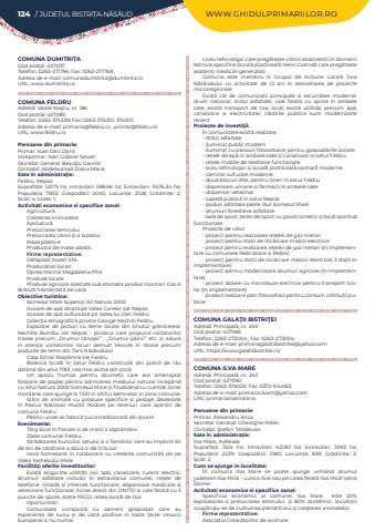 124 / JUDE%u021aUL BISTRI%u021aA-N%u0102S%u0102UD WWW.GHIDULPRIMARIILOR.ROCOMUNA DUMITRI%u021aACod po%u0219tal: 427037Telefon: 0263-271756; Fax: 0263-271768; Adresa de e-mail: comunadumitrita@dumitrita.roURL: www.dumitrita.roCOMUNA FELDRUAdres%u0103: Vasile Na%u015fcu, nr. 186Cod po%u0219tal: 427080Telefon: 0263-374339; Fax: 0263-374310, 374301; Adresa de e-mail: primaria@feldru.ro , primar@feldru.roURL: www.feldru.roPersoane din primarie:Primar: Ioan Dan Opri%u0219Viceprimar: Ioan Gabriel SalvanSecretar General: Be%u015fu%u0163iu Gavril%u0103Contabil: Abdelwahad%u00a0Diana MariaSate %u00een administra%u021bie:Feldru, NeposSuprafa%u021ba:%u00a012275 ha; Intravilan:%u00a0598,66 ha; Extravilan:%u00a011676,34 ha; Popula%u021bia:%u00a0 7855; Gospod%u0103rii:%u00a0 2045; Locuin%u021be:%u00a0 2128; Gr%u0103dini%u021be:%u00a0 2; %u0218coli:%u00a04; Licee:%u00a01; Activitati economice si specifice zonei:Agricultur%u0103Cre%u0219terea animalelorApicultur%u0103Prelucrarea lemnuluiPrelucrarea c%u0103rnii %u0219i a lapteluiMase plasticeProduc%u021bia de mase plasticFirme reprezentative:Defaplast Invest SRLProduc%u0103tori locali:Oprea Marina Magdalena PFAProduse locale: Produse agricole atestate sub eticheta produs montan: Ca%u0219 si Br%u00e2nz%u0103 fr%u0103m%u00e2ntat%u0103 de vac%u0103Obiective turistice:Some%u0219ul Mare Superior Sit Natura 2000Izvoare de ap%u0103 s%u0103rat%u0103 pe Valea Carelor sat NeposIzvoare de ap%u0103 sulfuroas%u0103 pe Valea lui Dan FeldruColec%u021bia etnografic%u0103 private George Nechiti FeldruExpozi%u021bie de picturi cu teme locale din %u021binutul gr%u0103niceresc Nechita Bumbu sat Nepos - pictorul care propune vizitatorilor trasee precum ,,Drumul c%u00e2nepii%u2019%u2019 , ,,Drumul p%u00e2inii%u2019%u2019 etc. %u0219i aduce %u00een aten%u021bia vizitatorilor locuri demult trecute %u00een istorie precum podurile de lemn din %u021aara N%u0103s%u0103uduluiCasa Etnos Mo%u0219tenire Vie FeldruBiseric%u0103 local%u0103 %u00een satul Feldru construit%u0103 din piatr%u0103 de r%u00e2u dat%u00e2nd din anul 1783, cea mai veche din zon%u0103Un spa%u021biu frumos pentru drume%u021bii care are amenajate foi%u0219oare de popas pentru admirarea mediului natural %u00eencep%u00e2nd cu Situl Natura 2000 Some%u0219ul Mare %u0219i finaliz%u00e2nd cu culmile zonei montane care ajunge la 1100 %u00een V%u00e2rful Semnelor %u00een zona comuneiSt%u00e2ni de animale cu produse specifice %u0219i peisaje deosebite %u00een Parcul Na%u021bional Mun%u021bii Rodnei pe terenuri care apar%u021bin de comuna Feldru P%u0103linci unde se fabric%u0103 %u021buica tradi%u021bional%u0103 din pruneEvenimente:T%u00e2rg local %u00een fiecare zi de mar%u021bi a s%u0103pt%u0103m%u00e2niiZilele comunei FeldruS%u0103rb%u0103toarea bunicilor satului %u0219i a familiilor care au %u00eemplinit 50 de ani de c%u0103s%u0103torie a doua zi de Cr%u0103ciun Hora Some%u0219an%u0103 %u00een colaborare cu celelalte comunit%u0103%u021bi de pe Valea Some%u0219ului MareFacilit%u00e3%u0163i oferite investitorilor:Exist%u0103 asigurate utilit%u0103%u021bi noi: ap%u0103, canalizare, curent electric, drumuri asfaltate inclusiv %u00een extravilanul comunei, re%u021bele de telefonie mobil%u0103 %u0219i internet func%u021bionale; dispensare medicale %u0219i veterinare func%u021bionale; Acces direct din DN17D %u0219i cale ferat%u0103 cu 3 puncte de oprire, sta%u021bie PECO, re%u021bea local%u0103 de taxiOportunit%u0103%u021biComunitate compact%u0103 cu oameni gospodari care au experien%u021be de lucru %u0219i de via%u021b%u0103 pozitive %u00een toate %u021b%u0103rile Uniunii Europene %u0219i nu numaiLiceu tehnologic care preg%u0103te%u0219te viitorii absolven%u021bii %u00een domenii tehnice specifice %u0218coal%u0103 postliceal%u0103 Henri Coand%u0103 care preg%u0103te%u0219te asisten%u021bi medicali generali%u0219tiComuna este membru %u00een Grupul de Ac%u021biune Local%u0103 %u021aara N%u0103s%u0103udului cu activitate de 12 ani %u00een dezvoltarea de proiecte microregionaleExist%u0103 c%u0103i de comunica%u021bii principale %u0219i secundare moderne: drum na%u021bional, str%u0103zi asfaltate, cale ferat%u0103 cu oprire %u00een ambele sate; exist%u0103 transport de taxi local; exist%u0103 utilit%u0103%u021bi precum ap%u0103, canalizare %u0219i electricitate; cl%u0103dirile publice sunt modernizate recentProiecte de investi%u0163ii:%u00cen comunitate exist%u0103 realizate :- str%u0103zi asfaltate- iluminat public modern- iluminat cu panouri fotovoltaice pentru gospod%u0103riile izolate- re%u021bele de ap%u0103 %u00een ambele sate %u0219i canalizare %u00een satul Feldru- re%u021bele mobile de telefonie func%u021bionale- liceu tehnologic %u0219i %u0219coal%u0103 postliceal%u0103 sanitar%u0103 moderne- c%u0103mine culturale moderne- dou%u0103 blocuri ANL pentru tineri %u00een satul Feldru- dispensare umane %u0219i farmacii %u00een ambele sate- dispensar veterinar- capel%u0103 public%u0103 %u00een satul Nepos- poduri asfaltate peste r%u00e2ul Some%u0219ul Mare- drumuri forestiere asfaltate- Sal%u0103 de sport, teren de sport cu gazon sintetic %u0219i baz%u0103 sportiv%u0103 func%u021bionaleProiecte de viitor- proiect pentru realizarea re%u021belei de gaz metan - proiect pentru sta%u021bii de %u00eenc%u0103rcare ma%u0219ini electrice-%u00a0proiect pentru realizarea re%u021belei de gaz metan (%u00een implementare cu comunele Rebri%u0219oara %u0219i Rebra)- proiect pentru sta%u021bii de %u00eenc%u0103rcare ma%u0219ini electrice( 3 sta%u021bii %u00een implementare)- proiect pentru modernizare drumuri agricole (%u00een implementare)- proiect dotare cu microbuze electrice pentru transport scolar (%u00een implementare) - proiect realizare parc fotovoltaic pentru consum institu%u021bii publiceCOMUNA GALA%u0162II BISTRI%u0162EIAdres%u0103: Principal%u0103, nr. 240Cod po%u0219tal: 427085Telefon: 0263-273004,; Fax: 0263-273004; Adresa de e-mail: primariagalatiibistritei@yahoo.comURL: https://www.galatiibistritei.ro/COMUNA ILVA MAREAdres%u0103: P