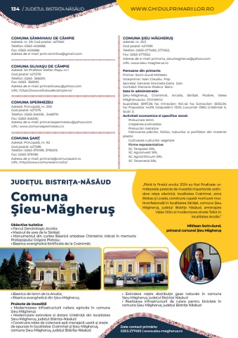 134 / JUDE%u021aUL BISTRI%u021aA-N%u0102S%u0102UD WWW.GHIDULPRIMARIILOR.ROCOMUNA S%u00c2NMIHAIU DE C%u00c2MPIEAdres%u0103: nr. 29; Cod po%u0219tal: 427260Telefon: 0363-402698; Fax: 0363-402698; Adresa de e-mail: prim.sinmihai@gmail.comCOMUNA SILIVA%u015eU DE C%u00c2MPIEAdres%u0103: Str.Profesor Stefan Popu nr.1Cod po%u0219tal: 427270Telefon: 0263- 356091; Fax: 0263- 356091; Adresa de e-mail: primasilivasu@yahoo.comURL: https://www.silivasudecampie.ro/COMUNA SPERMEZEUAdres%u0103: Principal%u0103, nr. 295Cod po%u0219tal: 427275Telefon: 0263-346516 , 346679; Fax: 0263-346516; Adresa de e-mail: primariaspermezeu@yahoo.comURL: www.comunaspermezeu.roCOMUNA %u015eAN%u0162Adres%u0103: Principal%u0103, nr. 92Cod po%u0219tal: 427285Telefon: 0263-379199, 379009; Fax: 0263-379199; Adresa de e-mail: primarie@comunasant.roURL: http://www.comunasant.ro/ro/COMUNA %u015eIEU M%u0102GHERU%u015eAdres%u0103: nr. 243Cod po%u0219tal: 427295Telefon: 0263-277490, 277052; Fax: 0263-277052; Adresa de e-mail: primaria_sieumagherus@yahoo.comURL: www.sieu-magherus.roPersoane din primarie:Primar: Sorin-Aurel%u00a0MititeanViceprimar:%u00a0Ioan Claudiu%u00a0%u00a0PopSecretar General: Marinela-Dalia%u00a0%u00a0DanContabil: Mariana-Rodica%u00a0%u00a0BancSate %u00een administra%u021bie:%u015eieu-M%u0103gheru%u015f, Crainimat, Arcalia, S%u0103r%u0103%u0163el, Podirei, Valea M%u0103gheru%u015fului, ChintelnicSuprafa%u021ba:%u00a0 5997,36 ha; Intravilan:%u00a0 941,42 ha; Extravilan:%u00a0 5055,94 ha; Popula%u021bia:%u00a04429; Gospod%u0103rii:%u00a01300; Locuin%u021be:%u00a01380; Gr%u0103dini%u021be:%u00a05; %u0218coli:%u00a03; Activitati economice si specifice zonei:Prelucrare lemnCre%u015fterea animalelorPrelucr%u0103ri metaliceFabricarea pl%u0103cilor, foliilor, tuburilor %u0219i profilelor din material plasticCultivarea culturilor vegetaleFirme reprezentative:SC Teraplast SRLSC Agroinvest SRLSC Agrotritticum SRLSC Terametal SRL