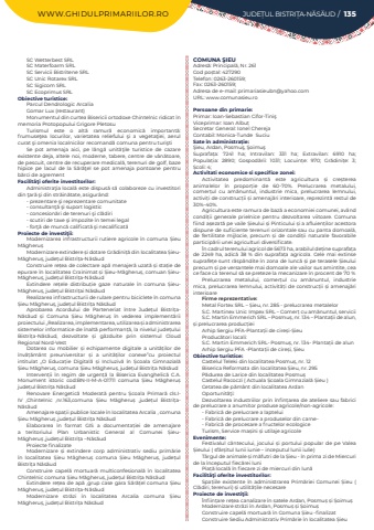 WWW.GHIDULPRIMARIILOR.RO JUDE%u021aUL BISTRI%u021aA-N%u0102S%u0102UD / 135SC Wetterbest SRLSC Materfoarm SRLSC Servicii Bistritene SRLSC Unic Rotarex SRLSC Sigicom SRL SC Ecoprimus SRLObiective turistice:Parcul Dendrologic ArcaliaGomar Lux (restaurant)Monumentul din curtea Bisericii ortodoxe Chintelnic ridicat %u00een memoria Protopopului Grigore PletosuTurismul este o alt%u0103 ramur%u0103 economic%u0103 important%u0103: frumuse%u0163ea locurilor, varietatea reliefului %u015fi a vegeta%u0163iei, aerul curat %u015fi omenia localnicilor recomand%u0103 comuna pentru turi%u015ftiSe pot amenaja aici, pe l%u00e2ng%u0103 unit%u0103%u0163ile turistice de cazare existente deja, altele noi, moderne, tabere, centre de v%u00e2n%u0103toare, de pescuit, centre de recuperare medical%u0103, terenuri de golf, baze hipice pe lacul de la S%u0103r%u0103%u0163el se pot amenaja pontoane pentru b%u0103rci de agrementFacilit%u00e3%u0163i oferite investitorilor:Administra%u0163ia local%u0103 este dispus%u0103 s%u0103 colaboreze cu investitori din %u0163ar%u0103 %u015fi din str%u0103in%u0103tate, asigur%u00e2nd:- prezentare %u015fi reprezentare comunitate- consultan%u0163%u0103 %u015fi suport logistic- concesion%u0103ri de terenuri %u015fi cl%u0103diri- scutiri de taxe %u015fi impozite %u00een temei legal- for%u0163%u0103 de munc%u0103 calificat%u0103 %u015fi necalificat%u0103Proiecte de investi%u0163ii:Modernizarea infrastructurii rutiere agricole %u00een comuna %u0218ieu M%u0103gheru%u0219Modernizare extindere %u0219i dotare Gr%u0103dini%u021b%u0103 din localitatea %u0218ieuM%u0103gheru%u0219, jude%u021bul Bistri%u021ba-N%u0103s%u0103udConstruire re%u021bea de colectare ap%u0103 menajer%u0103 uzat%u0103 %u0219i sta%u021bie de epurare %u00een localitatea Crainimat %u0219i %u0218ieu-M%u0103gheru%u0219, comuan %u0218ieuM%u0103gheru%u0219, jude%u021bul Bistri%u021ba-N%u0103s%u0103udExtindere re%u021bele distribu%u021bie gaze naturale %u00een comuna %u0218ieuM%u0103gheru%u0219, jude%u021bul Bistri%u021bai N%u0103s%u0103udRealizarea infrastructurii de rulare pentru biciclete %u00een comuna %u0218ieu M%u0103gheru%u0219, jude%u021bul Bistri%u021ba N%u0103s%u0103udAprobarea Acordului de Parteneriat %u00eentre Jude%u021bul Bistri%u021baN%u0103s%u0103ud %u0219i Comuna %u0218ieu M%u0103gheru%u0219 %u00een vederea implement%u0103rii proiectului %u201eRealizarea, implementarea, utilizarea %u0219i administrarea sistemelor informatice de %u00eenalt%u0103 performan%u021b%u0103, la nivelul jude%u021bului Bistri%u021ba-N%u0103s%u0103ud, dezvoltate %u0219i g%u0103zduite prin sistemul Cloud Regional Nord-VestDotarea cu mobilier %u0219i echipamente digitale a unit%u0103%u021bilor de %u00eenv%u0103%u021b%u0103m%u00e2nt preuniversitar %u0219i a unit%u0103%u021bilor conexe%u201dcu proiectul intitulat %u201eO Educa%u021bie Digital%u0103 %u0219i Incluziv%u0103 %u00een %u0218coala Gimnazial%u0103 %u0218ieu M%u0103gheru%u0219, comuna %u0218ieu M%u0103gheru%u0219, jude%u021bul Bistri%u021ba N%u0103s%u0103udInterven%u021bii %u00een regim de urgen%u021b%u0103 la Biserica Evanghelic%u0103 C.A. Monument istoric cod:BN-II-M-A-01711 comuna %u0218ieu M%u0103gheru%u0219 jude%u021bul Bistri%u021ba N%u0103s%u0103udRenovare Energetic%u0103 Moderat%u0103 pentru %u0218coala Primar%u0103 cls.IIV ,Chintelnic ,nr.163,comuna %u0218ieu M%u0103gheru%u0219 ,jude%u021bul Bistri%u021baN%u0103s%u0103udAmenajare spa%u021bii publice locale %u00een localitatea Arcalia , comuna %u0218ieu M%u0103gheru%u0219 ,jude%u021bul Bistri%u021ba N%u0103s%u0103udElaborarea %u00een format GIS a documenta%u021biei de amenajare a teritoriului Plan Urbanistic General al Comunei %u0218ieuM%u0103gheru%u0219%u00a0,jude%u021bul Bistri%u021ba %u2013N%u0103s%u0103udProiecte finalizateModernizare %u0219i extindere corp administrativ sediu prim%u0103rie %u00een localitatea %u0218ieu M%u0103gheru%u0219 comuna %u0218ieu M%u0103gheru%u0219, jude%u021bul Bistri%u021ba N%u0103s%u0103udConstruire capel%u0103 mortuar%u0103 multiconfesional%u0103 %u00een localitatea Chintelnic comuna %u0218ieu M%u0103gheru%u0219, jude%u021bul Bistri%u021ba N%u0103s%u0103udExtindere re%u021bea de ap%u0103 ,grup case gara S%u0103r%u0103%u021bel comuna %u0218ieu M%u0103gheru%u0219, jude%u021bul Bistri%u021ba-N%u0103s%u0103ud Modernizare str%u0103zi %u00een localitatea Arcalia comuna %u0218ieu M%u0103gheru%u0219, jude%u021bul Bistri%u021ba N%u0103s%u0103udCOMUNA %u015eIEUAdres%u0103: Principal%u0103, Nr. 261Cod po%u0219tal: 427290Telefon: 0263-260159; Fax: 0263-260159; Adresa de e-mail: primariasieubn@yahoo.comURL: www.comunasieu.roPersoane din primarie:Primar: Ioan-Sebastian%u00a0Cifor-Tini%u015f%u00a0Viceprimar: Ioan%u00a0Albu%u021bSecretar General: Ionel%u00a0CherejaContabil: Monica-Tunde%u00a0%u00a0SuciuSate %u00een administra%u021bie:%u015eieu, Ardan, Posmu%u015f, %u015eoimu%u015fSuprafa%u021ba:%u00a0 7241 ha; Intravilan:%u00a0 331 ha; Extravilan:%u00a0 6910 ha; Popula%u021bia:%u00a0 2890; Gospod%u0103rii:%u00a0 1031; Locuin%u021be:%u00a0 970; Gr%u0103dini%u021be:%u00a0 3; %u0218coli:%u00a04; Activitati economice si specifice zonei:Activitatea predominant%u0103 este agricultura %u0219i cre%u0219terea animalelor %u00een propor%u021bie de 60-70%. Prelucrarea metalului, comer%u021bul cu am%u0103nuntul, industrie mica, prelucrarea lemnului, activi%u021bi de construc%u021bii %u0219i amenaj%u0103ri interioare, reprezint%u0103 restul de 30%-40%.Agricultura este ramura de baz%u0103 a economiei comunei, av%u00e2nd condi%u021bii generale prielnice pentru dezvoltarea viitoare. Comuna fiind a%u0219ezat%u0103 pe vaile %u0218ieului %u0219i Pinticului %u0219i a afluien%u021bilor acestora dispune de suficiente terenuri orizontale sau cu panta domoal%u0103, de fertilitate mijlocie, precum %u0219i de condi%u021bii naturale favorabile particip%u0103rii unei agriculturi diversificate.%u00cen cadrul terenului agricol de 5673 ha, arabilul de%u021bine suprafa%u021ba de 2249 ha, adic%u0103%u00a0 38 % din suprafa%u021ba agricola. Cele mai