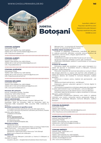 WWW.GHIDULPRIMARIILOR.RO 141Suprafa%u021b%u0103: 4.986 km%u00b2Popula%u021bie: 460.973 locuitoriRe%u0219edin%u021b%u0103 de jude%u021b: Boto%u0219aniPopula%u021bia re%u0219edin%u021bei de jude%u021b: 128.888 locuitoriJUDE%u021aULBoto%u0219aniCOMUNA AD%u0102%u015eENICod po%u0219tal: 717016Telefon: 0231-563100; Fax: 0231-563100; Adresa de e-mail: consiliuladaseni@yahoo.comURL: http://www.adaseni.ro/COMUNA ALBE%u015eTICod po%u0219tal: 717005Telefon: 0231-572140; Fax: 0231-572140; Adresa de e-mail: primaria.albesti@yahoo.comURL: https://albestibt.ro/COMUNA AVR%u0102MENICod po%u0219tal: 717015Telefon: 0231- 563010; Fax: 0231-563133; Adresa de e-mail: primaria_avrameni@yahoo.comURL: https://www.avrameni.ro/COMUNA B%u0102LU%u015eENICod po%u0219tal: 717025Telefon: 0231-515849; Fax: 0231-515849; Adresa de e-mail: primariabaluseni@yahoo.comURL: www.primariabaluseni.roPersoane din primarie:Primar: Gheorghe Claudiu%u00a0%u00a0Doroftei%u00a0Viceprimar: Sorin Mihai%u00a0ChironSecretar General:%u00a0 Leuca Maria%u00a0Aiord%u0103chioaieContabil:%u00a0 Romulus Alexandru%u00a0Loghin%u00a0Sate %u00een administra%u021bie:B%u0103lu%u015feni, Draxini, Z%u0103ice%u015fti, Buzeni, Co%u015fuleni, B%u0103lu%u015feni NoiSuprafa%u021ba:%u00a0 7039 ha; Intravilan:%u00a0 1028 ha; Extravilan:%u00a0 6021 ha; Popula%u021bia:%u00a0 5180; Gospod%u0103rii:%u00a0 1996; Locuin%u021be:%u00a0 1996; Gr%u0103dini%u021be:%u00a0 2; %u0218coli:%u00a04; Activitati economice si specifice zonei:Principala activitate specific%u0103 comunei este agriculturaLa nivelul comunei se practic%u0103 cultivarea porumbului, floarea soarelui, gr%u00e2u, legume Cre%u0219terea animalelorPescuitFirme reprezentative:SC LANDAGRITRANS SRLSC PISCICOLA SRL SC NHR AGROPARTENERS SRLObiective turistice:M%u0103n%u0103stirea ZosinBiserica de lemn din M%u0103n%u0103stirea Zosin cu hramul %u201cAdormirea Maicii Domnului%u201d - monument istoric dat%u00e2nd din 1779Pensiunea %u201cConacul Z%u0103ice%u015fti%u201dM%u0103n%u0103stirea %u201cAdormirea Maicii Domnului%u201d din Z%u0103ice%u015fti Bisericu%u021ba lui Ba%u0219ot%u0103 de la B%u0103lu%u0219eniEvenimente:Zilele comunei B%u0103lu%u0219eni (coincide cu hramul %u00een B%u0103lu%u0219eni %u0219i Zaice%u0219ti) 15 augustCo%u0219uleni, Buzeni %u2013 8 septembrie Nasterea Maicii DomnuluiB%u0103lu%u0219enii Noi %u2013 14 octombrie Sf. ParaschivaDraxini- 8 noiembrie Sf. Mihail %u0219i GavrilFacilit%u00e3%u0163i oferite investitorilor:Punerea la dispozi%u021bia investitorilor suprafe%u021be de terenuri %u00een vederea practic%u0103rii diferitelor activit%u0103%u021bi, precum:turismul de agrement, cultural, istoric, religios, agroturism etcFor%u021ba de munc%u0103 Posibilitatea acord%u0103rii de facilit%u0103%u021bi fiscale (scutiri de taxe)Sprijinirea asigur%u0103rii utilit%u0103%u021bilor (curent, ap%u0103, canalizare) Implicarea autorit%u0103%u021bilor publice %u00een promovarea %u0219i %u00eencurajarea investitorilorProiecte de investi%u0163ii:%u00cenfiin%u021barea re%u021belei de canalizare a apei uzate menajere %u0219i a sta%u021biei de epurare %u00een localit%u0103%u021bile Draxini %u0219i B%u0103lu%u0219eni, Comuna B%u0103lu%u0219eni, Jude%u021bul Boto%u0219ani%u00cenlocuirea corpurilor de iluminat led av%u00e2nd un consum ridicat de energie electric%u0103 cu corpuri de iluminat LED echipate cu sistem de dimare care permit reglarea fluxului luminos la nivelul %u00eentregului obiectiv de investi%u021bii %u00een Comuna B%u0103lu%u0219eni, Jude%u021bul Boto%u0219aniConstruire %u0219i dotare centru medical de permanen%u021b%u0103%u00a0 , sat B%u0103lu%u0219eniRestaurare bisericu%u021b%u0103%u00a0de lemn , sat B%u0103lu%u0219eniElaborarea planului urbanistic general %u00een format digital %u00een comuna B%u0103lu%u0219eniEficientizare energetic%u0103%u00a0%u0219i schimbare destina%u021bie din dispensar %u00een sediu administrativ corp A ,sat B%u0103lu%u0219eni , comuna B%u0103lu%u0219eniModernizare drumuri de interes local %u00een comuna B%u0103lu%u0219eniExtindere re%u021bea de alimentare cu ap%u0103%u00a0%u0219i canalizare %u00een comuna B%u0103lu%u0219eni , jude%u021bul Boto%u0219aniReabilitarea /modernizare /dotarea unei cl%u0103diri %u00een vederea %u00eenfiin%u021b%u0103rii unui centru comunitar pentru persoanele aflate %u00een dificultate %u00een localitatea B%u0103lu%u0219eni, Comuna B%u0103lu%u0219eni, Jude%u021bul Boto%u0219aniCOMUNA BL%u00c2NDE%u015eTICod po%u0219tal: 717371Telefon: 0231-573355; Adresa de e-mail: primaria_blandesti@yahoo.comURL: http://www.comunablandesti.ro/MUNICIPIUL BOTO%u015eANIAdres%u0103: Pia%u0163a Revolu%u0163iei, nr. 1Cod po%u0219tal: 710236Telefon: 0231-502200; Fax: 0231-531595; Adresa de e-mail: primaria@primariabt.roURL: www.primariabt.roCOMUNA BR%u0102E%u015eTIAdres%u0103: Calea . Na%u0163ional%u0103 ,nr 41Cod po%u0219tal: 717035Telefon: 0231-620023; Fax: 0231-620063; Adresa de e-mail: primaria_braesti@yahoo.comconsiliu_braesti@yahoo.comURL: www.comunabraesti.ro