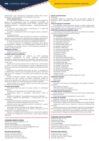 176 / JUDE%u021aUL BR%u0102ILA WWW.GHIDULPRIMARIILOR.ROM%u0103xinenilor%u201d, sub %u00eendrumarea coregrafului Ioni%u021b%u0103%u00a0 Titica, care a participat %u0219i a fost premiat la nenumarate concursuriFirme reprezentative:O mare parte a popula%u021biei active a comunei este angajat%u0103%u00a0la fabrica de %u00eenc%u0103l%u021b%u0103minte care %u00ee%u0219i desf%u0103%u0219oara activitatea %u00een M%u0103xineni (EMMGI PROD;PROFI ROM FOOD ;MALACU MIXT MARKET;ALENICOS MIXTSHOP;VANELI IMPEX;TEHNOLOGIC GRUP,etc.%u00cen comun%u0103%u00a0 sunt dou%u0103%u00a0 parcuri fotovoltaice %u0219i o sta%u021bie de transformare a energiei electriceFunda%u021bia Eurosperanta-C%u0103min de %u00eengrijire pentru persoane v%u00e2rstnice.Produc%u0103tori locali:Numero%u0219i fermieri locali constitui%u021bi %u00een asocia%u021bii %u0219i cooperative agricole, care au men%u021binut %u0219i dezvoltat sistemele de iriga%u021bii pentru a avea randament maxim %u00een exploatarea suprafe%u021belor agricole.%u00cen zona riveran%u0103%u00a0se cultiv%u0103%u00a0orez pe o suprafa%u021b%u0103%u00a0de 2000 ha.%u00cen comuna M%u0103xineni %u00ee%u0219i desf%u0103%u0219oara activitatea dou%u0103%u00a0 fabrici de prelucrare a laptelui, care achizi%u021bioneaz%u0103%u00a0 materia prim%u0103%u00a0 de la cresc%u0103torii de animale locali %u0219i comercializeaz%u0103%u00a0 produsele %u00een%u00a0 jude%u021b%u00a0%u0219i %u00een afara acestuia.Obiective turistice:M%u0103n%u0103stirea M%u0103xineniMuzeul cu specific pesc%u0103rescFacilit%u00e3%u0163i oferite investitorilor:Comuna reprezint%u0103%u00a0 un teritoriu cu %u00eenalt poten%u021bial economic nevalorificat %u00een acest moment, constituind totodat%u0103%u00a0 o important%u0103%u00a0 resurs%u0103%u00a0 de dezvoltare at%u00e2t pentru zona limitrof%u0103%u00a0municipiului Br%u0103ila,c%u00e2t %u0219i pentru regiunea de dezvoltare 2 Sud - Est.Valorificarea acestui poten%u021bial se va realiza %u0219i prin amenajarea %u00een zon%u0103%u00a0a unui parc de activit%u0103%u021bi,care const%u0103%u00a0%u00een dezvoltarea unui teritoriucu o structura func%u021bional%u0103%u00a0complex%u0103: industrial%u0103, agricol%u0103, turistic%u0103Investitorii vor beneficia de scutiri de taxe%u00a0 %u0219i impozite %u00een condi%u021biile legii %u0219i terenul pus la dispozi%u021bie pentru parcul industrial este %u00eenscris %u00een categoria cur%u021bi-construc%u021bii, beneficiind de toate utilit%u0103%u021bileComuna M%u0103xineni (inclusiv zona prevazut%u0103%u00a0 pentru parcul industrial) are ap%u0103%u00a0 curent%u0103%u00a0 cu sistem centralizat, av%u00e2nd ca surs%u0103%u00a0 ap%u0103%u00a0 supterana de ad%u00e2ncime, iar localitatea M%u0103xineni are re%u021bea de canalizare %u0219i o sta%u021bie de epurare a apelor reziduale.Comuna este %u00eentr-o asociere al%u0103turi de comunele %u00eenvecinate, %u00een vederea aduc%u021biunii de gazeProiecte de investi%u0163ii:Amenajare teren de sport cu gazon sintetic %u00een localitatea M%u0103xineni%u00cenfiin%u021bare zon%u0103%u00a0de agreement %u00een localitatea M%u0103xineniModernizare str%u0103zi %u00een localit%u0103%u021bile Latinu,Corbu Vechi %u0219i M%u0103xineniPlatforme ecologice %u00een localitatile Corbu Nous %u0219i M%u0103xineniProiect regional de dezvoltare a infrastructurii de ap%u0103cofinan%u021bareModernizare trotuare %u0219i accese auto tronson III M%u0103xineniCre%u0219tere eficientizare energetic%u0103%u00a0la %u0219cola Latinu%u00cenfiin%u021bare centru de colectare selective a de%u0219eurilor cu aport voluntar %u00een comuna M%u0103xineniAmenajare piste de biciclete %u00een localitatea Corbu NouAmenajare %u0219i %u00eemprejmuire teren pentru %u00eenfiin%u021bare zon%u0103%u00a0 de agreement %u00een localitatea M%u0103xineniDotare cu mobilier,material didactice %u0219i echipamente digitale a unit%u0103%u021bilor de %u00eenv%u0103%u021b%u0103m%u00e2nt preuniversitar Liceul Matei Basarab M%u0103xineniCOMUNA MIRCEA VODAAdres%u0103: Str. Mircea cel B%u0103tr%u00e2n, nr. 41Cod po%u0219tal: 817095Telefon: 0239-669583; Fax: 0239-669584; Adresa de e-mail: primaria.mirceavoda@yahoo.comURL: www.primariamirceavoda.roPersoane din primarie:Primar: Alexandru MosescuViceprimar:%u00a0Romic%u0103%u00a0Popa%u00a0Secretar General: Silvia Fra%u0163il%u0103Contabilitate : Firm%u0103%u00a0externalizat%u0103Sate %u00een administra%u021bie:Dedule%u0219tiSuprafa%u021ba:%u00a0 10849 ha; Intravilan:%u00a0 450 ha; Extravilan:%u00a0 10399 ha; Popula%u021bia:%u00a0 3300; Gospod%u0103rii:%u00a0 1553; Locuin%u021be:%u00a0 1450; Gr%u0103dini%u021be:%u00a0 2; %u0218coli:%u00a03; Cum se ajunge in localitate:%u00cen localitatea noastr%u0103%u00a0se poate ajunge cu trenul, av%u00e2nd gara CFR Dedule%u0219ti sau cu ma%u0219ina pe drumul na%u021bional DN2B, %u00eentre satul Filipe%u0219ti( la 2 km) %u0219i ora%u0219ul lanca( la 7 km)Activitati economice si specifice zonei:Activitatea principal%u0103%u00a0este agricultura %u0219i cre%u0219terea animalelor. Precum %u0219i comer%u021b%u00a0cu%u00a0 amanuntul %u0219i servicii.Firme reprezentative: SC ROMINSEM SRLSC INIZIATIVA AGRICOLA SRLSC PROMOTOR IMOBILIARE SRLSC CRUCIANI IMPEX SRLSC AGRIDED COM SRLSC MITEDOMAR IMPEX SRLSC SORDEL TRANS SRLSC RIFSOL IMPEX SRLSC MIOFAN AGROTRANS SRLSC MATEUROLAND SRLVACAROIU COSTINProduc%u0103tori locali:SC ROMINSEM SRLSC INIZIATIVA AGRICOLA SRLSC PROMOTOR IMOBILIARE SRLSC CRUCIANI IMPEX SRLCAGRIDED COM SRLSC MITEDOMAR IMPEX SRLSC SORDEL TRANS SRLSC RIFSOL IMPEX SRLSC MIOFAN AGROTRANS SRLSC MATEUROLAND SRLVACAROIU COSTINProduse locale: Cereale, lactate,miere de albine, legume, fructe.Obiective turistice:Muzeul SatuluiR%u00e2ul Buz%u0103uEvenimente:Festivalul Florii (Concurs interjude%u021bean de c%u00e2ntece %u0219i dansuri populare)Ziua copilului (1 Iunie)Zilele Comunei (15-16 August)Ziua %u0218colii ( Sf%u00e2ntul Dimitrie cel Nou)Facilit%u00e3%u0163i oferite investitorilor:Concesionare %u0219i %u00eenchiriere teren intravilan pentru dezvoltarea mediului de afaceri
