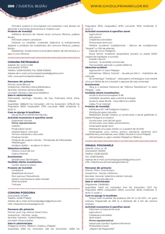 200 / JUDE%u021aUL BUZ%u0102U WWW.GHIDULPRIMARIILOR.ROPrim%u0103ria sus%u021bine %u0219i %u00eencurajeaz%u0103 noi investitori care doresc s%u0103 dezvolte o activitate economic%u0103 %u00een mediul ruralProiecte de investi%u0163ii:Asfaltare drumuri de interes local, comuna P%u00e2rscov, jude%u021bul Buz%u0103u%u00cenfiin%u021bare sistem canalizareDotarea cu mobilier, materiale didactice %u0219i echipamente digitale a unit%u0103%u021bilor de %u00eenv%u0103%u021b%u0103m%u00e2nt din comuna P%u00e2rscov, jude%u021bul Buz%u0103uReabilitare, modernizare %u0219i extindere sistem de alimentare cu apa %u00een com P%u00e2rscovCOMUNA PIETROASELEAdres%u0103: Str. Unirii nr.89Cod po%u0219tal: 127470Telefon: 0238-512000; Fax: 0238-512000; Adresa de e-mail: primariapietroasele@yahoo.comURL: www.primariapietroasele.roPersoane din primarie:Primar: Ionel B%u0103nic%u0103Viceprimar: Daniela Liliana B%u00e2rl%u0103ceanu%u00a0Secretar General: Adriana BadeaContabil: Z%u0103inescu Mariana M%u0103d%u0103linaSate %u00een administra%u021bie:Pietroasele, %u0218ar%u00e2nga, Clondiru de Sus, Pietroasa Mic%u0103, Dara, C%u00e2l%u021be%u0219tiSuprafa%u021ba:%u00a0 5586,03 ha; Intravilan:%u00a0 410 ha; Extravilan:%u00a0 5176,03 ha; Popula%u021bia:%u00a0 2803; Gospod%u0103rii:%u00a0 1279; Locuin%u021be:%u00a0 1828; Gr%u0103dini%u021be:%u00a0 2; %u0218coli:%u00a02; Cum se ajunge in localitate:De pe drumul DN1B Mizil-Buz%u0103u.Activitati economice si specifice zonei:Exploata%u021bii viticoleFirme reprezentative:USAMVProduc%u0103tori locali:Vasilic%u0103 Ro%u0219ca- viticultorTomoiu Alexandru-vitocultorProduse locale:Produse de origine viticola %u2013 T%u0103m%u00e2ioasa de PietroaseleMe%u0219te%u0219ugari: Istr%u0103%u021boiu %u0218tefan %u2013 sculpturi %u00een lemn.Obiective turistice:Clo%u0219ca cu puii de aurCastrul RomanEvenimente:S%u0103rb%u0103toarea T%u0103m%u00e2ioaseiFacilit%u00e3%u0163i oferite investitorilor:Turism istoric %u0219i viticolProiecte de investi%u0163ii:CanalizareReabilitare drumuriParc panouri fotovoltaiceSistem monitorizare video-stradalPiste bicicleteTrotuareCOMUNA PODGORIACod po%u0219tal: 127480Telefon: 0238-774923; Adresa de e-mail: primariapodgoria@yahoo.comURL: https://comunapodgoria.ro/Persoane din primarie:Primar: prof. ing. Marius Viorel%u00a0Chiru%u00a0Viceprimar:%u00a0 Damian%u00a0%u00a0Iorga%u00a0Secretar General:%u00a0 Violeta%u00a0R%u0103peanu%u00a0Contabil: Mioara%u00a0%u015etefanSate %u00een administra%u021bie:Podgoria, Oratia, T%u0103b%u0103cari, Co%u0163atcu, Ple%u015fe%u015ftiSuprafa%u021ba:%u00a0 5160 ha; Intravilan:%u00a0 322 ha; Extravilan:%u00a0 4838 ha; Popula%u021bia:%u00a0 3374; Gospod%u0103rii:%u00a0 1670; Locuin%u021be:%u00a0 1670; Gr%u0103dini%u021be:%u00a0 3; %u0218coli:%u00a03; Activitati economice si specifice zonei:Agricultur%u0103Viticultur%u0103Cre%u015fterea animalelorPrelucrarea lemnuluiPiel%u0103rie (confec%u0163ii %u00eenc%u0103l%u0163%u0103minte) - fabrica de %u00eenc%u0103l%u0163%u0103minte %u201cMopiel%u201d cu 100 de salaria%u0163iCasa de vinuri PodgoriaDou%u0103 ferme moderne proprietate privat%u0103 cu peste 5000 capete de %u00eengr%u0103%u015fare a suinelorPrest%u0103ri serviciiComer%u0163 - 15 societ%u0103%u0163i comercialeTrei societ%u0103%u0163i agricole cu peste 2000 haObiective turistice:Agroturism %u00een satul Ple%u015fe%u015ftiM%u0103n%u0103stirea %u201cSf%u00e2nta Treime%u201d - situat%u0103 pe DN 2 - m%u0103n%u0103stire de m%u0103icu%u0163eSit arheologic %u201cCet%u0103%u0163uia%u201d - descoperiri arheologice care atest%u0103 c%u0103 acum 8000 de ani a existat o a%u015fezare de vie%u0163i omene%u015ftiEvenimente:T%u00e2rg %u015fi o serbare folcloric%u0103 de %u201cSf%u00e2ntul Pantelimon%u201d %u00een satul Ple%u015fe%u015fti - iulieFacilit%u00e3%u0163i oferite investitorilor:Acces la drumul european E 85Utilit%u0103%u0163ile necesare: ap%u0103 curent%u0103 %u015fi energieAcces la calea ferat%u0103 - Gara R%u00e2mnicu S%u0103ratCablu TV %u015fi internetProiecte de investi%u0163ii:Asfaltarea DC 148 Podgoria-Co%u0163atcuDistribu%u0163ie gaze naturaleReabilitare %u015fcoal%u0103 Co%u0163atcu %u015fi construirea a dou%u0103 gr%u0103dini%u0163e %u00een satele Podgoria %u015fi Co%u0163atcu%u00a0 Construirea unei s%u0103li de sportConstruirea unui sediu administrativAmenajare spa%u0163ii verziRealizarea unui parc eolian cu o putere de 45 MWAmenajarea unui centru pentru persoane v%u00e2rstnice prin reabilitarea %u015fi extinderea unei cl%u0103diri situate %u00een satul Ple%u015fe%u015ftiAlimentarea cu ap%u0103 a satelor Ple%u015fe%u015fti %u015fi T%u0103b%u0103cariORA%u0218UL POGOANELEAdres%u0103: Unirii, nr. 18Cod po%u0219tal: 125200Telefon: 0238-552123; Fax: 0238-552165; Adresa de e-mail: primariepogoanele@yahoo.comURL: http://www.primariepogoanele.ro/Persoane din primarie:Primar:%u00a0Florin%u00a0%u00a0Dumitra%u015fcuViceprimar%u00a0:%u00a0Marian%u00a0C%u0103z%u0103noiuSecretar General:%u00a0Valentino Adrian%u00a0Cotru%u0163%u0103Contabil:%u00a0Cornelia%u00a0B%u0103nic%u0103%u00a0%u00a0Sate %u00een administra%u021bie:Pogoanele, C%u0103ld%u0103r%u0103%u015ftiSuprafa%u021ba:%u00a0 12415 ha; Intravilan:%u00a0 244 ha; Extravilan:%u00a0 12171 ha; Popula%u021bia:%u00a0 6870; Gospod%u0103rii:%u00a0 2940; Locuin%u021be:%u00a0 2940; Gr%u0103dini%u021be:%u00a0 3; %u0218coli:%u00a03; Licee:%u00a01; Cum se ajunge in localitate:Ora%u0219ul este traversat de %u0219oseaua DN 2C %u0219i DJ 203 I, iar gara ora%u0219ului Pogoanele se afl%u0103 la o distan%u021b%u0103 de 3 km de centrul ora%u0219ului.Activitati economice si specifice zonei:Fabricare componente autoAgriculturaCre%u0219terea animalelorSere-solariiFirme reprezentative:Advanced Comfort Systems RomaniaProduc%u0103tori locali:,,Pepeni de Pogoanele%u201d