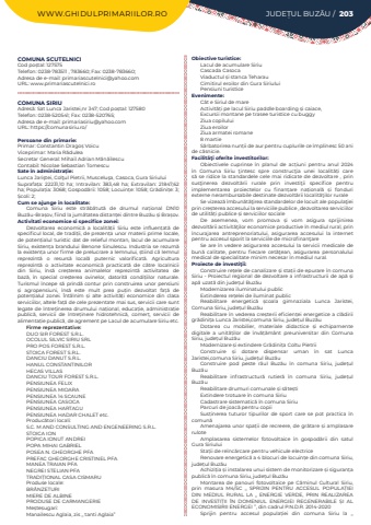 WWW.GHIDULPRIMARIILOR.RO JUDE%u021aUL BUZ%u0102U / 203COMUNA SCUTELNICICod po%u0219tal: 127575Telefon: 0238-783511 , 783660; Fax: 0238-783660; Adresa de e-mail: primariascutelnici@yahoo.comURL: www.primariascutelnici.roCOMUNA SIRIUAdres%u0103: Sat Lunca Jaristei,nr 347; Cod po%u0219tal: 127580Telefon: 0238-520541; Fax: 0238-520765; Adresa de e-mail: primariasiriu@yahoo.comURL: https://comunasiriu.ro/Persoane din primarie:Primar: Constantin Drago%u0219 VoicuViceprimar: Maria R%u0103duleaSecretar General: Mihail Adrian M%u0103n%u0103ilescuContabil: Nicolae Sebastian TomescuSate %u00een administra%u021bie:Lunca Jari%u015ftei, Col%u0163ul Pietrii, Muscelu%u015fa, Casoca, Gura SiriuluiSuprafa%u021ba:%u00a0 22231,10 ha; Intravilan:%u00a0 383,48 ha; Extravilan:%u00a0 21847,62 ha; Popula%u021bia:%u00a03068; Gospod%u0103rii:%u00a01058; Locuin%u021be:%u00a01058; Gr%u0103dini%u021be:%u00a03; %u0218coli:%u00a02; Cum se ajunge in localitate:Comuna Siriu este str%u0103b%u0103tut%u0103%u00a0 de drumul na%u021bional DN10 Buz%u0103u-Bra%u0219ov, fiind la jum%u0103tatea distan%u021bei dintre Buz%u0103u %u0219i Bra%u0219ov.Activitati economice si specifice zonei:Dezvoltarea economic%u0103 a localit%u0103%u021bii Siriu este influen%u021bat%u0103 de specificul local, de tradi%u021bii, de prezen%u021ba unor materii prime locale, de poten%u021bialul turistic dat de relieful montan, lacul de acumulare Siriu, existen%u021ba brandului Benone Sinulescu. Industria se rezum%u0103 la existen%u021ba unor firme de prelucrare a lemnului, %u0219tiind c%u0103 lemnul reprezint%u0103 o resurs%u0103 local%u0103 puternic valorificat%u0103. Agricultura reprezint%u0103 o activitate economic%u0103 practicat%u0103 de c%u0103tre localnicii din Siriu, %u00eens%u0103 cre%u0219terea animalelor reprezint%u0103 activitatea de baz%u0103, %u00een special cre%u0219terea ovinelor, datorit%u0103 condi%u021biilor naturale. Turismul %u00eencepe s%u0103 prind%u0103 contur prin construirea unor pensiuni %u0219i agropensiuni, %u00eens%u0103 este mult prea pu%u021bin dezvoltat fa%u021b%u0103 de poten%u021bialul zonei. %u00cent%u00e2lnim %u0219i alte activit%u0103%u021bi economice din clasa serviciilor, altele fa%u021b%u0103 de cele prezentate mai sus, servicii care sunt legate de %u00eentre%u021binerea drumului na%u021bional, educa%u021bie, administra%u021bie public%u0103, servicii de %u00eentre%u021binere hidrotehnic%u0103, comer%u021b, servicii de alimenta%u021bie public%u0103, de agrement pe Lacul de acumulare Siriu etc.Firme reprezentative:DUO SIR FOREST S.R.L.OCOLUL SILVIC SIRIU SRLPRO POS FOREST S.R.L.STOICA FOREST S.R.L.DANCIU DANUT S.R.L.HANUL CONSTANTINILORHECAS VILLASDANCIU TOUR FOREST S.R.L.PENSIUNEA FELIXPENSIUNEA MIOARAPENSIUNEA 14 SCAUNEPENSIUNEA CASOCAPENSIUNEA HARTAGUPENSIUNEA HADAR CHALET etc.Produc%u0103tori locali:S.C. M AND CONSULTING AND ENGENEERING S.R.L.STOICA IONPOPICA IONUT ANDREIPOPA MIHAI GABRIELPOSEA N. GHEORGHE PFAPREFAC GHEORGHE CRISTINEL PFAMANEA TRAIAN PFANEGREI STELIAN PFATRADI%u021aIONAL CASA CISMARUProduse locale:BR%u00c2NZETURIMIERE DE ALBINEPRODUSE DE CARMANGERIEMe%u0219te%u0219ugari: Manailescu Aglaia, zis ,, tanti Aglaia%u201dObiective turistice:Lacul de acumulare SiriuCascada CasocaViaductul %u0219i stanca TeharauCimitirul eroilor din Gura Siriului Pensiuni turisticeEvenimente:C%u00e2t e Siriul de mareActivit%u0103%u021bi pe lacul Siriu paddle boarding %u0219i caiace,Excursii montane pe trasee turistice cu buggyZiua copiluluiZiua eroilorZiua armatei romane8 martieS%u0103rbatorirea nun%u021bii de aur pentru cuplurile ce %u00eemplinesc 50 ani de c%u0103snicie.Facilit%u00e3%u0163i oferite investitorilor:Obiectivele cuprinse %u00een planul de ac%u021biuni pentru anul 2024 %u00een Comuna Siriu %u0163intesc spre construc%u0163ia unei localit%u0103%u021bi care s%u0103 se ridice la standardele cele mai ridicate de dezvoltare , prin sus%u0163inerea dezvolt%u0103rii rurale prin investi%u0163ii specifice pentru implementarea proiectelor cu finan%u021bare na%u021bional%u0103 %u0219i fonduri externe nerambursabile destinate dezvolt%u0103rii localit%u0103%u0163ilor ruraleSe vizeaz%u0103 %u00eembun%u0103t%u0103%u0163irea standardelor de locuit ale popula%u0163iei prin cre%u0219terea accesului la serviciile publice , dezvoltarea serviciilor de utilit%u0103%u021bi publice %u0219i serviciilor socialeDe asemenea, vom promova %u0219i vom asigura sprijinirea dezvolt%u0103rii activit%u0103%u0163ilor economice productive %u00een mediul rural, prin %u00eencurajarea antreprenoriatului, asigurarea accesului la internet pentru accesul sporit la serviciile de microfinan%u0163are Se are %u00een vedere asigurarea accesului la servicii medicale de bun%u0103 calitate, pentru fiecare cet%u0103%u0163ean, asigurarea personalului medical de specialitate minim necesar %u00een mediul rural.Proiecte de investi%u0163ii:Construire re%u021bele de canalizare %u0219i sta%u021bii de epurare %u00een comuna Siriu - Proiectul regional de dezvoltare a infrastructurii de ap%u0103%u00a0%u0219i ap%u0103%u00a0uzat%u0103%u00a0din jude%u021bul Buz%u0103uModernizarea iluminatului publicExtinderea re%u021belei de iluminat publicReabilitare energetic%u0103%u00a0 %u0219coala gimnaziala Lunca Jaristei, Comuna Siriu, jude%u021bul Buz%u0103uReabilitare %u00een vederea cre%u0219terii eficien%u021bei energetice a cl%u0103dirii gr%u0103dini%u021ba Lunca Jaristei,comuna Siriu, jude%u021bul Buz%u0103uDotarea cu mobilier, materiale didactice %u0219i echipamente digitale a unit%u0103%u021bilor de %u00eenv%u0103%u021b%u0103m%u00e2nt preuniversitar din Comuna Siriu, jude%u021bul Buz%u0103uModernizare %u0219i extindere Gr%u0103dini%u021ba Coltu PietriiConstruire %u0219i dotare dispensar uman %u00een sat Lunca Jaristei,comuna Siriu, jude%u021bul Buz%u0103uConstruire pod peste r%u00e2ul Buz%u0103u %u00een comuna Siriu, jude%u021bul Buz%u0103uReabilitare infrastructur%u0103%u00a0 rutier%u0103%u00a0 %u00een comuna Siriu, jude%u021bul Buz%u0103uReabilitare drumuri comunale %u0219i s