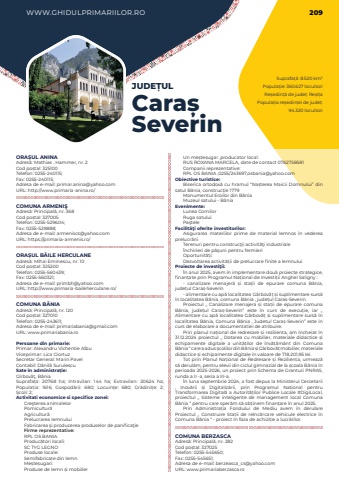 WWW.GHIDULPRIMARIILOR.RO 209Suprafa%u021b%u0103: 8.520 km%u00b2Popula%u021bie: 360.627 locuitoriRe%u0219edin%u021b%u0103 de jude%u021b: Re%u0219i%u021baPopula%u021bia re%u0219edin%u021bei de jude%u021b: 94.320 locuitoriJUDE%u021aULCara%u0219SeverinORA%u0218UL ANINAAdres%u0103: Mathias . Hammer, nr. 2Cod po%u0219tal: 325100Telefon: 0255-240115; Fax: 0255-240115; Adresa de e-mail: primar.anina@yahoo.comURL: http://www.primaria-anina.ro/COMUNA ARMENI%u015eAdres%u0103: Principal%u0103, nr. 368Cod po%u0219tal: 327005Telefon: 0255-529604; Fax: 0255-529888; Adresa de e-mail: armeniscs@yahoo.comURL: https://primaria-armenis.ro/ORA%u0218UL B%u0102ILE HERCULANEAdres%u0103: Mihai Eminescu, nr. 10Cod po%u0219tal: 325200Telefon: 0255-560439; Fax: 0255-560321; Adresa de e-mail: primbh@yahoo.comURL: http://www.primaria-baileherculane.ro/COMUNA B%u0102NIAAdres%u0103: Principal%u0103, nr. 120Cod po%u0219tal: 327010Telefon: 0255-243611; Adresa de e-mail: primariabania@gmail.comURL: www.primariabania.roPersoane din primarie:Primar: Alexandru Vichentie AlbuViceprimar: Lica CiortuzSecretar General: Marin PavelContabil: D%u0103nil%u0103 SurulescuSate %u00een administra%u021bie:G%u00eerbov%u0103%u0163, B%u0103niaSuprafa%u021ba:%u00a0 20768 ha; Intravilan:%u00a0 144 ha; Extravilan:%u00a0 20624 ha; Popula%u021bia:%u00a0 1616; Gospod%u0103rii:%u00a0 680; Locuin%u021be:%u00a0 680; Gr%u0103dini%u021be:%u00a0 2; %u0218coli:%u00a02; Activitati economice si specifice zonei:Cre%u015fterea animalelorPomicultur%u0103Agricultur%u0103Prelucrarea lemnului Fabricarea %u015fi producerea produselor de panifica%u0163ieFirme reprezentative:RPL OS BANIAProduc%u0103tori locali:SC TYG LEGNOProduse locale:Semifabricate din lemnMe%u0219te%u0219ugari:Produse de lemn %u0219i mobilierUn me%u0219te%u0219ugar ,producator local: RUS ROXANA MARCELA, date de contact 0762758581Companii reprezentative: RPL OS BANIA ,0255/243697,osbania@yahoo.comObiective turistice:Biserica ortodox%u0103 cu hramul %u201cNa%u0219terea Maicii Domnului%u201d din satul B%u0103nia, construc%u021bie 1779Monumentul Eroilor din B%u0103nia Muzeul satului - B%u0103niaEvenimente:Lunea CornilorRuga satului Pa%u015fteleFacilit%u00e3%u0163i oferite investitorilor:Asigurarea materiilor prime de material lemnos %u00een vederea prelucr%u0103riiTerenuri pentru construc%u0163ii activit%u0103%u0163i industriale%u00cenchirieri de p%u0103%u015funi pentru fermieriOportunit%u0103%u021bi:Dezvoltarea activit%u0103%u021bii de prelucrare finite a lemnuluiProiecte de investi%u0163ii:%u00cen anul 2025, avem %u00een implementare dou%u0103%u00a0proiecte strategice, finan%u021bate prin Programul Na%u021bional de Investi%u021bii Anghel Saligny :-%u00a0 canalizare menajer%u0103 %u0219i sta%u021bii de epurare comuna B%u0103nia, jude%u021bul Cara%u0219-Severin-%u00a0alimentare cu ap%u0103 localitatea G%u00e2rbov%u0103%u021b %u0219i suplimentare surs%u0103 %u00een localitatea B%u0103nia, comuna B%u0103nia , jude%u021bul Cara%u0219-Severin.Proiectul ,, Canalizare menajera %u0219i sta%u021bii de epurare comuna B%u0103nia, jude%u021bul Cara%u0219-Severin%u201d este %u00een curs de execu%u021bie, iar ,, Alimentare cu ap%u0103 localitatea G%u00e2rbov%u0103%u021b %u0219i suplimentare surs%u0103 %u00een localitatea B%u0103nia, Comuna B%u0103nia , Judetul Cara%u0219-Severin%u201d este %u00een curs de elaborare a documentatiei de atribuire.Prin planul na%u021bional de redresare %u0219i rezilienta, am %u00eencheiat %u00een 31.12.2024 proiectul ,, Dotarea cu mobilier, materiale didactice %u0219i echipamente digitale a unit%u0103%u021bilor de %u00eenv%u0103%u021b%u0103m%u00e2nt din Comuna B%u0103nia %u201c care a adus %u0219colilor din B%u0103nia %u0219i G%u00e2rbov%u0103%u021b mobilier, materiale didactice %u0219i echipamente digitale %u00een valoare de 718.201,95 lei.Tot prin Planul Na%u021bional de Redresare %u0219i Rezilienta, urmeaz%u0103 s%u0103 derul%u0103m, pentru elevii din ciclul gimnazial de la %u0219coala B%u0103nia %u00een perioada 2025-2026, un proiect prin Schema de Granturi PNRAS, runda a II -a, seria a III-a.%u00cen luna septembrie 2024, a fost depus la Ministerul Cercetarii , Inov%u0103rii %u0219i Digitaliz%u0103rii, prin Programul Na%u021bional pentru Transformarea Digital%u0103 a Autorit%u0103%u021bilor Publice Locale #DigiLocal, proiectul ,, Sisteme inteligente de management local Comuna B%u0103nia %u201c pentru care sper%u0103m s%u0103%u00a0ob%u021binem finan%u021bare %u00een anul 2025.Prin Administra%u021bia Fondului de Mediu avem %u00een derulare Proiectul ,, Construire Sta%u021bii de re%u00eenc%u0103rcare vehicule electrice %u00een Comuna B%u0103nia %u201c - proiect %u00een faza de achizi%u021bie a lucr%u0103rilor.COMUNA BERZASCAAdres%u0103: Principal%u0103, nr. 282Cod po%u0219tal: 327025Telefon: 0255-545650; Fax: 0255-545651; Adresa de e-mail: berzeasca_cs@yahoo.comURL: www.primariaberzasca.ro