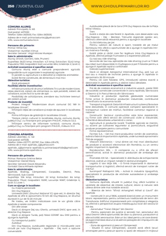 250 / JUDE%u021aUL CLUJ WWW.GHIDULPRIMARIILOR.ROCOMUNA ALUNI%u015eAdres%u0103: Principal%u0103, nr. 83Cod po%u0219tal: 407030Telefon: 0264-263505; Fax: 0264-263505; Adresa de e-mail: primariaaluniscj@yahoo.comURL: www.comunaalunis.roPersoane din primarie:Primar: Mihai SavViceprimar: Aurelian Irimu%u0219Secretar General : Virgil-Mircea Mure%u015fanSate %u00een administra%u021bie:Aluni%u015f, Ghirolt, Corneni, Vale, PruneniSuprafa%u021ba:%u00a056,53 kmp; Intravilan:%u00a04,11 kmp; Extravilan:%u00a052,42 kmp; Popula%u021bia:%u00a01190; Gospod%u0103rii:%u00a0542; Locuin%u021be:%u00a0694; Gr%u0103dini%u021be:%u00a02; %u0218coli:%u00a02; Activitati economice si specifice zonei:Comuna Aluni%u015f este o comun%u0103 preponderent agricol%u0103. Gospod%u0103riile sunt organizate %u00een exploata%u0163ii agricole.%u00cen paralel cu agricultura s-a dezvoltat %u015fi cre%u015fterea animalelor.Exist%u0103 ferme constituite, de dimensiuni mai miciObiective turistice:Zon%u0103 pitoreasc%u0103Facilit%u00e3%u0163i oferite investitorilor:Infrastructura bun%u0103: drumuri asfaltate / %u00een curs de modernizare, re%u0163ea electric%u0103, sistem de alimentare cu ap%u0103 potabil%u0103, sistem de canalizare, acces facil la surse de ap%u0103Posibilit%u0103%u0163i de achizi%u0163ionare, arendare sau %u00eenchiriere terenuri din sistem privatProiecte de investi%u0163ii:Proiect integrat %u201cModernizare drum comunal DC 169 %u00een localitatea Ghirolt%u201d,%u00a0%u00cenfiin%u0163are re%u0163ea de canalizare %u015fi sta%u0163ie de epurare %u00een localitatea Aluni%u015f,Prima %u00eenfiin%u0163are de gr%u0103dini%u0163%u0103 %u00een localitatea Ghirolt,%u201cDotare c%u0103min cultural %u00een localitatea Aluni%u015f, comuna Aluni%u015f, jude%u0163ul Cluj%u201d, cu finan%u0163are prin program P.N.D.R., m%u0103sura 3.2.2.%u00a0%u00cenfiin%u0163are centru de informare turistic%u0103, comuna Aluni%u015f, jude%u0163ul Cluj, cu finan%u0163are prin program P.N.D.R., m%u0103sura 3.1.3COMUNA APAHIDAAdres%u0103: Libert%u0103%u0163ii, nr. 122Cod po%u0219tal: 407035Telefon: 0264-231777, 231797; Fax: 0264-231475; Adresa de e-mail: apahida_cj@yahoo.comapahida_cj@primaria-apahida.ro, primariaapahida@gmail.comURL: www.primaria-apahida.roPersoane din primarie:Primar: Ramona Cristina Belce%u00a0Viceprimar: Daniel Mari%u015f%u00a0Secretar General: David AlexandruContabil: Dana Mihaela A%u015ftileanSate %u00een administra%u021bie:Apahida, Bodrog, C%u00e2mpene%u0219ti, Corpadea, Dezmir, Pata, S%u00e2nnicoar%u0103, Sub Coast%u0103Suprafa%u021ba:%u00a0 106 kmp; Intravilan:%u00a0 22 kmp; Extravilan:%u00a0 84 kmp; Popula%u021bia:%u00a0 17442; Gospod%u0103rii:%u00a0 10291; Locuin%u021be:%u00a0 9067; Gr%u0103dini%u021be:%u00a0 5; %u0218coli:%u00a03; Licee:%u00a01; Cum se ajunge in localitate:Cu ma%u0219ina personal%u0103:Din Cluj-Napoca:Urmeaz%u0103 DN1C (Drumul Na%u021bional 1C) spre est, %u00een direc%u021bia Dej. Apahida se afl%u0103 la aproximativ 10 km de Cluj-Napoca, iar drumul dureaz%u0103 %u00een jur de 15-20 minutePe traseu, vei %u00eent%u00e2lni indicatoare care te vor ghida c%u0103tre Apahida %u0219i satele componenteDin alte ora%u0219e:Dac%u0103 vii dinspre Dej sau Gherla, urmeaz%u0103 DN1C spre vest, %u00een direc%u021bia Cluj-NapocaDac%u0103 vii dinspre Turda, po%u021bi folosi DJ109F sau DN1 pentru a ajunge la ApahidaCu transportul public:Autobuz:Din Cluj-Napoca, autobuzele regionale %u0219i microbuzele care circul%u0103 pe ruta Cluj-Napoca %u2013 Apahida %u2013 Dej sunt o op%u021biune convenabil%u0103Autobuzele pleac%u0103 de la Gara CFR Cluj-Napoca sau de la Pia%u021ba Mihai ViteazuTren:Exist%u0103 o sta%u021bie de cale ferat%u0103 %u00een Apahida, care deserve%u0219te ruta Cluj-Napoca %u2013 Dej %u2013 Beclean. Trenurile regionale opresc aici, oferind o alternativ%u0103 relaxant%u0103 pentru a ajunge %u00een localitateCu bicicleta sau pe jos:Pentru iubitorii de natur%u0103 %u0219i sport, traseele de pe malul Some%u0219ului Mic ofer%u0103 o oportunitate de a ajunge %u00een Apahida %u00eentrun mod eco-friendlyExist%u0103 piste %u0219i c%u0103r%u0103ri care fac leg%u0103tura %u00eentre Cluj-Napoca %u0219i Apahida, oferind peisaje frumoase %u0219i o experien%u021b%u0103 pl%u0103cut%u0103Cu taxi sau ride-sharing:Serviciile de taxi sau aplica%u021biile de ride-sharing (cum ar fi Bolt sau Uber) sunt disponibile %u00een ClujNapoca %u0219i pot fi folosite pentru a ajunge %u00een Apahida rapid %u0219i confortabilIndica%u021bii suplimentare:Dac%u0103 vii dinspre Aeroportul Interna%u021bional Cluj, po%u021bi lua un taxi sau o ma%u0219in%u0103 de %u00eenchiriat pentru a ajunge %u00een Apahida %u00een aproximativ 25-30 minutePentru cei care folosesc GPS, introduce%u021bi adresa exact%u0103 a destina%u021biei %u00een Apahida pentru a ob%u021bine indicii detaliate.Activitati economice si specifice zonei:Pol de de cre%u0219tere economic%u0103 %u0219i industrie u%u0219oar%u0103 , peste 1300 de societ%u0103%u021bi comerciale concentrate %u00een zona Apahida, S%u00e2nnicoara %u0219i Dezmir %u0219i %u00een Parcul Nervia din S%u00e2nnicoaraIndustrie %u0219i produc%u021bie: Apahida g%u0103zduie%u0219te numeroase firme active %u00een domeniul produc%u021biei industriale, contribuind semnificativ la economia local%u0103Transport %u0219i logistic%u0103: Datorit%u0103 infrastructurii rutiere %u0219i feroviare bine dezvoltate, %u00een comun%u0103 opereaz%u0103 companii specializate %u00een transporturi rutiere de m%u0103rfuri, facilit%u00e2nd comer%u021bul regional %u0219i na%u021bionalConstruc%u021bii: Sectorul construc%u021biilor este bine reprezentat, cu firme care ofer%u0103 servicii de construc%u021bii civile %u0219i industriale, reflect%u00e2nd dezvoltarea urbanistic%u0103 a zonei.Agricultur%u0103 %u0219i produc%u021bie local%u0103: Tradi%u021biile agricole se men%u021bin, cu accent pe cultivarea legumelor %u0219i pomicultur%u0103, asigur%u00e2nd produse proaspete pentru comunitateFirme reprezentative:Farmec S.A. %u2013 Cel mai mare produc%u010