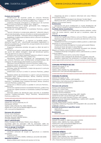 270 / JUDE%u021aUL CLUJ WWW.GHIDULPRIMARIILOR.ROProiecte de investi%u0163ii:Infrastructurii%u00a0 de iluminat public %u00een comuna Panticeu jude%u021bul%u00a0 Cluj- Cre%u0219terea eficien%u021bei energetice a infrastructurii de iluminat public %u00een comuna Panticeu jude%u021bul%u00a0Cluj %u2013 etapa ICre%u0219terea eficien%u021bei energetice a infrastructurii de iluminat public %u00een comuna Panticeu, jude%u021bul Cluj%u00a0%u2013 etapa IIReabilitare termic%u0103 la %u0219coala gimnaziala Iuliu Ha%u021bieganu, localitatea Panticeu, jude%u021bul ClujConstruire complex sportiv %u00een localitatea Panticeu, jude%u021bul Cluj%u201dServicii climatice %u0219i conservarea p%u0103durilor%u201d, aferent%u0103 m%u0103surii. %u201eservicii de silvomediu, servicii climatice %u0219i conservarea p%u0103durilor%u201dServicii de s%u0103n%u0103tate %u2013 %u00eenfiin%u021bare centrul integrat PanticeuReabilitare, modernizare %u0219i dotare c%u0103min cultural %u00een localitatea Panticeu, jude%u021bul ClujDigirural - prioritatea 2 - o regiune cu localit%u0103%u021bi smart - obiectivul specific a(II) - valorificarea avantajelor digitaliz%u0103rii, %u00een beneficiul cet%u0103%u021benilor, al companiilor, al organiza%u021biilor de cercetare %u0219i al autorit%u0103%u021bilor publice Programul reducerea emisiilor de gaze cu efect de ser%u0103 %u00een transporturiInfrastructurii pentru vehiculele de transport rutier nepoluant din punct de vedere energetic: sta%u0163ii de re%u00eenc%u0103rcare pentru vehicule electrice %u00een comuna PanticeuAchizi%u021bia unui microbuz nepoluant (electric) utilizat %u00een scopuri comunitare %u00een comuna Panticeu, jude%u021bul ClujDezvoltarea sistemelor inteligente de management local din comuna Panticeu, prin achizi%u021bionarea echipamentelor din categoria TIC (tehnologia informa%u021biilor %u0219i comunica%u021biilor)A%u0219ternere mixtur%u0103%u00a0asfaltic%u0103, comuna Panticeu, jude%u021bul ClujRealizare sistem de alimentare cu ap%u0103 %u00een comuna Panticeu, localitatea Panticeu, jude%u021bul Cluj%u00cenfiin%u021bare re%u021bea de canalizare %u0219i sta%u021bie de epurare %u00een comuna Panticeu, jude%u021bul ClujModernizare drumuri %u0219i str%u0103zi %u00een comuna Panticeu, jude%u021bul ClujRealizare sistem de alimentare cu ap%u0103%u00a0%u00een comuna Panticeu( localit%u0103%u021bile Dirja, Cuble%u0219ul-Some%u0219an, S%u0103rata, Catalina) comuna Panticeu, jude%u021bul ClujRealizare re%u021bea de canalizare %u0219i sta%u021bie de epurare %u00een comuna Panticeu, ( localit%u0103%u021bile Dirja, Cuble%u0219ul-Some%u0219an, S%u0103rata, Catalina) comuna Panticeu, jude%u021bul ClujConstruire %u0219i refacere poduri %u0219i pode%u021be %u00een comuna Panticeu , jude%u021bul%u00a0ClujConstruire capel%u0103 funerar%u0103%u00a0%u00een localitatea Panticeu, jude%u021bul ClujConstruire capel%u0103 funerar%u0103%u00a0%u00een localitatea Cuble%u0219ul Some%u0219ean, jude%u021bul Cluj %u00cenfiin%u021bare sistem de distribu%u021bie gaze naturale %u00een localit%u0103%u021bile Catalina, Cuble%u0219ul-Somesan, Darja, Panticeu, S%u0103rata,comuna Panticeu, jude%u021bul ClujCOMUNA P%u0102LATCAAdres%u0103: Str. Drumul Bistritei, Nr. 57Cod po%u0219tal: 407450Telefon: 0264-276440; Fax: 0264-276466; Adresa de e-mail: primariapalatca@yahoo.comURL: www.primariapalatca.roPersoane din primarie:Primar: Ioan Huldu%u015fanViceprimar: Mircea GorganSecretar General: Adelu%u0163a StoleruContabil: Szekely CsillaSate %u00een administra%u021bie:Petea, Mure%u015fenii de C%u00e2mpie, Palatca, Sava, B%u0103gaciuSuprafa%u021ba:%u00a0 5013 ha; Intravilan:%u00a0 429 ha; Extravilan:%u00a0 4584 ha; Popula%u021bia:%u00a01133; Gospod%u0103rii:%u00a0821; Locuin%u021be:%u00a0821; Gr%u0103dini%u021be:%u00a02; %u0218coli:%u00a02; Cum se ajunge in localitate:DJ 161G, DJ 161K, DJ 161ZActivitati economice si specifice zonei:Locuitorii comunei se ocup%u0103%u00a0 cu agricultura %u0219i cre%u0219terea animalelorProduse locale: PRODUSE LACTATE, MIERE, CEREALE, LEGUME DIN SEREObiective turistice:Biserica Reformat%u0103-Calvin%u0103, din secolul al XV-leaClopotni%u0163a de lemn a bisericii reformate din satul P%u0103latca (monument istoric)Complexul Muzeal Mure%u015fenii de C%u00e2mpie %u201cAndrei Bojor%u201dBiserica de lemn %u201eSfin%u021bii Arhangheli Mihail %u015fi Gavril%u201d din satul B%u0103gaciu (monument istoric)Evenimente:Spectacolul de jocuri tradi%u0163ionale cu ocazia S%u0103rb%u0103torilor de Pa%u015fti , Cr%u0103ciun, Rusalii %u0219i L%u0103sarea Postului cu Taraful din P%u0103latcaFacilit%u00e3%u0163i oferite investitorilor:%u00cen Comuna P%u0103latca sunt majoritatea str%u0103zilor asfaltate , exista re%u021bea de curent electric, re%u021bea de ap%u0103 %u0219i canalizare, re%u021bea de internetProiecte de investi%u0163ii:Construire capel%u0103, satul P%u0103latca, comuna P%u0103latca, jude%u021bul ClujRealizare sta%u021bii de %u00eenc%u0103rcare autovehicule electrice %u00een comuna P%u0103latca, jude%u021bul ClujReabilitare termic%u0103 %u0219i energetic%u0103 cl%u0103dire public%u0103 cu destina%u021bie dispensar %u00een comuna P%u0103latcaCre%u0219terea eficien%u021bei energetice %u00een %u0219coala gimnazial%u0103 P%u0103latcaConstruire teren de sport %u00een satul PalatcaExtindere re%u021bea de ap%u0103%u00a0 %u00een localitatile Mure%u0219enii de C%u00e2mpie, B%u0103gaciu %u0219i Palatca, comuna P%u0103latca, jude%u021bul ClujCre%u0219terea eficien%u021bei energetice centru administrativ %u0219i c%u0103min cultural P%u0103latca%u00cenfiin%u021bare %u0219i dotare centru comunitar integrat%u00cenfiin%u021bare re%u021bea inteligent%u0103%u00a0de distribu%u021bie a gazelor naturaleRealizare capacitate de producere a energiei electrice din sursa regenerabila solar%u0103%u00a0pentru consumul propriu al UAT P%u0103latcaCOMUNA PETRE%u015eTII DE JOSAdres%u0103: Principal%u0103, nr. 76Cod po%u0219tal: 407455Telefon: 0264-310260; Fax: 0264-310260; Adresa de e-mail: petrestiidejos@yahoo.comCOMU