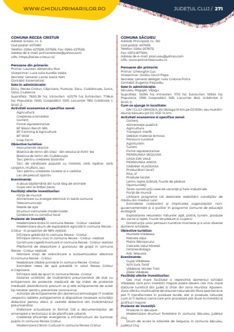 WWW.GHIDULPRIMARIILOR.RO JUDE%u021aUL CLUJ / 271COMUNA RECEA CRISTURAdres%u0103: Eroilor, nr. 5Cod po%u0219tal: 407480Telefon: 0264-227528, 227526; Fax: 0264-227526; Adresa de e-mail: primarierecea@yahoo.comURL: https://recea-cristur.ro/Persoane din primarie:Primar: Laurean Alexandru RusViceprimar: Luca Iulia Aurelia VaidaSecretar General: Larisa Ioana NenContabil: ExternalizatSate %u00een administra%u021bie:Elciu, Recea Cristur, C%u0103prioara, Pustu%u0163a, Escu, Ciub%u0103ncu%u021ba, Jurca, Osloi, CiubancaSuprafa%u021ba:%u00a0 7620,39 ha; Intravilan:%u00a0 423,79 ha; Extravilan:%u00a0 7196,6 ha; Popula%u021bia:%u00a01500; Gospod%u0103rii:%u00a01001; Locuin%u021be:%u00a0785; Gr%u0103dini%u021be:%u00a01; %u0218coli:%u00a02; Activitati economice si specifice zonei:Agricultur%u0103Cre%u015fterea animalelorComer%u0163Firme reprezentative:BT Bison Ranch SRLBT Farming & AgricultureBT WildCrap FarmObiective turistice:Monumente istoriceBiserica de lemn din Osoi - din secolul al XVIII- leaBiserica de lemn din Ciub%u0103ncu%u0163a%u021aarc pentru cre%u0219terea bizonilor%u021aarc de v%u00e2n%u0103toare populat cu mistre%u021bi, cerb lop%u0103tar, cerb carpatin, mufloni, iaci%u021aarc pentru cre%u0219terea ciutelor %u0219i a cerbilorLac de pescuit sportivEvenimente:A doua s%u0103pt%u0103m%u00e2n%u0103 din lun%u0103 t%u00e2rg de animaleCupa verii la fotbal (vara)Facilit%u00e3%u0163i oferite investitorilor:For%u0163%u0103 de munc%u0103Alimentare cu energie electric%u0103 %u00een toat%u0103 comunaTelecomunica%u0163iiRe%u021bele de ap%u0103Drumuri comunale modernizateColaborare cu consiliul localProiecte de investi%u0163ii:Modernizare str%u0103zi %u00een comuna Recea - Cristur -realizatModernizare drum de exploata%u021bie agricol%u0103 %u00een comuna Recea - Cristur -in propor%u0163ie de 98% realizat%u00cenfin%u021bare gr%u0103dini%u021b%u0103 %u00een comuna Recea - Cristur%u00cenfin%u021bare centru civic %u00een comuna Recea - Cristur -realizatConstruire capel%u0103 mortuar%u0103 %u00een comuna Recea - Cristur-realizatPlatform%u0103 de depozitare a gunoiului de grajd %u00een comuna Recea - Cristur-realizatMontare sta%u0163ii de re%u00e2nc%u0103rcare a autovehiculelor electrice %u00een%u00a0comuna Recea - CristurReabilitare cl%u0103dire prim%u0103rie %u00een%u00a0comuna Recea -CristurExtindere re%u021bea de ap%u0103%u00a0 potabil%u0103%u00a0 %u00een%u00a0 satul%u00a0 Recea Cristur si%u00a0C%u0103prioara%u00cenfin%u021bare%u00a0sal%u0103%u00a0de sport%u00a0%u00een comuna Recea -CristurDotarea unit%u0103%u021bilor de %u00eenv%u0103%u021b%u0103m%u00e2nt preuniversitar de stat cu echipament de protec%u021bie medical%u0103 de tip m%u0103%u0219ti de protec%u021bie medical%u0103%u00a0,dezinfectan%u021bi precum ca %u015fi%u00a0alte echipamente de acest tip necesar pentru prevenirea coronavirus.%u00a0Achizi%u0163ie de echipamente din domeniul tehnologiei IT%u00a0mobile ,respectiv tablete ,echipamente %u0219i%u00a0dispozitive necesare activit%u0103%u0163ii didactice pentru elevii %u0219i cadrele didactice din %u00eenv%u0103%u021b%u0103m%u00e2ntul preuniversitar.Elaborare actualizare%u00a0 %u00een format GIS a documenta%u0163iilor de amenajare a teritoriului %u0219i%u00a0de planificare urban%u0103.Cre%u0219terea eficien%u0163ei energetice a infrastructurii de iluminat public%u00a0%u00een comuna Recea-Cristur.Modernizare C%u0103min Cultural %u00een%u00a0comuna Recea-CristurCOMUNA S%u0102CUIEUAdres%u0103: Principal%u0103, nr. 130Cod po%u0219tal: 407495Telefon: 0264-257672; Fax: 0372-877610; Adresa de e-mail: psacuieu@yahoo.comURL: www.primariasacuieu.roPersoane din primarie:Primar: Gheorghe CucViceprimar: Ovidiu Gavril PopaSecretar General delegat: Iulia Cristina PotraContabil: Eugenia Pa%u015fcal%u0103uSate %u00een administra%u021bie:S%u0103cuieu, Rogojel, Vi%u015faguSuprafa%u021ba:%u00a0 12094 ha; Intravilan:%u00a0 1170 ha; Extravilan:%u00a0 10924 ha; Popula%u021bia:%u00a0 1399; Gospod%u0103rii:%u00a0 925; Locuin%u021be:%u00a0 842; Gr%u0103dini%u021be:%u00a0 2; %u0218coli:%u00a02; Cum se ajunge in localitate:DN 1 CLUJ-ORADEA, din Bologa 10 km pe DJ 103H, sau HuedinAluni%u0219-S%u0103cuieu pe DJ 103J 14 kmActivitati economice si specifice zonei:Comer%u0163Alimenta%u0163ie public%u0103AgriculturaTransport marf%u0103Debitat material lemnosPensiuni turisticeAgroturismTurismFirme reprezentative:PENSIUNEA SEQUOIACASA DIN VALEPENSIUNEA ANICACABANA VLADEASAProduc%u0103tori locali:PFA, IFProduse locale:Lemn, lapte, br%u00e2nz%u0103, fructe de p%u0103dure Oportunit%u0103%u0163i:Teren construc%u0163ii case de vacan%u0163%u0103 %u015fi hale industrialeFor%u0163%u0103 de munc%u0103Utilizare programe UE destinate reabilit%u0103rii condi%u0163iilor de mediu din mediul ruralExtinderea colabor%u0103rii %u015fi implicarea organiza%u0163iilor nonguvernamentale %u015fi a %u015fcolilor %u00een programe comune de educa%u0163ie ecologic%u0103Exploatarea resurselor naturale: ap%u0103, piatr%u0103, turism, produse din carne %u0219i lapte, fructe de p%u0103dure %u0219i ciuperciConstruc%u0163ia unor pensiuni turistice montane %u015fi a unor diverse domenii schiabileObiective turistice:Muntele Vl%u0103deasaPietrele AlbePiatra B%u0103ni%u0219oruluiCascada Valul MireseiCetatea Bologa Arb. SequoiaEvenimente:Cupa Vl%u0103deasaSchi tura, fondVl%u0103deasa Winter TrailZilele Vl%u0103deseiFacilit%u00e3%u0163i oferite investitorilor:Cea mai mare facilitate o reprezint%u0103%u00a0 domeniul schiabil Vl%u0103deasa care prin investi%u021bii majore poate deveni cea mai mare sta%u021biune turistic%u0103 din jude%u021b%u00a0 %u0219i chiar din zona Mun%u021bilor Apuseni. Zona ofer%u0103%u00a0o multitudine de resurse naturale din flora spontan%u0103%u00a0ce pot fi transformate %u00een produse locale, dar %u0219i produse naturale cum ar fi lapte %u0219i carne care prin procesare pot duce la investi%u021bii %u0219i profituri majoreProiecte de investi%u0163ii:Proiecte %u00een derulareModernizare drumuri forestiere %u00een comuna S%u0103cuieu, jude%u021bul Cl