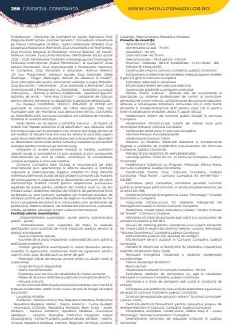 286 / JUDE%u021aUL CONSTAN%u021aA WWW.GHIDULPRIMARIILOR.RO%u00cenv%u0103%u0163%u0103torului , Festivitati de inchidere an scolar, Spectacol final stagiune balet %u015ecoala %u201eNicolae Spirescu%u201d, Convie%u0163uire Interetnic%u0103 pe Plaiuri Dobrogene. KURE%u015e %u2013 lupte tradi%u0163ionale t%u0103t%u0103re%u015fti, Ziua Drapelului Na%u0163ional al Rom%u00e2niei, Ziua Universal%u0103 a Iei Rom%u00e2ne%u015fti, Ziua Imnului Na%u0163ional al Rom%u00e2niei, Hramul Bisericii %u201eSf. Maria%u201d, botezuri sociale, Ziua Limbii Rom%u00e2ne, Deschiderea anului %u015fcolar 2022 %u2013 2023, S%u0103rb%u0103toarea Tradi%u0163iilor %u015fi Me%u015fte%u015fugurilor Dobrogene, Festivalul Interna%u0163ional %u201eRodul P%u0103m%u00e2ntului%u201d- la Cump%u0103na%u201d, Ziua Satului Rom%u00e2nesc, Ziua Interna%u0163ional%u0103 a Persoanelor V%u00e2rstnice %u00een Cump%u0103na, Ziua Mondial%u0103 a Educa%u021biei, Hramul Bisericii %u201eSf. Cuv. Parascheva%u201d, botezuri sociale, Ziua Dobrogei, Zilele Dobrogei - T%u00e2rgul %u201eDobrogea, festival de obiceiuri %u0219i tradi%u021bii%u201d, Ziua Interna%u0163ional%u0103 pentru eliminarea violen%u0163ei a supra femeilor, Ziua Bucovinei, 1 Decembrie - %u201eZiua Na%u0163ional%u0103 a Rom%u00e2niei%u201d, Ziua Interna%u0163ional%u0103 a Persoanelor cu Dizabilit%u0103%u0163i , - Activit%u0103%u021bi cu ocazia Cr%u0103ciunului, - Colinde %u015fi dansuri tradi%u0163ionale - spectacol specific datinilor de iarn%u0103, - %u201cVine Mo%u015f Cr%u0103ciun!%u201d%u00a0 - campanie de Cr%u0103ciun pentru b%u0103tr%u00e2ni, persoane cu dizabilit%u0103%u0163i %u015fi persoane defavorizate.Cu mesajul CUMP%u0102NA, TRECUT, PREZENT %u015eI VIITOR am participat la concursul ini%u0163iat de c%u0103tre Asocia%u0163ia Cele mai frumoase sate din Rom%u00e2nia sub denumirea SATUL CULTURAL AL ROM%u00c2NIEI 2015. Comuna Cump%u0103na are calitatea de membru fondator %u00een aceast%u0103 asocia%u0163ie.Mul%u0163i dintre noi ne dorim a schimba trecutul ... s%u0103 facem s%u0103 treac%u0103 mai repede prezentul %u015fi s%u0103 deschidem u%u015fa viitorului. Cele trei timpuri, a%u015fa cum le percepem noi, ne sunt tare dragi, pentru c%u0103 am %u00eenv%u0103%u0163at c%u0103 fiecare timp are rolul lui. Modul %u00een care parcurgem acest drum este definit de valorile pe care ni le asum%u0103m.%u00a0 Abord%u0103m cu deschidere conexiunile dintre cultur%u0103 %u015fi societate %u015fi provoc%u0103rile evolu%u0163iei acestor conexiuni pe termen lung.Integr%u0103m %u00een aceste procese inova%u0163ia %u015fi tradi%u0163ia, sus%u0163inem valorile locale %u015fi consider%u0103m c%u0103 prin aceasta, %u015fi prin conexiunile interna%u0163ionale pe care le cre%u0103m, contribuim la consolidarea voca%u0163iei europene a comunei noastre.%u00a0Comuna Cump%u0103na este inclus%u0103 %u015fi recunoscut%u0103 pe plan interna%u0163ional prin apartenen%u0163a la diferite asocia%u0163ii %u015fi institu%u0163ii na%u0163ionale %u015fi interna%u0163ionale, leg%u0103turi stabilite %u00een timp datorit%u0103 interesului demonstrat at%u00e2t de to%u0163i cet%u0103%u0163enii comunei, c%u00e2t mai ales de preocuparea %u00een organizarea %u015fi dezvoltarea comunei de c%u0103tre Administra%u0163ia Public%u0103 Local%u0103 pentru respectarea principiului egalit%u0103%u0163ii de %u015fanse pentru cet%u0103%u0163enii din mediul rural cu cei din mediul urban. Stabilirea rela%u0163iilor de infr%u0103%u0163ire, de parteneriat %u00eentre loc%u0103lita%u0163ile cu care comuna%u00a0Cump%u0103na are %u00eencheiate acorduri de %u00eenfr%u0103%u0163ire contribuie la dezvoltarea de leg%u0103turi multilaterale, la mai buna cunoa%u015ftere reciproc%u0103 %u015fi la instaurarea unor sentimente de prietenie %u015fi respect reciproc, de colaborare economic%u0103, cultural%u0103, mediu, s%u0103n%u0103tate, educa%u0163ie, turism cultural interna%u0163ionalFacilit%u00e3%u0163i oferite investitorilor:- Disponibilitatea autorit%u0103%u0163ilor locale pentru parteneriatul public %u2013 privat;%u00a0- Concesionarea unor suprafe%u0163e de teren %u00een vederea desf%u0103%u015fur%u0103rii unor activit%u0103%u0163i de mic%u0103 industrie, prestari servicii la pre%u0163uri avantajoase;%u00a0- Taxe %u0219i impozite reduse;- Scutirea de la plata impozitelor o perioad%u0103 de 2 ani, p%u00e2n%u0103 la edificarea investi%u021biei- Pozi%u021bie geografic%u0103 avantajoas%u0103 %u00een sudul litoralului pentru investi%u021bii %u00een agroturism, construc%u021bie%u00a0 baz%u0103%u00a0 de agrement pentru copii %u0219i tineri, parc de distrac%u021bii cu teren de golf.- Poten%u0163ial ridicat de resurse umane (tineri cu studii medii %u015fi superioare)%u00a0- For%u0163%u0103 de munc%u0103 disponibil%u0103%u00a0- Cadru social favorabil%u00a0- Existen%u0163a unui serviciu de salubritate la nivelul comunei%u00a0- Re%u0163ea de drumuri asfaltate %u015fi pietruite %u00een propor%u021bie de 60 %.%u00a0- Poluare sc%u0103zut%u0103Un loc minunat aflat la sudul ora%u015fului Constan%u0163a, care merit%u0103 %u015fi trebuie modernizat, astfel %u00eenc%u00e2t nivelul de trai s%u0103 ating%u0103 cerin%u0163ele locuitorilor.Localit%u0103%u021bi %u00eenfr%u0103%u021bite:Puh%u0103ceni - Raionul Anenii Noi, Republica Moldova, Dobrichka - Republica Bulgaria, Meliki - Grecia, Edremit - Turcia, Bude%u0219ti - Municipiul Chi%u0219in%u0103u, Republica Moldova, Beer Tuiva - Israel, Str%u0103%u0219eni - Raionul cantemir, republica Moldova, municipiul Jekabpils - Letonia, Shanghai, Districtul Fengxian, ora%u0219ul Zhuanghang - China, Prundeni, jude%u021bul V%u00e2lcea, V%u00e2n%u0103tori - neam%u021b, Cricova, republica Moldova, mahala, Regiunea Cern%u0103u%u021bi, Ucraina, Cazangic, Raionul Leova, Republica Moldova%u00a0 %u00a0%u00a0Proiecte de investi%u0163ii:INFRASTRUCTUR%u0102Alimentarea cu ap%u0103 - 74 kmCanalizare %u2013 64 kmGaze naturale%u2013 62,75 kmTelecomunica%u021bii %u2013 fibr%u0103%u00a0optic%u0103%u00a0%u2013 100 kmDrumuri %u2013 Asfaltate - 68 km-