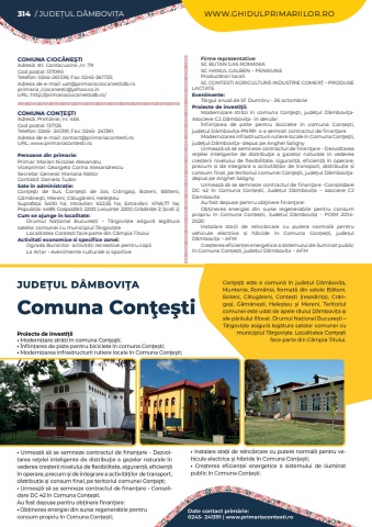 314 / JUDE%u021aUL D%u00c2MBOVI%u021aA WWW.GHIDULPRIMARIILOR.ROCOMUNA CIOC%u0102NE%u015eTIAdres%u0103: str. Cantacuzino ,nr .79Cod po%u0219tal: 137090Telefon: 0245-261336; Fax: 0245-261723; Adresa de e-mail: uat@primariaciocanestidb.roprimaria_ciocanesti@yahoo.co.inURL: http://primariaciocanestidb.ro/COMUNA CON%u0162E%u015eTIAdres%u0103: Prim%u0103riei, nr. 456Cod po%u0219tal: 137125Telefon: 0245- 241391; Fax: 0245- 241391; Adresa de e-mail: contact@primariacontesti.roURL: www.primariacontesti.roPersoane din primarie:Primar: Marian Nicolae AlexandruViceprimar: Georgeta Corina AlexandrescuSecretar General: Mariana NistorContabil: Daniela TudorSate %u00een administra%u021bie:Con%u0163e%u015fti de Sus, Con%u0163e%u015fti de Jos, Cr%u00e2nga%u015fi, Boteni, B%u0103lteni, G%u0103m%u0103ne%u015fti, Mereni, C%u0103lug%u0103reni, Hele%u015fteuSuprafa%u021ba:%u00a0 5400 ha; Intravilan:%u00a0 622,55 ha; Extravilan:%u00a0 4749,77 ha; Popula%u021bia:%u00a04489; Gospod%u0103rii:%u00a02200; Locuin%u021be:%u00a02200; Gr%u0103dini%u021be:%u00a02; %u0218coli:%u00a02; Cum se ajunge in localitate:Drumul Na%u021bional Bucure%u0219ti %u2013 T%u00e2rgovi%u0219te asigur%u0103 leg%u0103tura satelor comunei cu municipiul T%u00e2rgovi%u0219teLocalitatea Con%u021be%u0219ti face parte din C%u00e2mpia TituluiActivitati economice si specifice zonei:Ograda Bunicilor- activit%u0103%u021bi recreative pentru copiiLa Artar %u2013 evenimente culturale %u0219i sportiveFirme reprezentative:SC BUTAN GAS ROMANIASC HANUL GALBEN %u2013 PENSIUNEProduc%u0103tori locali:SC CONTESTI AGRICULTUR%u0102%u00a0INDUSTRIE COMER%u021a%u00a0%u2013 PRODUSE LACTATEEvenimente:T%u00e2rgul anual de Sf. Dumitru - 26 octombrieProiecte de investi%u0163ii:Modernizare str%u0103zi %u00een comuna Con%u0163e%u015fti, jude%u0163ul D%u00e2mbovi%u0163aAsociere CJ..D%u00e2mbovi%u0163a- %u0129n derular%u00cenfiin%u021barea de piste pentru biciclete %u00een comuna Con%u021be%u0219ti, jude%u021bul D%u00e2mbovi%u021ba-PNRR- s-a semnat contractul de finan%u0163areModernizarea infrastructurii rutiere locale %u0129n Comuna Con%u0163e%u015fti, jude%u0163ul D%u00e2mbovi%u0163a- depus pe Anghel SalignyUrmeaz%u00e3 s%u0103%u00a0se semneze contractul de finan%u0163are - Dezvoltarea re%u0163elei inteligente de distribu%u0163ie a gazelor naturale %u00een vederea cre%u0219terii nivelului de flexibilitate, siguran%u021b%u0103, eficien%u021b%u0103 %u00een operare, precum %u0219i de integrare a activit%u0103%u021bilor de transport, distribu%u021bie %u0219i consum final, pe teritoriul comunei Con%u0163e%u015fti, jude%u0163ul D%u00e2mbovi%u0163adepus pe Anghel SalignyUrmeaz%u00e3 s%u0103%u00a0se semneze contractul de finan%u0163are -Consolidare DC 42 %u00een Comuna Con%u021be%u0219ti, Jude%u021bul D%u00e2mbovi%u021ba %u2013 asociere CJ DambovitaAu fost depuse pentru ob%u0163inere finan%u0163are:Ob%u021binerea energiei din surse regenerabile pentru consum propriu %u00een Comuna Con%u021be%u0219ti, Jude%u021bul D%u00e2mbovi%u021ba - POIM 2014-2020Instalare sta%u021bii de re%u00eenc%u0103rcare cu putere normal%u0103 pentru vehicule electrice %u0219i hibride %u00een Comuna Con%u021be%u0219ti, jude%u021bul D%u00e2mbovi%u021ba %u2013 AFM Cre%u0219terea eficien%u021bei energetice a sistemului de iluminat public %u00een Comuna Con%u021be%u0219ti, jude%u021bul D%u00e2mbovi%u021ba %u2013 AFM