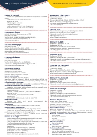328 / JUDE%u021aUL D%u00c2MBOVI%u021aA WWW.GHIDULPRIMARIILOR.ROProiecte de investi%u0163ii:Construc%u021bie gr%u0103dini%u021be noi %u00een satele Fierbin%u021bi %u0219i %u0218elaru finalizate %u00een 2021Modernizare drumuri de interes localProiecte de viitor%u00cenfiin%u021bare gaze naturaleExtindere canalizareModernizare gr%u0103dini%u021b%u0103%u00a0%u00een sat GlogoveanuReabilitare c%u0103min cultural %u00een sat Fierbin%u021biCOMUNA %u015eOT%u00c2NGAAdres%u0103: Constantin Br%u00e2ncoveanu, nr. 373Cod po%u0219tal: 137430Telefon: 0245- 229207, 229300; Fax: 0245-229013; Adresa de e-mail: primaria@sotanga.roURL: www.sotanga.roCOMUNA T%u0102RT%u0102%u015eE%u015eTICod po%u0219tal: 137435Telefon: 0245-261261; Fax: 0245-261239; Adresa de e-mail: primaria_tartasesti@yahoo.comsecretar@primariatartasesti.roURL: http://www.primariatartasesti.roCOMUNA T%u0102T%u0102RANIAdres%u0103: 193Cod po%u0219tal: 137440Telefon: 0245-238209; Fax: 0245-238388; Adresa de e-mail: primariatatarani@yahoo.comURL: www.primarietatarani.roPersoane din primarie:Primar:%u00a0Constantin%u00a0%u00a0P%u0103truViceprimar: Virginia%u00a0Iva%u0219cu%u00a0Secretar General:%u00a0Mioara%u00a0Mih%u0103il%u0103Contabil:%u00a0Bianca Georgiana%u00a0Coco%u0219il%u0103Sate %u00een administra%u021bie:T%u0103t%u0103rani, Gheboieni, C%u0103prioru, PriboiuSuprafa%u021ba:%u00a0 6427 ha; Intravilan:%u00a0 553,48 ha; Extravilan:%u00a0 5873,52 ha; Popula%u021bia:%u00a05228; Gospod%u0103rii:%u00a01866; Locuin%u021be:%u00a02552; Gr%u0103dini%u021be:%u00a04; %u0218coli:%u00a02; Cum se ajunge in localitate:T%u00c2RGOVI%u0218TE - DECINDENI - UNGURENI - GHEBOIENI -T%u0102T%u0102RANIActivitati economice si specifice zonei:Magazine comerciale, sp%u0103l%u0103torii auto, ateliere repara%u021bii auto, intreprinderi individuale agricoleProduc%u0103tori locali:FRUCTE, LEGUME, CEREALE, CRESTERI DE ANIMALEProduse locale:MERE, PRUNE, CARTOFI, PORUMB ,GR%u00c2UMe%u0219te%u0219ugari:CRESC%u0102TORI DE ANIMALE ( VACI OI %u0218I CAPRE)Obiective turistice:Copacul de 1000 ani, loca%u021bie recunoscut%u0103%u00a0 dar ne%u00eenregistrat%u0103%u00a0patrimonialEvenimente:ZIUA COMUNEI T%u0102T%u0102RANI %u00ceN DATA DE 08 AUGUSTFacilit%u00e3%u0163i oferite investitorilor:Crearea de depozite pentru fructe, legume %u0219i cerealeConstruirea de fabrici pentru procesarea lor , av%u00e2nd %u00een vedere producerea materiei prime de c%u0103tre agricultoriDezvoltarea turismului av%u00e2nd i%u00ee vedere zonele naturale existente cu o frumuse%u021be des%u0103v%u00e2r%u0219it%u0103Proiecte de investi%u0163ii:Modernizare drumuri locale pe toate str%u0103zile comuneiIluminat public stradal %u00een toat%u0103%u00a0comunaCentrale electrice pe st%u00e2lpi cu panouri fotovoltaice %u00een 10 loca%u021biiParc fotovoltaic pe suprafa%u021ba de 4600 mpModernizare sistem alimentare cu ap%u0103CanalizareReabilitare %u0219i modernizare %u0219coli %u0219i gr%u0103dini%u021beReabilitare %u0219i modernizare c%u0103mine culturaleBaz%u0103%u00a0sportiv%u0103%u00a0cu teren 12 000 mpDispensare umane moderneSistem distribu%u021bie gaze ( proiect aprobat %u00een 2023)MUNICIPIUL T%u00c2RGOVI%u015eTEAdres%u0103: Revolutiei nr. 1-3Cod po%u0219tal: 130010Telefon: 0245-611222, 613928, 611378; Fax: 0245-217951; Adresa de e-mail: primar@pmtgv.ro primarulmunicipiuluitargoviste@pmtgv.roURL: www.pmtgv.roORA%u0218UL TITUAdres%u0103: Nicolae Grigorescu, nr. 1; Cod po%u0219tal: 135500Telefon: 0245-651095; Fax: 0245-651097; Adresa de e-mail: primariatitu@yahoo.comoffice@primariatitu.roURL: www.primariatitu.roCOMUNA ULIE%u015eTIAdres%u0103: Str. Principal%u0103, nr. 225Cod po%u0219tal: 137445Telefon: 0245-724519; Fax: 0245-724618; Adresa de e-mail: primaria_uliesti@yahoo.comURL: http://primariauliesti.ro/COMUNA ULMICod po%u0219tal: 137455Telefon: 0245-631082; Fax: 0245-631082; Adresa de e-mail: contact@ulmi.ro, primaria.ulmi@yahoo.comURL: http://www.ulmi.ro/COMUNA VALEA LUNG%u0102Adres%u0103: sat. Cricov ,nr 169Cod po%u0219tal: 137465Telefon: 0245-661509; Fax: 0245-669740; Adresa de e-mail: primaria.valealunga@gmail.comURL: https://www.primariavalealunga.ro/COMUNA VALEA MAREAdres%u0103: Principal%u0103, nr. 218Cod po%u0219tal: 137485Telefon: 0245-606323; Fax: 0245-606323; Adresa de e-mail: primariavaleamaredb@yahoo.comCOMUNA V%u0102C%u0102RE%u015eTIAdres%u0103: Principal%u0103Cod po%u0219tal: 137495Telefon: 0245-684330; Fax: 0245-684330; Adresa de e-mail: primaria.vacaresti@yahoo.comURL: www.primariavacaresti.roPersoane din primarie:Primar: Ionu%u021b-Irinel BadeaViceprimar: Alexandru Florin Ancu%u021baSecretar General: Alina ComanContabil: Ana Mgdalena PopescuSate %u00een administra%u021bie:V%u0103c%u0103re%u015fti, Bungetu, Br%u0103te%u015ftii de JosSuprafa%u021ba:%u00a0 3906 ha; Intravilan:%u00a0 406 ha; Extravilan:%u00a0 3500 ha; Popula%u021bia:%u00a05246; Gospod%u0103rii:%u00a01810; Locuin%u021be:%u00a01650; Gr%u0103dini%u021be:%u00a03; %u0218coli:%u00a02; Activitati economice si specifice zonei:Agricultur%u0103Cre%u015fterea animalelorComer%u0163Alimenta%u0163ie public%u0103Obiective turistice:Parcul V%u0103c%u0103re%u015ftiEvenimente:Ziua comunei - 15 augustProiecte de investi%u0163ii:Asfaltare drumuri comunaleConstruire gr%u0103dini%u021b%u0103 sat V%u0103c%u0103re%u0219tiRealizare re%u021bea ap%u0103 potabil%u0103 %u0219i canalizareExtindere re%u021bea gaze naturale