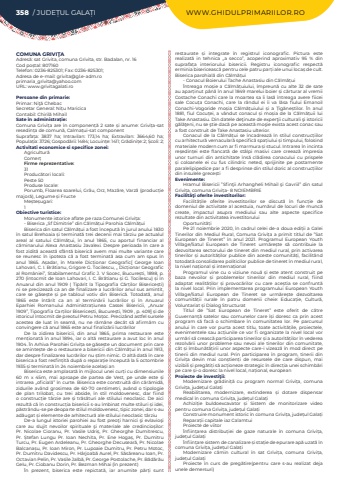 358 / JUDE%u021aUL GALA%u021aI WWW.GHIDULPRIMARIILOR.ROCOMUNA GRIVI%u0162AAdres%u0103: sat Grivita, comuna Grivita, str. Badalan, nr. 16 Cod po%u0219tal: 807160Telefon: 0236-825301; Fax: 0236-825301; Adresa de e-mail: grivita@gl.e-adm.roprimaria_grivita@yahoo.comURL: www.grivitagalati.roPersoane din primarie:Primar: Ni%u0163%u0103 ChebacSecretar General: Ni%u021bu MaricicaContabil: Chiril%u0103 MihailSate %u00een administra%u021bie:Comuna Grivi%u021ba are %u00een componen%u021b%u0103%u00a02 sate %u0219i anume: Grivi%u021ba-sat resedin%u021ba de comun%u0103, Calma%u021bui-sat componentSuprafa%u021ba:%u00a0 3837 ha; Intravilan:%u00a0 173,14 ha; Extravilan:%u00a0 3664,60 ha; Popula%u021bia:%u00a03726; Gospod%u0103rii:%u00a01484; Locuin%u021be:%u00a01411; Gr%u0103dini%u021be:%u00a02; %u0218coli:%u00a02; Activitati economice si specifice zonei:Agricultur%u0103Comer%u021bFirme reprezentative:31Produc%u0103tori locali:Peste 50Produse locale:Porumb, Floarea soarelui, Gr%u00e2u, Orz, Maz%u0103re, Varz%u0103 (produc%u021bie major%u0103), Legume %u0219i FructeMe%u0219te%u0219ugari:1%u00a0Obiective turistice:Monumente istorice aflate pe raza Comunei Grivi%u021ba:- Biserica %u201eSf Dimitrie%u201d din C%u0103lm%u0103%u021bui Parohia C%u0103lm%u0103%u021buiBiserica din satul C%u0103lm%u0103%u021bui a fost %u00eenceput%u0103 %u00een jurul anului 1830 %u00een satul Brehoaia %u0219i terminat%u0103 trei decenii mai t%u00e2rziu pe actualul areal al satului C%u0103lm%u0103%u021bui, %u00een anul 1865, cu aportul financiar al c%u0103minarului Alexa Anastasiu Javalexi. Despre perioada %u00een care a fost zidit%u0103 aceast%u0103 sf%u00e2nt%u0103 biseric%u0103 avem mai multe variante care se reunesc %u00een ipoteza c%u0103 a fost terminat%u0103 asa cum am spus %u00een anul 1865. A%u0219adar, %u00een Marele Dic%u021bionar Geografic[ George Ioan Lahovari, C. I. Br%u0103tianu, Grigore G. Tocilescu, %u201e Dic%u021bionar Geografic al Rom%u00e2niei%u201d, Stabilamentul Grafic J. V Socec, Bucure%u0219ti, 1898, p. 270 (%u00eentocmit de Ioan Lahovari, I. C. Br%u0103tianu %u0219i G. Tocilescu) %u0219i %u00een Anuarul din anul 1909 ( Tip%u0103rit la Tipografia C%u0103r%u021bilor Biserice%u0219ti) ni se precizeaz%u0103 ca an de finalizare a lucr%u0103rilor anul sus amintit, care se g%u0103se%u0219te %u0219i pe tabloul votiv din Biseric%u0103. Totodat%u0103, anul 1865 este %u00eent%u0103rit ca an al termin%u0103rii lucr%u0103rilor %u0219i %u00een Anuarul Eparhiei Romanului Administra%u021biunea Cassei Bisericii, %u201eAnuar 1909%u201d, Tipografia Car%u021bilor Biserice%u0219ti, Bucure%u0219ti, 1909 , p. 409] %u0219i de istoricul %u00eentocmit de preotul Petru Mo%u021boc. Preciz%u00e2nd astfel sursele acestea de luat %u00een seam%u0103, nu ne r%u0103m%u00e2ne dec%u00e2t s%u0103 afirm%u0103m cu convingere c%u0103 anul 1865 este anul finaliz%u0103rii lucr%u0103rilorDe la zidirea bisericii, din anul 1865, prima restaurare este men%u021bionat%u0103 %u00een anul 1894, iar o alt%u0103 restaurare a avut loc %u00een anul 1904. %u00cen Arhiva Parohiei Grivi%u021ba se g%u0103se%u0219te un document prin care se aminte%u0219te de o restaurare a bisericii din C%u0103lm%u0103%u021bui %u00een anul 1913, dar despre finalizarea lucr%u0103rilor nu %u0219tim nimic. O alt%u0103 dat%u0103 %u00een care biserica a fost resfin%u021bit%u0103 dup%u0103 o repara%u021bie %u00eenceput%u0103 la 5 octombrie 1935 %u0219i terminat%u0103 %u00een 24 noiembrie acela%u0219i anBiserica este amplasat%u0103 %u00een mijlocul unei cur%u021bi cu dimensiunile 60 m x 45m, mai aproape de partea de Vest, pe unde este %u0219i intrarea %u201eoficial%u0103%u201d %u00een curte. Biserica este construit%u0103 din c%u0103r%u0103mid%u0103, zidurile av%u00e2nd grosimea de 60-70 centimetri, av%u00e2nd o tipologie de plan trilobat, cu trei abside, %u00een stil moldovenesc, dar fiind o construc%u021bie t%u00e2rzie are %u0219i tr%u0103s%u0103turi ale stilului neoclasic. De aici rezult%u0103 c%u0103 %u00een construc%u021bia bisericii s-au %u00eembinat multe stiluri %u0219i idei, p%u0103str%u00e2ndu-se pe deoparte stilul moldovenesc, tipic zonei, dar s-au ad%u0103ugat %u0219i elemente de arhitectur%u0103 ale stilului neoclasic t%u00e2rziuDe-a lungul istoriei parohiei au fost preo%u0163i harnici %u015fi evlavio%u015fi care au slujit nevoilor spirituale %u015fi materiale ale credincio%u0219ilor: Pr. Nicolae Cioranu, Pr. Vasile Udri%u0219, Pr. Gheorghe Dumitrescu, Pr. %u0218tefan Lungu Pr. Ioan Nechita, Pr. Ene Hoga%u0219, Pr. Dumitru Turcu, Pr. Eugen Ardeleanu, Pr. Gheorghe Decusear%u0103, Pr. Nicolae Balcana%u0219u, Pr. Ioan Miron, Pr. Lupoaie Dumitru, Pr. Petru Motoc, Pr. Dumitru Davidescu, Pr. H%u00e2rjoab%u0103 Aurel, Pr. S%u0103s%u0103reanu Ioan, Pr. Octavian Pelin, Pr. Vasile Jalb%u0103, Pr. George Postolache, Pr. B%u0103d%u0103r%u0103u Gelu, Pr. Ciobanu Dorin, Pr. Bezman Mihai (%u00een prezent)%u00cen prezent, biserica este repictat%u0103, iar anumite p%u0103r%u021bi sunt restaurate %u0219i integrate %u00een registrul iconografic. Pictura este realizat%u0103 in tehnica %u201ea secco%u201d, acoperind aproximativ 95 % din suprafa%u021ba interiorului bisericii. Registru iconografic respect%u0103 erminia bisericeasc%u0103 pentru cele patru par%u021bi ale unui loca%u0219 de cult. Biserica parohial%u0103 din C%u0103lm%u0103%u021bui- Conacul Boierului Tache Anastasiu din C%u0103lm%u0103%u021bui%u00centreaga mo%u0219ie a C%u0103lm%u0103%u021buiului, %u00eempreun%u0103 cu alte 32 de sate au apar%u021binut p%u00e2n%u0103 %u00een anul 1849 marelui boier %u0219i c%u0103rturar al vremii Costache Conachi care la moartea sa %u00eei las%u0103 %u00eentreaga avere fiicei sale Cocu%u021ba Conachi, care la r%u00e2ndul ei %u00eei va l%u0103sa fiului Emanoil Conachi-Vogoride mo%u0219ia C%u0103lm%u0103%u021buiului %u0219i a %u021aig%u0103ne%u0219tilor. %u00cen anul 1881, fiul Cocu%u021bei, a v%u00e2ndut conacul %u0219i mo%u0219ia de la C%u0103lm%u0103%u021buii lui Take Anastasiu. Din datele de%u0163inu