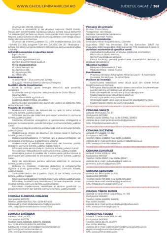 WWW.GHIDULPRIMARIILOR.RO JUDE%u021aUL GALA%u021aI / 361Drumuri de interes na%u021bionalComuna e accesibil%u0103 %u015fi de drumul na%u0163ional DN25 Gala%u0163iTecuci. Din extremitatea nordic%u0103 a satului Schela (locul denumit %u201cLa intersec%u0163ie%u201d) se face un drum comunal de 5 km care ajunge %u00een Negrea. Satul Schela se afl%u0103 pe drumul jude%u0163ean care leag%u0103 ora%u015ful Gala%u0163i de comuna Pechea. Drumuri de interes jude%u021bean DJ 251K Independen%u0163a (DN 25) - Schela (DJ 251), lungime 7,00 km; DJ 251L: DN 25 - Brani%u015ftea - Schela (DJ 251K), lungime 9,00 km; DJ 252G pe por%u0163iunea Brani%u015ftea %u2013 Schela.Activitati economice si specifice zonei:Agricultur%u0103Extrac%u0163ie %u0163i%u0163eiIndustria agroalimentar%u0103Comer%u0163 %u015fi alimenta%u0163ie public%u0103Firme reprezentative:SC OMV Petrom SASC Agriroco SRLSC Agrolucya SRLSC Tiffidi SRL Evenimente:14 octombrie %u2013 Ziua comunei Schela 15 august -Hramul bisericii din satul NegreaFacilit%u00e3%u0163i oferite investitorilor:Acces la utilit%u0103%u0163i: gaze, energie electric%u0103, ap%u0103 potabil%u0103, canalizareScutire de taxe %u015fi impozite, cele prev%u0103zute %u00een Codul FiscalOportunit%u0103%u021bi:O zon%u0103 favorabil%u0103 agriculturiiExisten%u021ba z%u0103c%u0103mintelor de petrolComuna este accesibil%u0103 din punct de vedere al distan%u021bei fa%u021b%u0103 de localitatea Gala%u021biProiecte de investi%u0163ii:Modernizare sistem de alimentare cu ap%u0103 %u00een satul Schela, comuna Schela, jude%u021bul Gala%u021bi%u00cenfiin%u021bare centru de colectare prin aport voluntar %u00een comuna Schela, jude%u021bul Gala%u021biCre%u0219terea eficien%u021bei energetice %u0219i gestionarea inteligent%u0103 a energiei la nivelul %u0219colii ,,Lasc%u0103r Catargiu%u201d, comuna Schela, jude%u021bul Gala%u021biConstruire dig de protec%u021bie pe latura de vest a comunei Schela, jude%u021bul Gala%u021biModernizarea re%u021belei de drumuri de interes local %u00een comuna Schela, jude%u021bul Gala%u021biElaborarea/actualizarea %u00een format gis a documenta%u021biilor de amenajare a teritoriului %u0219i planificare urban%u0103Modernizarea %u0219i reabilitarea sistemului de iluminat public stradal %u00een comuna Schela, jude%u021bul Gala%u021bi, faza II%u00cenfiin%u021bare piste de biciclete %u00een comuna Schela, jude%u021bul Gala%u021biParc panouri fotovoltaice %u00een comuna Schela, jude%u021bul Gala%u021biAmenajare poduri %u0219i pode%u021be de trecere peste p%u00e2r%u00e2ul lozova %u0219i amenajare alei pietonale %u00een intravilanul comunei Schela, jude%u021bul Gala%u021biSta%u021bii de re%u00eenc%u0103rcare pentru vehicule electrice %u00een comuna Schela, jude%u021bul Gala%u021biDotarea cu mobilier, materiale didactice %u0219i echipamente digitale a %u0219colii gimnaziale ,,Lasc%u0103r Catargiu%u201d, comuna Schela, jude%u021bul Gala%u021biConstruire centru de zi pentru copii, %u00een sat Schela, comuna Schela, jude%u021bul Ggala%u021biAmenajare pia%u021b%u0103 agroalimentar%u0103 %u00een comuna Schela, jude%u021bul Gala%u021biExtindere, modernizare, reabilitare %u0219i dotare dispensar uman %u00een satul Schela, comuna Schela, jude%u021bul Gala%u021biExtindere, modernizare, reabilitare %u0219i dotare gradini%u021b%u0103 cu program normal %u00een sat Schela, comuna Schela, jude%u021bul Gala%u021biCOMUNA SLOBOZIA CONACHICod po%u0219tal: 807270Telefon: 0236-824700; Fax: 0236-831400; Adresa de e-mail: sloboziaconachi@yahoo.comURL: http://primariaslobozia-conachi.ro/COMUNA SM%u00c2RDANAdres%u0103: Galati, nr.53;Cod po%u0219tal: 807275Telefon: 0236-830020, 830076, 830026; Fax: 0236-830020,830076, 830026; Adresa de e-mail: primar@primariasmardan.roprimaria@primariasmardan.roURL: www.primariasmardan.roPersoane din primarie:Primar: Zinica SilviuViceprimar: %u00a0Ion StoicaSecretar General:Ilie %u0218endrescuContabil:Carmen PastiaSate %u00een administra%u021bie:Sm%u00e2rdan, Mihail Kog%u0103lniceanu, Ci%u0219meleSuprafa%u021ba:%u00a0 13157 ha; Intravilan:%u00a0 330 ha; Extravilan:%u00a0 12827 ha; Popula%u021bia:%u00a05120; Gospod%u0103rii:%u00a01880; Locuin%u021be:%u00a01715; Gr%u0103dini%u021be:%u00a03; %u0218coli:%u00a02; Activitati economice si specifice zonei:Agricultur%u0103 (cultivarea terenului, cre%u015fterea animalelor)Piscicultur%u0103 (Balta M%u0103lina)Comer%u0163 cu produse agricoleExist%u0103 societ%u0103%u0163i pentru prelucrarea materialului lemnos %u015fi produse de patiserieObiective turistice:P%u0103durea G%u00e2rboavele la 7 kmP%u0103durea Milo%u015f - Valea PaielorEvenimente:Praznicul Sfin%u0163ilor Arhangheli Mihail %u015fi Gavril - 8 noiembrieCuvioasa Paraschiva - 14 octombrieProiecte de investi%u0163ii:Continuarea reabilit%u0103rii celor dou%u0103 %u015fcoli din satele Mihail Kog%u0103lniceanu %u015fi Ci%u0219mele%u00cenfiin%u0163area distribu%u0163iei de ap%u0103 %u00een sistem centralizat %u00een cele trei sateLucr%u0103ri pentru infrastructura drumurilorExecu%u0163ie re%u0163ele de canalizare %u015fi sta%u0163ii de epurareModernizarea celor dou%u0103 baze sportiveConstruc%u0163ie sediu nou prim%u0103rieAmenaj%u0103ri spa%u0163ii verzi parc %u015fi locuri de joac%u0103 pentru copiiModernizarea re%u0163elei de iluminat publicCOMUNA SMUL%u0162IAdres%u0103: Primaverii, nr. 37Cod po%u0219tal: 807280Telefon: 0236-331955; Fax: 0236-331955, 331933; Adresa de e-mail: primaria.smulti@yahoo.roURL: http://primariasmulti.roCOMUNA SUCEVENIAdres%u0103: Principal%u0103, nr. 352Cod po%u0219tal: 807285Telefon: 0236-348260; Fax: 0236-348260; Adresa de e-mail: primaria_suceveni@yahoo.co.ukURL: www.primariasuceveni.roCOMUNA SUHURLUIAdres%u0103: 9 Mai 2008, nr. 665; Cod po%u0219tal: 807257Telefon: 0236-335511; Fax: 0236-335511; Adresa de e-mail: ,suhurlui@gl.e-adm.roprimaria_suhurlui@yahoo.comCOMUNA %u015eENDRENIAdres%u0103: str. Principala ,nr.100; Cod po%u0219tal: 807290Telefon: 0236.707.300; Fax: 0236.707.300; Adresa de e-mail: sendreni@gl.e-adm.roURL: https://comunasendreni
