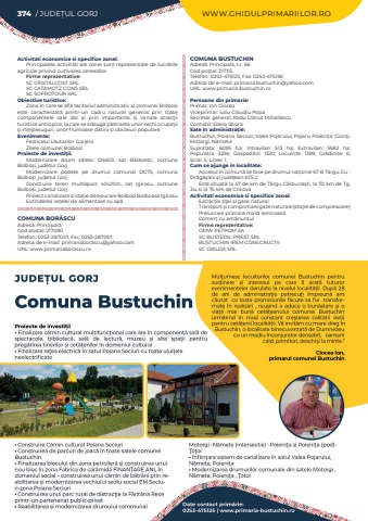 374 / JUDE%u021aUL GORJ WWW.GHIDULPRIMARIILOR.ROActivitati economice si specifice zonei:Principalele activit%u0103%u021bi ale zonei sunt reprezentate de lucr%u0103rile agricole privind cultivarea cerealelorFirme reprezentative:SC CRISTALCOST SRLSC CATAMOTZ CONS SRL SC SOFROTOUR SRLObiective turistice:Zona %u00een care se afl%u0103 teritoriul administrativ al comunei Bolbo%u0219i este caracterizat%u0103 printr-un cadru natural generos prin toate componentele sale dar %u015fi prin importante %u0219i variate atrac%u0163ii turistice antropice, la care se adaug%u0103 p%u0103strarea unor vechi ocupa%u0163ii %u015fi me%u015ftesuguri, unor frumoase datini %u0219i obiceiuri populareEvenimente:Festivalul L%u0103utarilor Gorjeni Zilele comunei Bolbo%u0219iProiecte de investi%u0163ii:Modernizare drum s%u0103tesc DS603, sat B%u0103l%u0103ce%u0219ti, comuna Bolbo%u0219i, jude%u021bul GorjModernizare pode%u021be pe drumul comunal DC75, comuna Bolbo%u0219i, jude%u021bul GorjConstruire teren multisport 40x20m, sat Igirosu, comuna Bolbo%u0219i, jude%u021bul GorjProiect canalizare %u0219i sta%u021bie de epurare Bolbo%u0219i Bolboasa IgirosuExtinderea re%u021belei de alimentare cu ap%u0103COMUNA BOR%u0102SCUAdres%u0103: Principal%u0103Cod po%u0219tal: 217090Telefon: 0253-287001; Fax: 0253-287001; Adresa de e-mail: primariaborascu@yahoo.comURL: www.primariaborascu.roCOMUNA BUSTUCHINAdres%u0103: Principal%u0103, nr. 66Cod po%u0219tal: 217115Telefon: 0253-475125; Fax: 0253-475156; Adresa de e-mail: primaria.bustuchin@yahoo.comURL: www.primaria-bustuchin.roPersoane din primarie:Primar: Ion CioceaViceprimar: Iuliu Claudiu PopaSecretar general: Radu D%u0103nu%u021b%u00a0Mih%u0103ilescuContabil: Elena SboraSate %u00een administra%u021bie:Bustuchin, Poiana%u00a0 Seciuri, Valea Pojarului, Pojaru, Poieni%u021ba, Cion%u0163i, Motorgi, N%u0103meteSuprafa%u021ba:%u00a0 6095 ha; Intravilan:%u00a0 513 ha; Extravilan:%u00a0 5582 ha; Popula%u021bia:%u00a0 3236; Gospod%u0103rii:%u00a0 1320; Locuin%u021be:%u00a0 1399; Gr%u0103dini%u021be:%u00a0 6; %u0218coli:%u00a05; Licee:%u00a01; Cum se ajunge in localitate:Accesul %u00een comun%u0103%u00a0se face pe drumul na%u021bional 67 B T%u00e2rgu Jiu - Dr%u0103g%u0103%u015fani %u015fi jude%u0163ean 675 CEste situat%u0103%u00a0la 47 de km de T%u00e2rgu C%u0103rbune%u015fti, la 70 km de Tg. Jiu si la 75 km de CraiovaActivitati economice si specifice zonei:Extrac%u0163ie %u0163i%u0163ei %u015fi gaze naturalTransport %u015fi comprimare gaze naturale (sta%u0163ie de compresoare)Prelucrare primar%u0103 mas%u0103 lemnoas%u0103Comer%u0163 cu am%u0103nuntulFirme reprezentative:OMW PETROM SASC BUSTEDIL PREST SRLBUSTUCHIN IREM CONSCRUC%u021aIISC OXILDA SRL