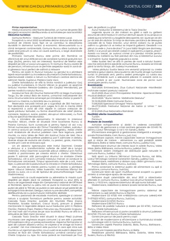 WWW.GHIDULPRIMARIILOR.RO JUDE%u021aUL GORJ / 389Firme reprezentative:Mediul economic este foarte dezvoltat, un numar de peste 350 de agen%u021bi economici desf%u0103%u0219urandu-%u0219i activitatea pe raza localit%u0103%u021biiObiective turistice:Comuna RUNCU - Sta%u021biune Turistic%u0103%u00a0de Interes Local.%u00cencep%u00e2nd cu anul 2022 localitatea de%u021bine statutul de sta%u021biune turistic%u0103%u00a0 de interes local, fapt ce va contribui la dezvoltarea durabil%u0103%u00a0 %u00een domeniul turistic %u0219i economic. Binecuvantat%u0103 cu o clim%u0103%u00a0temperat continental%u0103, Comuna Runcu ofera turistului de week-end precum %u0219i celui ce caut%u0103%u00a0aventura, o larg%u0103%u00a0diversitate de posibilit%u0103%u021bi.Primaria Comunei Runcu este prima din Rom%u00e2nia ce ofer%u0103%u00a0%u00eenc%u0103%u00a0din anul 2016 servicii de consiliere turistic%u0103%u00a0gratuit%u0103%u00a0non stop (24/24), pentru to%u021bi cei interesa%u021bi. Num%u0103rul de telefon este dispobil pe site-ul www.runcugorj.ro. %u00cen Comuna Runcu exist%u0103%u00a038 de pensiuni, infrastructura ce permite oaspe%u021bilor sosi%u021bi %u00een zon%u0103%u00a0s%u0103%u0219i g%u0103seasca locul perfect de odihn%u0103%u00a0%u0219i relaxarePentru cei sosi%u021bi %u00een Runcul Gorjului cu gandul la o plimbare lejer%u0103%u00a0recomand%u0103m cu %u00eencredere o drume%u021bie %u00een Cheile Sohodolului, spectaculoas%u0103%u00a0crea%u021bie a naturii cu forma%u021biuni carstice demne de admirat: Narile, Cuptorul, Pestera Garla Vacii.Cheile Sohodolului se afl%u0103 la limita nordic%u0103 a jude%u021bului Gorj cu jude%u021bul Hunedoara, %u00een Mun%u021bii V%u00e2lcan (o grupare ce apar%u021bine lan%u021bului montan Retezat-Godeanu din Carpa%u021bii Meridionali), pe partea nordic%u0103 a satului Runcu.Accesul se face din Drumul National 67D ce leaga municipiul Targu Jiu de orasul Baia de Arama, urmarind indicatoarele din zona. Drumul este bine amenajat pe intinderea cheilor %u0219i poate fi parcurs cu ma%u0219ina, cu bicicleta sau cu piciorul.Rezerva%u021bia natural%u0103 %u00eentins%u0103 pe o suprafa%u021b%u0103 de 350 hectare a fost declarat%u0103 arie protejat%u0103 prin Legea Nr.5 din 6 martie 2000 %u0219i reprezint%u0103 o zon%u0103 de chei s%u0103pate %u00een calcare cretacice de apele p%u00e2r%u00e2ului Sohodol, cu forme diversificate de relief (doline, canioane, lapiezuri, avene, pe%u0219teri, abrupruri st%u00e2ncoase), cu flor%u0103 %u0219i faun%u0103 specific%u0103 Meridionalilor.Cu o intindere de aproximativ 12 kilometri %u00een interiorul Mun%u021bilor V%u00e2lcan, cheile se situeaz%u0103%u00a0 %u00eentre localitatea Runcu %u0219i Poiana Contului. Sunt cunoscute %u0219i pentru faptul c%u0103%u00a0 aici s-au filmat numeroase scene din filmul Trandafirul Galben, av%u00e2ndu-l %u00een centrul ac%u021biunii pe ineditul personaj M%u0103rgelatu. Ast%u0103zi cheile sunt strabatute de drumul judetean care face legatura, peste munte, cu zona Valea de Pesti din bazinul Jiului de Vest. De-a lungul traseului (de preferat pedestru) pot fi admirate in detaliu diverse etape de evolutie ale cheilor, cu pesteri, grote, marmite, tunele prin care se strecoara ap%u0103Un alt obiectiv spectaculos este Inelul Doamnei. Crea%u021bie a v%u00e2ntului %u0219i a transform%u0103rilor suferite de relief de-a lungul mileniilor, Inelul Doamnei surprinde pl%u0103cut c%u0103l%u0103torul prin forma inedit%u0103%u00a0 %u0219i pozitionarea pe creasta estic%u0103%u00a0 a cheilor. Obiectivul poate fi admirat at%u00e2t parcurg%u00e2nd drumul ce strabate Cheile Sohodolului, c%u00e2t %u0219i prin urmarea traseului marcat ce conduce la forma%u021biunea calcaroas%u0103. Timpul aproximativ este de o or%u0103, mers lejer, cu plecare de la podul situat la intrarea in Cheile SohodoluluiAlte puncte de interes pentru turi%u0219tii ce doresc o plimbare lejera: Izbucul Jalesului, Valea Susenilor, Manastirea Sfantul Ilie (acces cu auto, vis a vis de Spitalul de pneumoftiziologie Tudor Vladimirescu)Aventurierii ce caut%u0103%u00a0 experiente cu adrenalina la maxim sunt r%u0103spl%u0103ti%u021bi pe deplin dac%u0103%u00a0 ne viziteaz%u0103. %u00cencepand cu anul 2015, la Runcu se organizeaz%u0103%u00a0etapa din Campionatul na%u021bional de Off Road al Rom%u00e2niei, sportul cu patru ro%u021bi ce pune la %u00eencercare ma%u0219ini cu puteri de p%u00e2n%u0103%u00a0la 700 de cai putere %u0219i care aduce anual peste 60 de echipaje la linia de start. Desigur, natura nu are de suferit, competi%u021bia desf%u0103sur%u00e2ndu-se cu avizul tuturor institu%u021biilor abilitatePentru pasiona%u021bii de escalada montan%u0103, speologie %u0219i catarari natura a sculptat forma%u021biuni perfecte pentru aceste activit%u0103%u021bi: Cascada Toaia Dracilor, avenele din Muntele Plesa (Carca Parateilor, Scoaba Saraturii, Cracul Scurt), precum %u0219i pe%u0219teri men%u021bionate %u00een legendele despre aurul haiducilor pitit in Pe%u0219tera Floriilor, Pe%u0219tera Popii, Pe%u0219tera Patrunsa sau Ponoarele Gropului. Cel mai %u00eenalt v%u00e2rf muntos de pe raza localit%u0103%u021bii Runcu se afl%u0103%u00a0la o altitudine de 1550 metri (Arcanu)Cascada Toaia Dracilor este situat%u0103 %u00een dosul Ple%u015fii (culmea muntoasa care vegheaza asupra comunei ) %u015fi are at%u00e2t o poveste %u00eenfrico%u015f%u0103toare c%u00e2t %u015fi un peisaj extraordinar. Aspectul fermecator al apei de culoare albastru-verzui, te vrajeste %u0219i te atrage s%u0103%u00a0%u00eencerci o %u201escalda%u201d. Cel mai interesant este punctul %u00een care ap%u0103%u00a0intra sub munte cu un zgomot asurzitor, ca un vuiet ce se aude %u00een departare. Accesul se face din Cheile Sohodolului urm%u00e2nd canionul prin Cheile Gropului cu Apa. NU exisa potec%u0103 se %u00eenainteaz%u0103%u00a0 pe firul apei, de preferat cu ghidAurul haiducilor %u0219i blestemul de la Toaia DracilorLegenda spune ca doi ciobani au g%u0103sit o oal%u0103%u00a0 cu galbeni ascun%u0219i de c%u0103tre haiduci %u