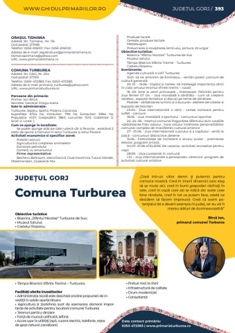 WWW.GHIDULPRIMARIILOR.RO JUDE%u021aUL GORJ / 393ORA%u0218UL TISMANAAdres%u0103: Str. Tismana , Nr. 116Cod po%u0219tal: 217495Telefon: 0253-206101; Fax: 0253-206102; Adresa de e-mail: registratura@primariatismana.rotismanaprimaria@yahoo.comURL: www.primariatismana.roCOMUNA TURBUREAAdres%u0103: Str. G%u0103rii, Nr. 254Cod po%u0219tal: 217515Telefon: 0253-472383; Fax: 0253-472383; Adresa de e-mail: primaria_turburea@yahoo.comURL: www.primariaturburea.roPersoane din primarie:Primar: Ion B%u00eerc%u0103Secretar General: Dragu IoanaSate %u00een administra%u021bie:Turburea, %u015eipotu, Spahii, Poiana, CocorovaSuprafa%u021ba:%u00a0 6754 ha; Intravilan:%u00a0 790 ha; Extravilan:%u00a0 5964 ha; Popula%u021bia:%u00a0 4107; Gospod%u0103rii:%u00a0 1860; Locuin%u021be:%u00a0 1510; Gr%u0103dini%u021be:%u00a0 3; %u0218coli:%u00a02; Licee:%u00a01; Cum se ajunge in localitate:Se poate ajunge at%u00e2t pe cale rutier%u0103 c%u00e2t si feroviar , exist%u00e2nd 2 sta%u021bii de oprire a trenului %u00een satul Turburea %u0219i satul PoianaActivitati economice si specifice zonei:Prest%u0103ri serviciiAgricultur%u0103 %u0219i cre%u015fterea animalelorExtrac%u0163ia petroluluiComer%u0163 cu amanuntulFirme reprezentative:Becheru Ballroom, Vatra Dacic%u0103, Club Insomnia, Tu%u021ba %u0219i S%u0103ndel, Oteamaridan, Cookiecla MixProduse locale:Cereale, produse lactateMe%u0219te%u0219ugari:Prelucrarea %u0219i sculptarea lemnului, pictura, strungarObiective turistice:Biserica %u201cSf%u00e2ntu Nicolae%u201d Turburea de SusMuzeul satuluiT%u00e2mpa Bisericii Sf%u00e2nta Treime - Turburea Castelu Ro%u0219ianuEvenimente:Agenda cultural%u0103 a UAT Turburea:15.01- s%u0103%u00a0ne amintim de Eminescu - recit%u0103ri poezii ,concurs de cultur%u0103 general%u010320 .01. %u2013 15.06.- Copilul %u0219i cartea %u2013s%u0103 in%u021beleag%u0103 importan%u021ba c%u0103r%u021bii %u00een via%u021ba omului Hramul sfintei treimi %u2013 rusalii18 .03- bine ai venit primavar%u0103 %u201e mar%u021bi%u0219oare .Felicit%u0103ri pentru ziua femeii 07 .04. - ziua mondial%u0103 a s%u0103n%u0103t%u0103%u021bii - cum s%u0103 cre%u0219tem s%u0103n%u0103tos %u201a expozi%u021bi tematice %u0219i discu%u021bi pe teme de s%u0103n%u0103tate .Pa%u0219tele - s%u0103rb%u0103toarea luminii %u0219i a bucuriei -ateliere de crea%u021bie si expozi%u021bii de felicit%u0103ri23.04.- Ziua interna%u021bional%u0103 a c%u0103r%u021bi - cartea comoara pentru suflet - concurs18.05. - ziua mondial%u0103 a sportului - concursuri sportive22 -24 .06. -hramul comunei Pogor%u0103rea Sf%u0103ntului duh rusaliile -s%u0103rb%u0103toarea fiilor satului , hora satului %u00eent%u0103lnirea personalit%u0103%u021bilor comunei complex de manifest%u0103ri cultural artistice27 - 01.06. - ziua interna%u021bional%u0103 a jocului %u0219i a copilului - veni%u021bi la joac%u0103 - concursuri distractive ,desene15.06.- Festivitatea de %u00eencheiere a anului %u0219colar - premierea elevilor ,program artistic04.07.-31.08.ATELIERE De vacan%u021ba -activita%u021bi recreative pentru copii28.09. - ziua cura%u021beniei %u00een comun%u01031.10. - ziua interna%u021bional%u0103 a persoanelor v%u0103rstnice -program de activita%u021bi cultural artistice