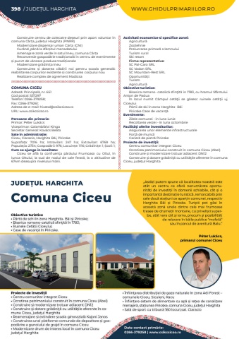 398 / JUDE%u021aUL HARGHITA WWW.GHIDULPRIMARIILOR.ROConstruire centru de colecatre de%u0219euri prin aport voluntar %u00een comuna C%u00e2r%u021ba, jude%u021bul Harghita (PNRR)Modernizare dispensar uman C%u00e2r%u021ba (CNI)Cur%u00e2nd, p%u00e2n%u0103 la sf%u00e2r%u0219itul manadatuluiAmenajare zon%u0103 verde %u00een satul Ineu, comuna C%u00e2r%u021baReconversie gospod%u0103rie tradi%u021bional%u0103 %u00een centru de evenimente %u0219i punct de v%u00e2nzare produse tradi%u021bionaleModernizare gr%u0103dini%u021ba IneuConstruirea %u0219i dotarea cl%u0103dirii noi pentru %u0219coala general%u0103: reabilitarea corpurilor existente %u0219i construirea corpului nou Realizare complex de agrement MadicsaCOMUNA CICEUAdres%u0103: Principal%u0103, nr. 651Cod po%u0219tal: 537297Telefon: 0266-379258; Fax: 0266-379261; Adresa de e-mail: hivatal@csikcsicso.roURL: www.csikcsicso.roPersoane din primarie:Primar: P%u00e9ter Luk%u00e1csViceprimar: Galambfalvi KingaSecretar General: Kov%u00e1cs Be%u00e1taSate %u00een administra%u021bie:Ciceu, Ciaracio, Harghita B%u0103i, PiricskeSuprafa%u021ba:%u00a0 7016 ha; Intravilan:%u00a0 247 ha; Extravilan:%u00a0 6769 ha; Popula%u021bia:%u00a02734; Gospod%u0103rii:%u00a0976; Locuin%u021be:%u00a01116; Gr%u0103dini%u021be:%u00a01; %u0218coli:%u00a01; Cum se ajunge in localitate:Ciceu se afl%u0103 la confluen%u0163a p%u00e2r%u00e2ului Frumoasa cu Oltul, %u00een lunca Oltului, la sud de nodul de cale ferat%u0103, la o altitudine de 674m deasupra nivelului m%u0103rii.Activitati economice si specifice zonei:Agricultur%u0103ZootehniePrelucrarea primar%u0103 a lemnuluiTurism ruralSki resortFirme reprezentative:SC Pal-Caro SRLSC Vadon SRLSC Mountain-Rest SRLOportunit%u0103%u021bi:Turism Agricultur%u0103Obiective turistice:Biserica romano- catolic%u0103 sfin%u0163it%u0103 %u00een 1783, cu hramul Sf%u00e2ntului Anton de Padua%u00cen locul numit C%u00e2mpul cet%u0103%u0163ii se g%u0103sesc ruinele cet%u0103%u0163ii uj CiceuluiP%u00e2rtii de ski %u00een zona Harghita- B%u0103i Piricske Case de vacan%u0163%u0103Evenimente:Zilele comunei - %u00een luna iunie Recoltarea verzei - %u00een luna octombrieFacilit%u00e3%u0163i oferite investitorilor:Asigurarea unor elemente infrastructuraleFor%u0163%u0103 de munc%u0103Carier%u0103 de piatr%u0103 PiricskeProiecte de investi%u0163ii:Centru comunitar integrat CiceuOcrotirea patrimoniului construit %u00een comuna Ciceu (Abel)Construire %u0219i modernizare trotuar adiacent DN12Construire %u015fi dotare gr%u0103dini%u0163%u0103 cu utilit%u0103%u0163ile aferente %u00een comuna Ciceu, jude%u0163ul Harghita