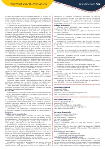 WWW.GHIDULPRIMARIILOR.RO JUDE%u021aUL IA%u0218I / 435doi st%u00e2lpi de sus%u0163inere. Naosul are ad%u00e2ncimea de 5 m, iar %u00eentre cei doi s%u00e2ni laterali de 7 m. Plafonul din sc%u00e2ndur%u0103 pictat%u0103 formeaz%u0103 o calot%u0103. Pardoseala bisericii este din sc%u00e2ndur%u0103 iar lumina p%u0103trunde %u00een interior prin 3 ferestre de form%u0103 dreptunghiular%u0103, situate dou%u0103 %u00een naos %u015fi una %u00een altar.3. Conacul de la Medeleni (Ionel Teodoreanu) Lang%u0103 Biserica cea nou%u0103 se poate vedea %u015fi azi o parte din vechiul conac boieresc, conac ce dealungul vremilor a func%u0163ionat ca %u015fi %u015fcoal%u0103 pentru copiii satului. Dup%u0103 desfiin%u0163area %u015fcolii, conacul a func%u0163ionat ca %u015fi cas%u0103 de pr%u0103snuire pentru Biseric%u0103. %u201cConacul copilariei din %u201cLa Medeleni%u201d A%u015fa cum descria Ionel Teodoreanu %u00een scrisorile trimise c%u0103tre p%u0103rin%u0163ii s%u0103i%u201d Totul e curat:oamenii %u015fi lucrurile, cerul %u015fi peisajul. La sfar%u015fitul vacan%u021bei devin %u015fi eu poet!N-ai grij%u0103! Cerdacul cu model oriental, br%u0103zdat de balcona%u015fe mici, care marca, precum o arcad%u0103, intrarea %u00een cas%u0103, a fost distrus. Buc%u0103t%u0103ria %u0219i sala de mese, care se %u00eentindeau %u00een spate %u00eenspre livada de pruni, au fost demolate %u015fi ele. Iar beciul din spate,,,unul de piatr%u0103, ad%u00e2nc %u0219i r%u0103coros%u201d, cum %u00eel descriu s%u0103tenii, s-a astupat %u015fi %u00eengropat singur. De la forma interesant%u0103 pe care o avea conacul, a dou%u0103 litere L puse cap-lacap, a fost d%u0103r%u00e2mat tot p%u00e2n%u0103 c%u00e2nd cl%u0103direa a r%u0103mas un dreptunghi plat, f%u0103r%u0103 etaj, peste care s-a tr%u00e2ntit un semn pe care scrie %u201e%u015ecoal%u0103%u201d.4. Rezerva%u021bia natural%u0103 Bran Cotul Bran pe R%u00e2ul Prut este o arie naturala protejat%u0103%u00a0de interes na%u021bional ce corespunde categoriei a IV-a IUCN (rezerva%u021bie natural%u0103%u00a0de tip acvatic) situat%u0103%u00a0%u00een jude%u021bul Ia%u0219i, pe teritoriul administrativ al comunei Gol%u0103ie%u0219ti. Rezerva%u021bia natural%u0103 a fost declarat%u0103 arie protejat%u0103 prin Legea Nr.5 din 6 martie 2000 (privind aprobarea Planului de amenajare a teritoriului na%u021bional - Sec%u021biunea a III-a - zone protejate) %u015fi reprezint%u0103 o zon%u0103 (Cotul Bran) pe cursul r%u00e2ului Prut, cu scop de protejare a mai multor specii de pe%u015fti, %u00een vederea reproduceri %u015fi a dezvolt%u0103rii puietului5.Cicloturism-zona Gol%u0103ie%u0219ti este inclus%u0103 %u00een ghidul traseelor pentru biciclete din Romania Ia%u0219i - Aroneanu - Rediu Aldei - P%u0103durea Icuseni - Cilibiu - Medeleni - Gol%u0103ie%u0219ti - M%u00e2nz%u0103te%u0219ti - Holboca Dancu - Ia%u0219i - Grad de dificultate: mediu Durata traseu: 5 ore Distan%u021ba traseu: 58 km Bicicleta recomandat%u0103: ciclocross/MTBSuprafa%u021ba traseu: asfalt/macadamDescriere traseu: traseul %u00eembin%u0103%u00a0 pl%u0103cut por%u021biuni de off-road cu drumuri asfaltate, dar nu foarte circulate. Nu exist%u0103%u00a0 multe dificult%u0103%u021bi tehnice, traseul se preteaz%u0103%u00a0%u0219i plimb%u0103rilor %u00een familie.Zona este plin%u0103%u00a0 de obiective turistice importante, cel mai important %u0219i cunoscut fiind satul Medeleni, cunoscut din trilogia La Medeleni scris%u0103%u00a0de Ionel Teodoreanu.Evenimente:Hramul Comunei Gol%u0103ie%u015fti 14 septembrie s%u0103rb%u0103torit de sf%u00e2nta Cuvioas%u0103 Parascheva a devenit cunoscut%u0103 %u00een urma minunilor pe care le-a f%u0103cut de-a lungul vie%u021bii.Sf%u00e2nta a tr%u0103it pe p%u0103m%u00e2nt %u00een prima jum%u0103tate a veacului al XIlea. S-a n%u0103scut %u00een Epivata (azi Boiados), pe %u0163%u0103rmul M%u0103rii Marmara, %u00een apropiere de Constantinopol (mai t%u00e2rziu, Istanbul), pe atunci capitala Imperiului bizantin. Zi de mare importan%u021b%u0103 pentru comuna Gol%u0103ie%u015fti, cand to%u021bi preo%u021bii slujesc %u015fi adun%u0103 %u00eentreaga comunitate la biseric%u0103. Ziua Eroilor - De Ziua %u00cen%u0103l%u021b%u0103rii Domnului care se s%u0103rb%u0103tore%u015fte %u00een fiecare an la exact 40 de zile de la Pa%u015fte, se comemoreaz%u0103 %u015fi Ziua Eroilor.Facilit%u00e3%u0163i oferite investitorilor:Comuna Gol%u0103ie%u015fti este localizat%u0103 %u00een zon%u0103 de c%u00e2mpie, %u00eenconjurat%u0103 de p%u0103duri de foioase, dispune, de terenuri arabile favorabile pentru culturile de cereale, dar %u0219i pentru culturile de legume. Zona este prepondrent agricol%u0103, mul%u0163i investitori au culturi de gr%u00e2u, porumb, chiar %u0219i lanuri de lavand%u0103 %u015fi flori.Infrastructura rutier%u0103 este una bun%u0103, modernizat%u0103 %u00een anul 2023, accesul fiind destul de facil din ora%u015ful la%u015fi. Zona a devenit populat%u0103 de familii tinere. Anual se dezvolt%u0103 locuin%u021be noi, familii care tranziteaz%u0103 din mediul urban, %u00een mediul rural. Acest aspect %u00eencurajeaz%u0103 cre%u015fterea demografic%u0103 la nivelul comunei %u015fi prevenirea %u00eemb%u0103tr%u00e2nirii popula%u0163iei. Pe lang%u0103 dezvoltarea agricol%u0103, %u00eent%u00e2lnim poten%u021bial piscicol, dezvoltarea culturilor de legume, terenuri %u00eentinse favorabile pentru fermele de animale.Un punct forte este reprezentat de distan%u0163a apropiat%u0103 de mediul urban, la 22 km de ora%u015ful la%u015fi %u00cencuraj%u0103m investitorii %u015fi antreprenorii s%u0103 vin%u0103 in comuna Gol%u0103ie%u015fti prin asigurarea utilit%u0103%u021bilor, ap%u0103 canalizare, gaz, infrastructur%u0103 rutier%u0103, proiecte pe care le-am demarat pentru dezvoltarea %u015fi cresterea potentialului economic al comunei Gol%u0103ie%u015fti. Comuna Gol%u0103ie%u015fti face parte din Grupul de Ac%u021biune Local%u0103 %u201c%u015etefan cel Mare%u201d, instrument important %u00een sporirea dezvolt%u0103rii eco