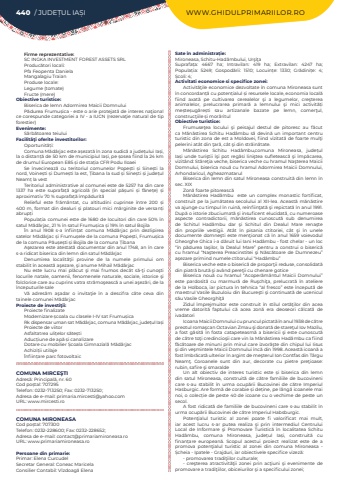 440 / JUDE%u021aUL IA%u0218I WWW.GHIDULPRIMARIILOR.RO Firme reprezentative:SC INGKA INVESTMENT FOREST ASSETS SRLProduc%u0103tori locali:Pfa Feopenta DanielaMangalagiu TraianProduse locale:Legume (tomate) Fructe (mere)Obiective turistice:Biserica de lemn Adormirea Maicii Domnului P%u0103durea Frumu%u0219ica - este o arie protejat%u0103 de interes na%u0163ional ce corespunde categoriei a IV - a IUCN (rezerva%u0163ie natural de tip forestier)Evenimente:S%u0103rb%u0103toarea teiuluiFacilit%u00e3%u0163i oferite investitorilor:Oportunit%u0103%u021bi:Comuna M%u0103d%u00e2rjac este a%u0219ezat%u0103 %u00een zona sudic%u0103 a jude%u021bului Ia%u0219i, la o distan%u021b%u0103 de 50 km de municipiul Ia%u0219i, pe %u0219osea fiind la 24 km de drumul European E85 %u0219i de sta%u021bia CFR Podu IloaeiSe %u00eenvecineaz%u0103 cu teritoriul comunelor Pope%u0219ti %u0219i Sine%u0219ti la nord, Voine%u0219ti %u0219i Dume%u0219ti la est, %u021aibana la sud %u0219i Sine%u0219ti %u0219i jude%u021bul Neam%u021b la vestTeritoriul administrative al comunei este de 5257 ha din care 1337 ha este suprafa%u021b%u0103 agricol%u0103 (%u00een special p%u0103%u0219uni %u0219i f%u00e2ne%u021be) %u0219i aproximativ 70 % suprafa%u021b%u0103 %u00eemp%u0103durit%u0103Relieful este fr%u0103m%u00e2ntat, cu altitudini cuprinse %u00eentre 200 %u0219i 400 m, format din dealuri %u0219i platouri mici m%u0103rginite de versan%u021bi abrup%u021biPopula%u021bia comunei este de 1680 de locuitori din care 50% %u00een satul M%u0103d%u00e2rjac, 21 % %u00een satul Frumu%u0219ica %u0219i 19% %u00een satul Bojila%u00cen anul 1908 s-a %u00eenfiin%u021bat comuna M%u0103d%u00e2rjac prin dezlipirea satelor M%u0103d%u00e2rjac %u0219i Frumu%u0219ele de la comuna Pope%u0219ti, Frumu%u0219ica de la comuna P%u0103u%u0219e%u0219ti %u0219i Bojila de la comuna %u021aibanaA%u015fezarea este atestat%u0103 documentar din anul 1748, an %u00een care s-a ridicat biserica din lemn din satul M%u0103d%u00e2rjacDenumirea localit%u0103%u0163ii provine de la numele primului om stabilit %u00een aceast%u0103 a%u015fezare, %u015fi anume Mihail M%u0103d%u00e2rjacNu este lucru mai pl%u0103cut %u015fi mai frumos dec%u00e2t s%u0103-%u0163i cuno%u015fti locurile natale, oamenii, fenomenele naturale, sociale, istorice %u015fi folclorice care au cuprins vatra str%u0103mo%u015feasc%u0103 a unei a%u015fez%u0103ri, de la %u00eenceputurile saleV%u0103 adres%u0103m a%u015fadar o invita%u0163ie %u00een a descifra c%u00e2te ceva din tainele comunei M%u0103d%u00e2rjacProiecte de investi%u0163ii:Proiecte finalizate Modernizare %u0219coala cu clasele I-IV sat Frumu%u0219icaRk dispensar uman sat M%u0103d%u00e2rjac, comuna M%u0103d%u00e2rjac, jude%u021bul Ia%u0219iProiecte de viitorAsfaltatrea uli%u021belor s%u0103te%u0219ti Aduc%u021biune de ap%u0103 %u0219i canalizareDotare cu mobilier %u0218coala Gimnazial%u0103 M%u0103d%u00e2rjacAchizi%u021bii utilaje %u00cenfiin%u021bare parc fotovoltaicCOMUNA MIRCE%u015eTIAdres%u0103: Principal%u0103, nr. 60Cod po%u0219tal: 707295Telefon: 0232-713250; Fax: 0232-713250; Adresa de e-mail: primaria.mircesti@yahoo.comURL: www.mircesti.roCOMUNA MIRONEASACod po%u0219tal: 707300Telefon: 0232-228600; Fax: 0232-228652; Adresa de e-mail: contact@primariamironeasa.roURL: www.primariamironeasa.roPersoane din primarie:Primar: Elena CurcudelSecretar General: Coneac MaricelaConsilier Contabil: V%u00eezdoag%u0103 ElenaSate %u00een administra%u021bie:Mironeasa, Schitu-Had%u00e2mbului, Ur%u015fi%u0163aSuprafa%u021ba:%u00a0 4667 ha; Intravilan:%u00a0 419 ha; Extravilan:%u00a0 4247 ha; Popula%u021bia:%u00a0 5249; Gospod%u0103rii:%u00a0 1510; Locuin%u021be:%u00a0 1330; Gr%u0103dini%u021be:%u00a0 4; %u0218coli:%u00a04; Activitati economice si specifice zonei:Activit%u0103%u0163ile economice dezvoltate %u00een comuna Mironeasa sunt %u00een concordan%u021b%u0103 cu poten%u021bialul %u0219i resursele locale, economia local%u0103 fiind axat%u0103 pe cultivarea cerealelor %u015fi a legumelor, cre%u015fterea animalelor, prelucrarea primar%u0103 a lemnului %u015fi mici activit%u0103%u021bi me%u0219te%u0219ug%u0103re%u0219ti sau artizanale bazate pe lemn, comer%u0163ul, construc%u0163iile %u0219i mor%u0103ritulObiective turistice:Frumuse%u0163ea locului %u015fi peisajul destul de pitoresc au f%u0103cut ca M%u0103n%u0103stirea Schitu Had%u00e2mbu s%u0103 devin%u0103 un important centru turistic din zona de est a Moldovei, fiind vizitat%u0103 de foarte mul%u0163i pelerini at%u00e2t din %u0163ar%u0103, c%u00e2t %u015fi din str%u0103in%u0103tate.M%u0103n%u0103stirea Schitu Had%u00e2mbu,comuna Mironeasa, jude%u021bul Ia%u0219i%u00a0 unde turi%u015ftii %u00ee%u015fi pot reg%u0103si lini%u015ftea sufleteasc%u0103 %u015fi %u00eemp%u0103carea, vizit%u00e2nd: St%u0103re%u0163ia veche, biserica veche cu hramul Na%u015fterea Maicii Domnului, biserica nou%u0103 cu hramul Adormirea Maicii Domnului, Arhondaricul, AgheazmatarulBiserica din lemn din satul Mironeasa construit%u0103 din lemn %u00een sec. XIXZon%u0103 foarte pitoreasc%u0103M%u00e2n%u0103stirea Had%u00e2mbu %u00a0 este un complex monastic fortificat, construit pe la jum%u0103tatea secolului al XII-lea. Aceast%u0103 m%u0103n%u0103stire va ajunge cu timpul %u00een ruin%u0103, re%u00eenfiin%u0163at%u0103 %u015fi repictat%u0103 %u00een anul 1991. Dup%u0103 o istorie zbuciumat%u0103 %u015fi insuficent elucidat%u0103, cu numeroase aspecte contradictorii, m%u0103n%u0103stirea cunoscut%u0103 sub denumirea de Schitul Had%u00e2mbu dar %u015fi Schitul din Dealul Mare rena%u015fte din propriile vestigii. At%u00e2t %u00een pisania ctitoriei, c%u00e2t %u015fi %u00een unele documente domne%u015fti este men%u0163ionat c%u0103 %u00een anul 1659 voievodul Gheorghe Ghica i-a d%u0103ruit lui Iani Had%u00e2mbu - fost chelar - un loc %u201c%u00een p%u0103durea Ia%u015filor, la Dealul Mare%u201d pentru a construi o biseric%u0103 cu hramul %u201cNa%u015fterea Preacinstitei %u015fi N%u0103sc%u0103toare de Dumnezeu%u201d a%u015fezare primind numele ctit