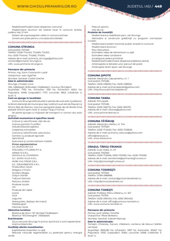 WWW.GHIDULPRIMARIILOR.RO JUDE%u021aUL IA%u0218I / 449Reabilitare/modernizare dispensar comunalModernizare drumuri de interes local %u00een comuna %u0218cheia, jude%u021bul Ia%u0219i, 21 kmSistem de supraveghere video %u00een comuna %u0218cheiaConstruire piste pentru circula%u021bia bicicletelorCOMUNA STRUNGACod po%u0219tal: 707465Telefon: 0232-714440, 714260, 714301;Fax: 0232-714440, 714260, 714301; Adresa de e-mail: primaria_strunga@yahoo.comcontact@primaria-strunga.roURL: www.primaria-strunga.roPersoane din primarie:Primar: Ing. Sorin Constantin Laz%u0103r%u00a0Viceprimar:%u00a0Ioan Agafitei%u00a0Secretar General: Costel Ureche%u00a0Sate %u00een administra%u021bie:Strunga, Crive%u015fti, Gura V%u0103ii,%u00a0H%u0103b%u0103%u015fe%u015fti,%u00a0Br%u0103tule%u015fti,%u00a0Fedele%u015feni,%u00a0Cucova,%u00a0F%u0103rc%u0103%u015feniSuprafa%u021ba:%u00a0 7163 ha; Intravilan:%u00a0 539 ha; Extravilan:%u00a0 6624 ha; Popula%u021bia:%u00a0 3498; Gospod%u0103rii:%u00a0 1737; Locuin%u021be:%u00a0 1853; Gr%u0103dini%u021be:%u00a0 4; %u0218coli:%u00a03; Cum se ajunge in localitate:Comuna Strunga este situat%u0103 %u00een partea de sud-vest a jude%u0163ului, la 55 km distan%u0163%u0103 de municipiul Ia%u015fi, la 28 km sud-est de Pa%u015fcani %u015fi 30 km fa%u0163%u0103 de Roman, cea mai apropiat%u0103 sta%u0163ie de c%u0103i ferate fiind plasat%u0103 la 8 km spre nord, %u00een ora%u015ful T%u00e2rgu Frumos. Se poate ajunge cu mijloace de transport in comun sau auto propriuActivitati economice si specifice zonei:Cultura %u015fi valorificarea vi%u021bei de vieCultura pomilor fructiferiIndustrializarea lapteluiCre%u015fterea animalelorCultura %u015fi valorificarea usturoiuluiComer%u0163 cu produse agricoleApicultur%u0103Executare %u015fi comercializare mobil%u0103Firme reprezentative:S.C.AGROCOM S.ASTEGARIU F.FLORIN P.F.A.ARINA 12 S.R.L. AVICOLA XL COMPANYS.C. AGRO IULIA S.R.L.MOB-YUG PROD S.R.L.S.C. IDEAMBIENTE S.R.L.Produc%u0103tori locali:Stegariu F.FlorinScrofani BiagioCol%u0163un DanielTulbure DamianPascaru AndreiProduse locale:VinProduse din lapteCarneOu%u0103LegumeMiere,polen, l%u0103pti%u015for de matc%u0103Me%u0219te%u0219ugari: C%u0103riman lonel Obiective turistice:Biserica de lemn %u201cSf. Nicolae%u201d,Fedele%u015feni Biserica %u201cSf.Gheorghe%u201d ,H%u0103b%u0103%u0219e%u0219tiEvenimente:Ziua comunei Strunga %u00een prima duminic%u0103 a lunii septembrie Hramul bisericilorFacilit%u00e3%u0163i oferite investitorilor:Exploatarea izvoarelor cu ap%u0103Resurse naturale regenerabile cu poten%u0163ial pentru energia verdePescuit sportivVi%u021ba de vieProiecte de investi%u0163ii:Modernizare %u0219i reabilitare parc, sat StrungaDemolare %u0219i construire gr%u0103dini%u021b%u0103%u00a0 cu program normal,sat Crive%u0219tiModernizare sistem iluminat public stradal %u00een comun%u0103Modernizare drumuriParc fotovoltaicExtindere re%u021bea de alimentare cu ap%u0103Extindere re%u021bea canalizareAnvelopare sediul prim%u0103rieiReabilitare/modernizare dispensar(cl%u0103direa veche)Amenajarea %u0219i dotarea unor parcuri de joac%u0103 Amenajare teren sport ,sat StrungaCOMUNA %u015eIPOTEAdres%u0103: Alexandru L%u0103pu%u015fneanu, nr. 1Cod po%u0219tal: 707485Telefon: 0232-238333; Fax: 0232-238320; Adresa de e-mail: primariasipote@yahoo.comURL: http://www.primariasipote.ro/COMUNA TANSAAdres%u0103: Principal%u0103Cod po%u0219tal: 707495Telefon: 0232-325170; Fax: 0232-325170; Adresa de e-mail: cltansa@yahoo.comURL: www.primariatansa.roCOMUNA T%u0102T%u0102RU%u015eIAdres%u0103: Alexandru Vasiliu, nr. 104Cod po%u0219tal: 707500Telefon: 0232-714500; Fax: 0232-722828; Adresa de e-mail: primaria_tatarusi@yahoo.comoffice@tatarusi.roURL: www.tatarusi.roORA%u0218UL T%u00c2RGU FRUMOSAdres%u0103: Cuza Vod%u0103, nr. 67Cod po%u0219tal: 705300Telefon: 0232-710906, 0232-710330; Fax: 0232-710330; Adresa de e-mail: secretariat@primariatgfrumos.roURL: http://primariatgfrumos.ro/COMUNA TODIRE%u015eTICod po%u0219tal: 707505Telefon: 0769-398898; Adresa de e-mail: contact@primariatodiresti.roURL: http://primariatodiresti.ro/COMUNA TOME%u015eTIAdres%u0103: Profesor Petru Olteanu, nr. 167Cod po%u0219tal: 707515Telefon: 0232-290434; Fax: 0232-290422; Adresa de e-mail: office@comuna-tomesti.roURL: www.comuna-tomesti.roPersoane din primarie:Primar: prof. %u015etefan TimofteViceprimar: Pavel BirleanuSecretar General: Gabriel Manca%u015fSate %u00een administra%u021bie:Tome%u015fti, Chicerea, Goruni, Vl%u0103diceni, cartierul de blocuri %u0218tefan cel MareSuprafa%u021ba:%u00a0 3925,80 ha; Intravilan:%u00a0 1997 ha; Extravilan:%u00a0 1928,7 ha; Popula%u021bia:%u00a0 11051; Gospod%u0103rii:%u00a0 3060; Locuin%u021be:%u00a0 5068; Gr%u0103dini%u021be:%u00a0 5; %u0218coli:%u00a04;