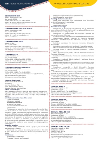 478 / JUDE%u021aUL MARAMURE%u0218 WWW.GHIDULPRIMARIILOR.ROCOMUNA PETROVAAdres%u0103: Principal%u0103, nr. 792Cod po%u0219tal: 437210Telefon: 0262-363130; Fax: 0262-363201; Adresa de e-mail: primariapetrova@yahoo.comURL: www.primaria-petrova.roCOMUNA POIENILE DE SUB MUNTEAdres%u0103: Principal%u0103, nr. 382Cod po%u0219tal: 437220Telefon: 0262-367075; Fax: 0262-367075; Adresa de e-mail: contact@pdsm.roURL: www.pdsm.roCOMUNA POIENILE IZEIAdres%u0103: nr. 349Cod po%u0219tal: 437215Telefon: 0262-334202; Fax: 0262-334202; Adresa de e-mail: primariapoienileizei@yahoo.comURL: https://poienileizei.com/COMUNA RECEAAdres%u0103: Prim%u0103riei, nr. 2Cod po%u0219tal: 437225Telefon: 0262-287240; Fax: 0262-287555; Adresa de e-mail: office@primaria-recea.roURL: http://www.primaria-recea.roCOMUNA REMETEA CHIOARULUIAdres%u0103: Principal%u0103, nr. 80Cod po%u0219tal: 437230Telefon: 0262-288212; Fax: 0262-288010; Adresa de e-mail: primariaremeteachioarului@yahoo.com,primaria@remeteachioarului.roURL: www.remeteachioarului.roPersoane din primarie:Primar:%u00a0C%u0103lin Ovidiu%u00a0Petric%u0103Viceprimar:%u00a0Secretar: Codru%u021ba%u00a0Filip%u00a0Jurist:%u00a0Beatrix Anda%u00a0DanciuContabil: Carmen Camelia%u00a0BlagaSate %u00een administra%u021bie:Po%u015fta, Remetea Chioarului, Berchez, Berchezeoaia, RemecioaraSuprafa%u021ba:%u00a05337, 79 a; Intravilan:%u00a01161, 40 a; Extravilan:%u00a04176, 39 ha; Popula%u021bia:%u00a0 2857; Gospod%u0103rii:%u00a0 1067; Locuin%u021be:%u00a0 1577; Gr%u0103dini%u021be:%u00a0 5; %u0218coli:%u00a05; Activitati economice si specifice zonei:Confec%u021bii metaliceAlimentare public%u0103Firme Reprezentative:SC METAL GECA SRLSC LOREDANA CATERING SRLOportunit%u0103%u0163i: Realizarea unor obiective destinate petrecerii timpului liber, circuite turistice %u00een zona Chioarului, p%u0103strarea %u0219i conservarea mo%u0219tenirii rurale sunt esen%u021biale pentru dezvoltarea turismului rural, etno-folcloric, cultural, ecologic, gastronomic, crearea unor intreprinderi sau asocia%u021bii de produc%u0103tori de artizanat, realizarea unui centru de colectare si prelucrare a produselor agricole, realizarea unui centru de colectare %u0219i prelucrare a produselor de origine animal%u0103, realizarea unor inves%u021bii %u00een domeniul tehnic %u015fi de produc%u021bie, realizarea unor parcuri tehnologice/logistice, fotovoltaiceObiective turistice:Ruinele Cet%u0103%u021bii Chioarului, Cheile L%u0103pu%u0219ului, Crucifixul din Remetea, fond cinegeticConstruc%u021bii cu valoare deosebit%u0103/reprezentative: Bisericile de lemn din Remetea Chioarului, Remecioara, Berchez, Posta %u0219i S%u0103p%u00e2iaEvenimente:Prim%u0103v%u0103ra la Cetate (mai)Festivalul %u201c Dan%u021b la %u0219ur%u0103%u201d(august)Festivalul %u201cToamna Chiorean%u0103%u201d (septembrie) Balul Strugurilor (octombrie)Facilit%u00e3%u0163i oferite investitorilor:Pia%u0163a pu%u021bin dezvoltat%u0103, lips%u0103 concuren%u021ba, for%u021ba de munc%u0103 t%u00e2n%u0103r%u0103, infrastructur%u0103 %u00een dezvoltareLocalit%u0103%u021bi %u00cenfr%u0103%u021bite: Ora%u015ful Jaslo-PoloniaProiecte de investi%u0163ii:Reabilitarea %u0219i dezvoltarea resurselor de ap%u0103%u00a0 %u0219i reabilitarea sistemului de distribu%u021bie al aliment%u0103rii cu ap%u0103%u00a0potabil%u0103%u00a0a comunei Remetea Chioarului -etapele I-VIReabilitarea %u0219i modernizarea infrastructurii agricole din comuna Remetea ChioaruluiCanalizarea apelor menajere %u00een localitatea Remetea ChioaruluiModernizarea C%u0103mine culturale %u00een Comuna Remetea Chioarului , localitatile Remetea Chioarului %u0219i Po%u0219ta , Jude%u021bul Maramure%u0219Extindere canalizare %u00een Comuna Remetea Chioarului, Maramure%u0219Extindere re%u021bea canalizare %u00een localitatile Po%u0219ta %u0219i RemecioarModernizare drum comunal DC 78 %u00eentre%u00a0S%u0103c%u0103la%u0219eni %u0219i DC 76Asfaltare str%u0103zi %u00een comuna Remetea Chioarului , jude%u021bul Maramure%u0219Sta%u021biii de re%u00eenc%u0103rcare pentru vehicule electrice %u00een Comuna Remetea ChioaruluiReabilitare moderat%u0103%u00a0sediul Prim%u0103riei %u00een localitatea Remetea ChioaruluReabilitare moderat%u0103%u00a0 C%u0103min Cultural , loalitatea Berchez Comuna Remetea ChioaruluiModernizarea insfrastructurii rutiere de baz%u0103%u00a0din spa%u021biul ruralSistem inteligent de management local %u00een Comuna Remetea ChioaruluiReabilitarea energetic%u0103%u00a0 a %u0218colii Gimnaziale Remetea Chioarului , %u00een vederea includerii acesteia %u00een re%u021beaua pilot de %u0218coli VerziCre%u0219terea nivelului de informare %u0219i promovare a sitului Natura 2000 ROSCI0030 Cheile L%u0103pu%u0219ului %u00eempreun%u0103%u00a0 cu aria Natura de interes National 2583 Cheiele L%u0103pu%u0219ului%u00cenfiin%u021bare parc fotovoltaic %u00een vederea producerii energiei electrice pentru autoconsum ,Comuna Remetea ChioaruluiDotarea unit%u0103%u021bilor de %u00eenv%u00e2%u021b%u00e2m%u00e2nt din Comuna Remetea Chioarului , jude%u021bul Maramure%u0219COMUNA REME%u0162IAdres%u0103: Principal%u0103, nr. 684Cod po%u0219tal: 437235Telefon: 0262-370009; Fax: 0262-370009; Adresa de e-mail: primariaremeti@yahoo.comURL: https://comunaremeti.ro/COMUNA REPEDEAAdres%u0103: Principal%u0103, nr. 98Cod po%u0219tal: 437240Telefon: 0262-366011; Fax: 0262-366065; Adresa de e-mail: adrese@comunarepedea.roURL: https://comunarepedea.ro/COMUNA RONA DE JOSAdres%u0103: Principal%u0103, nr. 684Cod po%u0219tal: 437245Telefon: 0262-361101; Fax: 0262-361101; Adresa de e-mail: secretar@primariaronadejos.roprimar@primariaronadejos.roURL: www.primariaronadejos.roCOMUNA RONA DE SUSAdres%u0103: Principal%u0103, nr. 1286Cod po%u0219tal: 437250Telefon: 0262- 362128; Fax: 0262-362128; Adresa de e-mail: primar@primariaronadesus.ro primariaronadesus@yahoo.comURL: www.primariaronadesus.ro