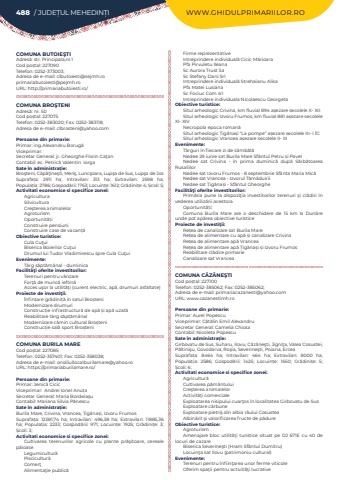 488 / JUDE%u021aUL MEHEDIN%u021aI WWW.GHIDULPRIMARIILOR.ROCOMUNA BUTOIE%u015eTIAdres%u0103: str. Principala,nr.1Cod po%u0219tal: 227090Telefon: 0252-373003; Adresa de e-mail: clbutoiesti@sejmh.roprimariabutoiesti@pejmh.roURL: http://primariabutoiesti.ro/COMUNA BRO%u015eTENIAdres%u0103: nr. 50Cod po%u0219tal: 227075Telefon: 0252-383020; Fax: 0252-383118; Adresa de e-mail: clbrosteni@yahoo.comPersoane din primarie:Primar: ing.Alexandru%u00a0Borug%u0103%u00a0Viceprimar:%u00a0Secretar General: jr.%u00a0Gheorghe Florin%u00a0Ca%u0163anContabil: ec. Petric%u0103 Valentin%u00a0%u00a0Iorga%u00a0Sate %u00een administra%u021bie:Bro%u015fteni, C%u0103p%u0103%u0163%u00eene%u015fti, Meri%u015f, Lunc%u015foara, Lup%u015fa de Sus, Lup%u015fa de JosSuprafa%u021ba:%u00a0 2911 ha; Intravilan:%u00a0 313 ha; Extravilan:%u00a0 2598 ha; Popula%u021bia:%u00a02786; Gospod%u0103rii:%u00a01763; Locuin%u021be:%u00a01612; Gr%u0103dini%u021be:%u00a04; %u0218coli:%u00a05; Activitati economice si specifice zonei:AgriculturaSilviculturaCre%u015fterea animalelorAgroturismOportunit%u0103%u021biConstruire pensiuniConstruire case de vacan%u021b%u0103Obiective turistice:Cula Cu%u0163uiBiserica Boierilor Cu%u0163uiDrumul lui Tudor Vladimirescu spre Cula Cu%u0163uiEvenimente:T%u00e2rg s%u0103pt%u0103m%u00e2nal - duminicaFacilit%u00e3%u0163i oferite investitorilor:Terenuri pentru v%u00e2nzareFor%u0163%u0103 de munc%u0103 ieftin%u0103Acces u%u015for la utilit%u0103%u0163i (curent electric, ap%u0103, drumuri asfaltate)Proiecte de investi%u0163ii:%u00cenfin%u021bare gr%u0103dini%u021b%u0103 %u00een satul Bro%u0219teniModernizare drumuriConstruc%u021bie infrastructur%u0103 de ap%u0103 %u0219i ap%u0103 uzat%u0103 Reabilitare t%u00e2rg s%u0103pt%u0103m%u00e2nalModernizare c%u0103min cultural Bro%u0219teniConstruc%u021bie sal%u0103 sport Bro%u0219teniCOMUNA BURILA MARECod po%u0219tal: 227085Telefon: 0252-357401; Fax: 0252-358038; Adresa de e-mail: onsiliullocalburilamare@yahoo.roURL: https://primariaburilamare.ro/Persoane din primarie:Primar: Jenic%u0103%u00a0CicicViceprimar:%u00a0 Andrei Ionel%u00a0Anu%u021baSecretar General: Maria%u00a0Bordeia%u015fu%u00a0Contabil:%u00a0Mariana Silvia%u00a0P%u0103nescuSate %u00een administra%u021bie:Burila Mare, Crivina, Vrancea, %u021aig%u0103na%u0219i, Izvoru FrumosSuprafa%u021ba:%u00a0 12381,74 ha; Intravilan:%u00a0 496,38 ha; Extravilan:%u00a0 11885,36 ha; Popula%u021bia:%u00a0 2233; Gospod%u0103rii:%u00a0 971; Locuin%u021be:%u00a0 1925; Gr%u0103dini%u021be:%u00a0 3; %u0218coli:%u00a03; Activitati economice si specifice zonei:Cultivarea terenurilor agricole cu plante pr%u0103%u015fitoare, cereale p%u0103ioaseLegumicultur%u0103Piscicultur%u0103 Comer%u0163Alimenta%u0163ie public%u0103Firme reprezentativeIntreprindere individual%u0103 Cicic M%u0103rioaraPfa Pirvuletu IleanaSc Aurora Trust SaSc Stefany Dani SrlIntreprindere individual%u0103 Strehaianu AlisaPfa Matei LusianaSc Fociuc Com srlIntreprindere individuala Nicolaescu Georgeta%u00a0Obiective turistice:Situl arheologic Crivina, km fluvial 894 a%u0219ezare secolele X- XIISitul arheologic%u00a0Izvoru Frumos, km fluvial 881 a%u0219ezare secolele XI- XIVNecropola epoca roman%u0103Situl arheologic %u021aig%u0103na%u0219i %u201cLa pompe%u201d a%u0219ezare secolele III- I %u00ceCSitul arheologic Vrancea a%u0219ezare secolele II- IIIEvenimente:T%u00e2rguri %u00een fiecare zi de s%u00e2mb%u0103t%u0103Nedee 29 iunie sat Burila Mare Sf%u00e2ntul Petru %u0219i PavelNedee sat Crivina - %u00een prima duminic%u0103 dup%u0103 S%u0103rb%u0103toarea RusaliilorNedee sat Izvoru Frumos - 8 septembrie Sf%u00e2nta Maria Mic%u0103Nedee sat Vrancea - Izvorul T%u0103m%u0103duiriiNedee sat %u021aig%u0103na%u0219i - Sf%u00e2ntul GheorgheFacilit%u00e3%u0163i oferite investitorilor:Prim%u0103ria pune la dispozi%u0163ia investitorilor terenuri %u015fi cl%u0103diri %u00een vederea utiliz%u0103rii acestoraOportunit%u0103%u021bi:Comuna Burila Mare are o deschidere de 15 km la Dun%u0103re unde pot ap%u0103rea obiective turisticeProiecte de investi%u0163ii:Re%u021bea de canalizare sat Burila MareRe%u021bea de alimentare cu ap%u0103 %u0219i canalizare CrivinaRe%u021bea de alimentare ap%u0103 VranceaRe%u021bea de alimentare ap%u0103 %u021aig%u0103na%u0219i %u0219i Izvoru FrumosReabilitare cl%u0103dire primarieCanalizare sat VranceaCOMUNA C%u0102Z%u0102NE%u015eTICod po%u0219tal: 227100Telefon: 0252-385062; Fax: 0252-385062; Adresa de e-mail: primariacazanesti@yahoo.com URL: www.cazanestimh.roPersoane din primarie:Primar:%u00a0Aurel%u00a0PopescuViceprimar: C%u0103t%u0103lin Emil%u00a0AlexandruSecretar General: Camelia%u00a0ChiosaContabil: Nicoleta%u00a0PopescuSate %u00een administra%u021bie:Girbovatu de Sus, Suharu, Ilovu, C%u0103z%u0103ne%u015fti, Jigni%u0163a, Valea Cosustei, P%u0103ltini%u015fu, Govodarva, Ro%u015fia, Severine%u015fti, Poiana, ErceaSuprafa%u021ba:%u00a0 8464 ha; Intravilan:%u00a0 464 ha; Extravilan:%u00a0 8000 ha; Popula%u021bia:%u00a0 2586; Gospod%u0103rii:%u00a0 1425; Locuin%u021be:%u00a0 1650; Gr%u0103dini%u021be:%u00a0 5; %u0218coli:%u00a06; Activitati economice si specifice zonei:Agricultur%u0103Cultivarea p%u0103m%u00e2ntuluiCre%u015fterea animalelorActivit%u0103%u0163i comercialeExploatarea nisipului cuar%u0163os %u00een localitatea Girbovatu de SusExploatare c%u0103rbuneExploatare pietri%u015f din albia r%u00e2ului CosusteaAlbin%u0103rit %u015fi valorificarea fructe de p%u0103dure%u00a0Obiective turistice:AgroturismAmenajare bloc utilit%u0103%u0163i turistice situat pe DJ 671E cu 40 de locuri de cazareBiserica Severine%u015fti (Hram Sf%u00e2ntul Dumitru)Locuin%u0163a sat Ilovu (patrimoniu cultural)Evenimente:Terenuri pentru %u00eenfiin%u0163area unor ferme viticoleOferim spa%u0163ii pentru activit%u0103%u0163i lucrative