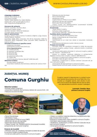 520 / JUDE%u021aUL MURE%u0218 WWW.GHIDULPRIMARIILOR.ROCOMUNA GURGHIU Adres%u0103: Petru Maior, nr. 8Cod po%u0219tal: 547295Telefon: 0265-536003; Fax: 0265-536094; Adresa de e-mail: gurghiu@cjmures.roURL: https://comunagurghiu.ro/Persoane din primarie:Primar: Lauren%u0163iu- Dumitru BoarViceprimar: Bodor JozsefSecretar General: %u00a0Mihai Ilie MoldovanContabil: Rafila Dorina GligaSate %u00een administra%u021bie:Gurghiu, Adrian, Ca%u015fva, Comori, Fundoaia, Gl%u0103j%u0103rie, Larga, Or%u015fova, Or%u015fova P%u0103dure, P%u0103uloaiaSuprafa%u021ba:%u00a012656, 59ha; Intravilan:%u00a0721, 59 ha; Extravilan:%u00a011935 ha; Popula%u021bia:%u00a0 5530; Gospod%u0103rii:%u00a0 2409; Locuin%u021be:%u00a0 2250; Gr%u0103dini%u021be:%u00a0 6; %u0218coli:%u00a05; Licee:%u00a01; Activitati economice si specifice zonei:Cre%u015fterea animalelorExploatarea %u015fi prelucrarea lemnuluiFirme Reprezentative:SC CONIFLOR SRLSC NAIADE COMEXIM SRLSC ZOLVAS SRLSC DUGLAS SRLSC GEOCOM EXPLO SRLSC TIMEA SRLCertif.Produc%u0103tor Montan BALINT IMRE BALAZS%u00a0Obiective turistice:Ruinele cet%u0103%u0163ii GurghiuluiAnsamblul Castelului Bornemissza, dat%u00e2nd din secolul XVIII - XIXP%u0103durea secular%u0103 de stejarParcul DendrologicM%u0103n%u0103stirea%u00a0Ca%u015fvaCapela Rakoczi (1730) %u015fi turnul (1867)Z%u0103c%u0103m%u00e2nt de sare de suprafa%u0163%u0103Rezerva%u021bia Poiana Narciselor.Traseul turistic VIA TRANSILVANICA (traverseaz%u0103 localit%u0103%u021bi componente ale Comunei Gurghiu)Evenimente:T%u00e2rgul fetelor GurghiuFestivalul Valea GurghiuluiZiua Por%u021bilor Deschise - Castelul BornemisszaFacilit%u00e3%u0163i oferite investitorilor:Scutiri sau reduceri de impozite %u015fi taxeSprijin %u00een deschiderea de %u00eentreprinderiInfrastructur%u0103Valorificarea la un nivel mai ridicat al resurselor materiale existenteExploatarea poten%u0163ialului turistic ridicat al zoneiProiecte de investi%u0163ii:%u00cenfiin%u021bare re%u021bea de canalizare menajer%u0103 %u0219i sta%u021bie de epurare %u00een comuna Gurghiu, jude%u0163ul Mure%u015f- valoarea total%u0103 a investi%u021biei: 18,711,929.40 leiConstruire piste pentru biciclete %u00een comuna Gurghiu, jude%u021bul Mure%u0219- valoare - 1.324.870,74 leiDotare cu mobilier materiale didactice %u0219i echipamente digitale a liceului silvic Gurghiu- valoare 1.285.990,25 lei%u00cenfiin%u021bare %u0219i modernizare re%u021bea stradal%u0103 %u00een comuna GurghiuExtindere re%u021bea de gaze naturaleReabilitare, modernizare %u0219i dotare C%u0103mine Culturale de pe raza comunei GurghiuAmenajarea de baze sportive %u00een comuna GurghiuModernizarea iluminat public stradal %u00een Comuna Gurghiu