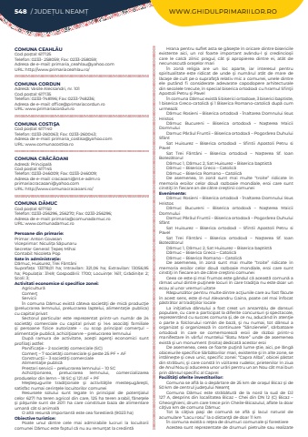548 / JUDE%u021aUL NEAM%u021a WWW.GHIDULPRIMARIILOR.ROCOMUNA CEAHL%u0102UCod po%u0219tal: 617125Telefon: 0233- 258059; Fax: 0233-258059; Adresa de e-mail: primaria_ceahlau@yahoo.comURL: http://www.primariaceahlau.ro/COMUNA CORDUNAdres%u0103: Vasile Alecsandri, nr. 101Cod po%u0219tal: 617135Telefon: 0233-748196; Fax: 0233-748236; Adresa de e-mail: office@primariacordun.roURL: www.primariacordun.roCOMUNA COSTI%u015eACod po%u0219tal: 617140Telefon: 0233-260063; Fax: 0233-260043; Adresa de e-mail: primaria_costisa@yahoo.comURL: www.comunacostisa.roCOMUNA CR%u0102C%u0102OANIAdres%u0103: Principal%u0103Cod po%u0219tal: 617145Telefon: 0233-246009; Fax: 0233-246009; Adresa de e-mail: cracaoani@nt.e-adm.roprimariacracaoani@yahoo.comURL: http://www.comunacracaoani.ro/COMUNA D%u0102MUCCod po%u0219tal: 617150Telefon: 0233-256296, 256270; Fax: 0233-256296; Adresa de e-mail: primaria@comunadamuc.roURL: www.comunadamuc.roPersoane din primarie:Primar: Anton CovasanViceprimar: Niculi%u021ba S%u0103punaruSecretar General: %u021aepe%u0219%u00a0MihaiContabil: Nicoleta PopSate %u00een administra%u021bie:D%u0103muc, Huisurez, Trei F%u00e2nt%u00e2niSuprafa%u021ba:%u00a0 13378,01 ha; Intravilan:%u00a0 321,06 ha; Extravilan:%u00a0 13056,95 ha; Popula%u021bia:%u00a0 3149; Gospod%u0103rii:%u00a0 1700; Locuin%u021be:%u00a0 1611; Gr%u0103dini%u021be:%u00a0 2; %u0218coli:%u00a03; Activitati economice si specifice zonei:Agricultur%u0103Comer%u0163Servicii%u00cen comuna D%u0103muc exist%u0103 c%u00e2teva societ%u0103%u0163i de mic%u0103 produc%u0163ie (prelucrarea lemnului, prelucrarea laptelui, alimenta%u0163ie publica) cu capital privatSectorul particular este reprezentat printr-un num%u0103r de 24 societ%u0103%u0163i comerciale cu capital privat %u015fi 144 asoci%u0103%u0163i familiale %u015fi persoane fizice autorizate - cu scop principal comer%u0163ul %u2013 alimenta%u0163ie public%u0103, achizi%u0163ioanre %u2013 prelucrarea lemnuluiDup%u0103 ramura de activitate, ace%u015fti agen%u0163i economici sunt profila%u0163i astfel:Panifica%u0163ie %u2013 2 societ%u0103%u0163i comerciale (SC)Comer%u0163 %u2013 7 societ%u0103%u0163i comerciale %u015fi peste 25 PF + AFConstruc%u0163ii %u2013 3 societ%u0103%u0163i comercialeAlimenta%u0163ie public%u0103Prestari servicii %u2013 prelucrarea lemnului %u2013 10 SCAchizi%u0163ionarea, prelucrarea lemnului, comercializarea produselor din lemn %u2013 18 SC %u015fi 121 AF + PFMe%u015fte%u015fugurile tradi%u0163ionale %u015fi activit%u0103%u0163ile meste%u015fug%u0103re%u015fti, satisfac numai cerin%u0163ele locuitorilor comuneiResursele solului sunt legate %u00een principal de poten%u0163ialul celor 6271 ha teren agricol din care, 125 ha teren arabil, f%u00e2ne%u0163ele %u015fi p%u0103%u015funile sunt de 2011 ha care constituie baza de alimentare uman%u0103 c%u00e2t si animal%u0103O alt%u0103 resurs%u0103 important%u0103 este cea forestier%u0103 (9023 ha)Obiective turistice:Poate unul dintre cele mai admirabile lucruri la locuitorii comunei D%u0103muc este faptul c%u0103 nu au renun%u0163at la credint%u0103Hrana pentru suflet asta se g%u0103se%u015fte %u00een oricare dintre bisericile existente aici, un rol foarte important av%u00e2ndu-l %u015fi credincio%u015fii care le calc%u0103 zilnic pragul, c%u00e2t %u015fi apropierea dintre ei, at%u00e2t de necunoscut%u0103 ora%u015felor mari%u00cen zon%u0103 religia are un loc aparte, iar interesul pentru spiritualitate este ridicat de unde %u015fi num%u0103rul at%u00e2t de mare de l%u0103ca%u015fe de cult pe o suprafa%u0163%u0103 relativ mic a comunei, unele dintre ele put%u00e2nd fi considerate adevarate capodopere arhitecturale din secolele trecute, %u00een special biserica ortodox%u0103 cu hramul Sfin%u0163ii Apostoli Petru %u015fi Pavel%u00cen comuna D%u0103muc exist%u0103 5 biserici ortodoxe, 3 biserici baptiste, 1 biserica Greco-catolic%u0103 %u015fi 1 Biserica Romano-catolic%u0103 dup%u0103 cum urmeaz%u0103:D%u0103muc Rosieni %u2013 Biserica ortodox%u0103 - %u00cenaltarea Domnului Iisus HristosD%u0103muc Bucureni %u2013 Biserica ortodox%u0103 %u2013%u00a0 Na%u015fterea Maicii Domnului%u00a0Damuc P%u00e2r%u00e2ul Fruntii %u2013 Biserica ortodox%u0103 %u2013%u00a0Pogor%u00e2rea Duhului Sf%u00e2nt%u00a0Sat Huisurez %u2013 Biserica ortodox%u0103 %u2013%u00a0 Sfintii Apostoli Petru si Pavel%u00a0Sat Trei F%u00e2nt%u00e2ni %u2013 Biserica ortodox%u0103 %u2013 Na%u015fterea Sf. Ioan Botez%u0103torulD%u0103muc 1, D%u0103muc 2, Sat Huisurez %u2013 Biserica baptist%u0103D%u0103muc %u2013 Biserica Greco %u2013 Catolic%u0103D%u0103muc %u2013 Biserica Romano %u2013 Catolic%u0103De asemenea, %u00een zon%u0103 sunt mai multe %u201ctroite%u201d ridicate %u00een memoria eroilor celor dou%u0103 razboaie mondiale, eroi care sunt cinsti%u0163i %u00een fiecare an de c%u0103tre cre%u015ftinii comuneiEvenimente:D%u0103muc Rosieni %u2013 Biserica ortodox%u0103 - %u00cenaltarea Domnului Iisus HristosD%u0103muc Bucureni %u2013 Biserica ortodox%u0103 %u2013%u00a0 Na%u015fterea Maicii Domnului%u00a0Damuc P%u00e2r%u00e2ul Fruntii %u2013 Biserica ortodox%u0103 %u2013%u00a0Pogor%u00e2rea Duhului Sf%u00e2nt%u00a0Sat Huisurez %u2013 Biserica ortodox%u0103 %u2013%u00a0 Sfintii Apostoli Petru si Pavel%u00a0Sat Trei F%u00e2nt%u00e2ni %u2013 Biserica ortodox%u0103 %u2013 Na%u015fterea Sf. Ioan Botez%u0103torulD%u0103muc 1, D%u0103muc 2, Sat Huisurez %u2013 Biserica baptist%u0103D%u0103muc %u2013 Biserica Greco %u2013 Catolic%u0103D%u0103muc %u2013 Biserica Romano %u2013 Catolic%u0103De asemenea, %u00een zon%u0103 sunt mai multe %u201ctroite%u201d ridicate %u00een memoria eroilor celor dou%u0103 razboaie mondiale, eroi care sunt cinsti%u0163i %u00een fiecare an de c%u0103tre cre%u015ftinii comuneiCeea ce este %u015fi mai frumos este g%u00e2ndul c%u0103 aceast%u0103 comun%u0103 a r%u0103mas unul dintre pu%u0163inele locuri %u00een care tradi%u0163ia nu este doar un ecou al unor vremuri uitateR%u0103spunz%u0103tor pentru multe dintre ac%u0163iunile care au fost f%u0103cut