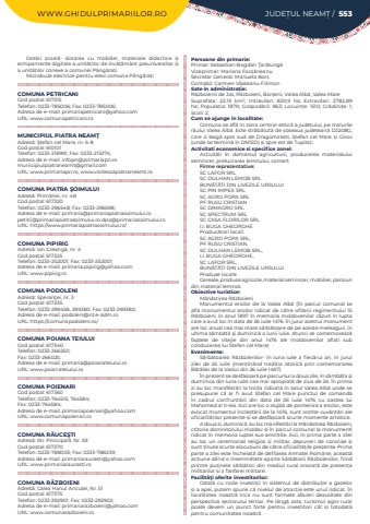 WWW.GHIDULPRIMARIILOR.RO JUDE%u021aUL NEAM%u021a / 553Dot%u0103ri %u0219coal%u0103- dotarea cu mobilier, materiale didactice %u0219i echipamente digitale a unit%u0103%u021bilor de %u00eenv%u0103%u021b%u0103m%u00e2nt preuniversitar %u0219i a unit%u0103%u021bilor conexe a comunei P%u00e2ng%u0103ra%u021biMicrobuze electrice pentru elevi comuna P%u00e2ng%u0103ra%u021biCOMUNA PETRICANICod po%u0219tal: 617315Telefon: 0233-785006; Fax: 0233-785006; Adresa de e-mail: primariapetricani@yahoo.comURL: www.comunapetricani.roMUNICIPIUL PIATRA NEAM%u0162Adres%u0103: %u015etefan cel Mare, nr. 6-8Cod po%u0219tal: 610101Telefon: 0233-218991; Fax: 0233-215374; Adresa de e-mail: infopn@primariapn.romunicipiulpiatraneamt@gmail.comURL: www.primariapn.ro, www.viziteazapiatraneamt.roCOMUNA PIATRA %u015eOIMULUIAdres%u0103: Prim%u0103riei, nr. 48Cod po%u0219tal: 617320Telefon: 0233-296548; Fax: 0233-296598; Adresa de e-mail: primaria@primariapiatrasoimului.ro petitii@primariapiatrasoimului.ro dpo@primariasoimului.roURL: https://www.primariapiatrasoimului.ro/COMUNA PIPIRIGAdres%u0103: Ion Creang%u0103, nr. 4Cod po%u0219tal: 617325Telefon: 0233-252001; Fax: 0233-252001; Adresa de e-mail: primaria.pipirig@yahoo.comURL: www.pipirig.roCOMUNA PODOLENIAdres%u0103: Speran%u0163ei, nr. 3Cod po%u0219tal: 617335Telefon: 0233-299458, 299380; Fax: 0233-299380; Adresa de e-mail: podoleni@nt.e-adm.roURL: https://comunapodoleni.ro/COMUNA POIANA TEIULUICod po%u0219tal: 617340Telefon: 0233-266250; Fax: 0233-266025; Adresa de e-mail: primaria@poianateiului.roURL: www.poianateiului.roCOMUNA POIENARICod po%u0219tal: 617360Telefon: 0233-764515, 764584; Fax: 0233-764584; Adresa de e-mail: primariapoienari@yahoo.comURL: www.comunapoienari.roCOMUNA R%u0102UCE%u015eTIAdres%u0103: Str. Principal%u0103, Nr. 59Cod po%u0219tal: 617370Telefon: 0233-788003; Fax: 0233-788239; Adresa de e-mail: primariaraucesti@yahoo.comURL: www.primariaraucesti.roCOMUNA R%u0102ZBOIENIAdres%u0103: Calea Hanul Ancu%u021bei, Nr. 51Cod po%u0219tal: 617375Telefon: 0233-292901; Fax: 0233-292902; Adresa de e-mail: primariarazboieni@yahoo.comURL: www.comunarazboieni.roPersoane din primarie:Primar: Sebastian-Bogdan %u0162ar%u0103lung%u0103Viceprimar: Mariana Foc%u0219%u0103neanuSecretar General: Manuela Bor%u0219Contabil: Carmen V%u0103ideanu-FilimonSate %u00een administra%u021bie:R%u0103zboienii de Jos, R%u0103zboieni, Bor%u0219eni, Valea Alb%u0103, Valea MareSuprafa%u021ba:%u00a0 22,19%u00a0 km%u00b2; Intravilan:%u00a0 820,9 ha; Extravilan:%u00a0 2782,89 ha; Popula%u021bia:%u00a01879; Gospod%u0103rii:%u00a0863; Locuin%u021be:%u00a01510; Gr%u0103dini%u021be:%u00a01; %u0218coli:%u00a02; Cum se ajunge in localitate:Comuna se afl%u0103 %u00een zona central-estic%u0103 a jude%u021bului, pe malurile r%u00e2ului Valea Alb%u0103. Este str%u0103b%u0103tut%u0103 de %u0219oseaua jude%u021bean%u0103 DJ208G, care o leag%u0103 spre sud de Dragomire%u0219ti, %u0218tefan cel Mare %u0219i Girov (unde se termin%u0103 %u00een DN15D) %u0219i spre est de Tupila%u021bi.Activitati economice si specifice zonei:Activit%u0103%u021bi %u00een domeniul agriculturii, producerea materialului semincer, prelucrarea lemnului, comertFirme reprezentative:SC LAFOR SRLSC DULHAN LEMOB SRLBUN%u0102T%u0102%u021aI DIN LIVEZILE URSULUISC PIN IMPEX SRLSC AGRO POPA SRLPF RUSU CRISTIANSC DIMAGRO SRLSC SPECTRUM SRLSC CASA FLORILOR SRLI.I. BUGA GHEORGHEProduc%u0103tori locali:SC AGRO POPA SRL,PF RUSU CRISTIAN, SC DULHAN LEMOB SRL,I.I. BUGA GHEORGHE,SC LAFOR SRL,BUN%u0102T%u0102%u021aI DIN LIVEZILE URSULUIProduse locale: Cereale, produse agricole, material semincer, mobilier, panouri din material lemnosObiective turistice:M%u0103n%u0103stirea R%u0103zboieniMonumentul eroilor de la Valea Alb%u0103 (%u00cen parcul comunal se afl%u0103 monumentul eroilor ridicat de c%u0103tre ofiterii regimentului 15 R%u0103zboieni, %u00een anul 1897 %u00een memoria moldovenilor c%u0103zuti %u00een lupta care a avut loc %u00een data de 26 iulie 1476. %u00cen jurul acestui monument are loc anual cea mai mare s%u0103rb%u0103toare de pe aceste meleaguri, %u00een ultima s%u00e2mb%u0103t%u0103 %u015fi duminic%u0103 a lunii iulie. Atunci se comemoreaz%u0103 faptele de vitejie din anul 1476 ale moldovenilor aflati sub conducerea lui Stefan cel Mare)Evenimente:S%u0103rb%u0103toarea R%u0103zboienilor- %u00een luna iulie a fiec%u0103rui an, %u00een jurul zilei de 26 iulie (men%u021bin%u00e2nd tradi%u021bia istoric%u0103 prin comemorarea B%u0103t%u0103liei de la Vaslui din 26 iulie 1467)%u00cen prezent se desf%u0103%u0219oar%u0103 pe parcursul a doua zile, %u00een s%u00e2mb%u0103ta %u0219i duminica din luna iulie cea mai apropiat%u0103 de ziua de 26. %u00cen prima zi au loc manifest%u0103ri la troi%u021ba ridicat%u0103 %u00een satul Valea Alb%u0103 unde se presupune c%u0103 ar fi avut %u0218tefan cel Mare punctul de comand%u0103 %u00een cadrul confrunt%u0103rii din data de 26 iulie 1476 cu oastea lui Mahomed al II-lea. Aici are loc o slujb%u0103 de pomenire a eroilor, este evocat momentul %u00eencle%u0219t%u0103rii de la 1476, sunt rostite cuv%u00e2nt%u0103ri ale oficialit%u0103%u021bilor prezente %u0219i se desf%u0103%u0219oar%u0103 scurte momente artistice. A doua zi, duminic%u0103, au loc manifest%u0103ri la M%u0103n%u0103stirea R%u0103zboieni, ctitoria domnitorului moldav %u0219i %u00een parcul comunal la monumentl ridicat %u00een memoria luptei sus-amintite. Aici, %u00een prima parte a zilei au loc un ceremonial religios %u0219i militar, depuneri de coronae %u0219i sunt %u021binute scurte alocu%u021biuni de c%u0103tre oficialit%u0103%u021bile prezente. Prima parte a zilei este %u00eencheiat%u0103 de defilarea Armatei Rom%u00e2ne, aceast%u0103 ac%u021biune d%u00e2nd o %u00eensemn%u0103tate aparte S%u0103rb%u0103torii R%u0103zboienilor, fiind printre pu%u021binele s%u0103rb%u0103tori din mediul rural onorat%u0103 de prezen%u021ba militarilor %u0219i a fanfarei militare.Facilit%u00e3%u0163i oferite investitorilor:Odat%u0103 cu noile investi%u02