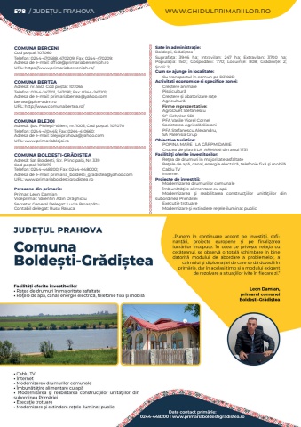 578 / JUDE%u021aUL PRAHOVA WWW.GHIDULPRIMARIILOR.ROCOMUNA BERCENICod po%u0219tal: 107060Telefon: 0244-470588, 470209; Fax: 0244-470209; Adresa de e-mail: office@primariaberceniph.roURL: https://www.primariaberceniph.ro/COMUNA BERTEAAdres%u0103: nr. 550; Cod po%u0219tal: 107065Telefon: 0244-247101, 247081; Fax: 0244-247101; Adresa de e-mail: primariabertea@yahoo.combertea@ph.e-adm.roURL: http://www.comunabertea.ro/COMUNA BLEJOIAdres%u0103: %u015eos. Ploie%u015fti-V%u0103leni, nr. 1003; Cod po%u0219tal: 107070Telefon: 0244-410445; Fax: 0244-410660; Adresa de e-mail: blejoiprahova@yahoo.comURL: www.primariablejoi.roCOMUNA BOLDE%u015eTI-GR%u0102DI%u015eTEAAdres%u0103: Sat Bolde%u0219ti, Str. Principal%u0103, Nr. 339Cod po%u0219tal: 107075Telefon: 0244-448200; Fax: 0244-448000; Adresa de e-mail: primaria_boldesti_gradistea@yahoo.comURL: www.primariaboldestigradistea.roPersoane din primarie:Primar: Leon DamianViceprimar: Valentin Adin Dr%u0103ghiciuSecretar General Delegat: Lucia Proasp%u0103tuContabil delegat: Rusu RalucaSate %u00een administra%u021bie:Bolde%u015fti, Gr%u0103di%u015fteaSuprafa%u021ba:%u00a0 3946 ha; Intravilan:%u00a0 247 ha; Extravilan:%u00a0 3700 ha; Popula%u021bia:%u00a0 1501; Gospod%u0103rii:%u00a0 770; Locuin%u021be:%u00a0 808; Gr%u0103dini%u021be:%u00a0 2; %u0218coli:%u00a02; Cum se ajunge in localitate:Cu transportul %u00een comun pe DJ102DActivitati economice si specifice zonei:Cre%u0219tere animalePiscicultur%u0103Cre%u0219tere %u0219i abatorizare ra%u021beAgricultur%u0103Firme reprezentative:AgroDuet StefanescuSC Fishplan SRLPFA Vasile Viorel CornelSocietatea Agricol%u0103%u00a0CioraniPFA Stefanescu Alexandru, SA Palensia GrupObiective turistice:POPINA MARE , LA C%u0102RPMIDARIECrucea de piatr%u0103%u00a0LA%u00a0 ARMANI din anul 1731Facilit%u00e3%u0163i oferite investitorilor:Re%u0163ea de drumuri %u00een majoritate asfaltateRe%u0163ele de ap%u0103, canal, energie electric%u0103, telefonie fix%u0103 %u015fi mobil%u0103Cablu TV InternetProiecte de investi%u0163ii:Modernizarea drumurilor comunale%u00cembun%u0103t%u0103%u0163ire alimentare cu ap%u0103Modernizarea %u015fi reabilitarea construc%u0163iilor unit%u0103%u0163iilor din subordinea Prim%u0103rieiExecu%u0163ie trotuare Modernizare %u015fi extindere re%u0163ele iluminat public