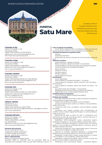 WWW.GHIDULPRIMARIILOR.RO 591Suprafa%u021b%u0103: 4.418 km%u00b2Popula%u021bie: 392.265 locuitoriRe%u0219edin%u021b%u0103 de jude%u021b: Satu MarePopula%u021bia re%u0219edin%u021bei de jude%u021b: 130.573 locuitoriJUDE%u021aULSatu MareCOMUNA AC%u00c2%u015eAdres%u0103: Principal%u0103, nr. 129Cod po%u0219tal: 417015Telefon: 0261-871002; Fax: 0261-871002; Adresa de e-mail: primariaacas@yahoo.comURL: https://www.primariaacas.ro/COMUNA AGRI%u015eAdres%u0103: Cs%u0171ry B%u00e1lint, nr. 68Cod po%u0219tal: 447066Telefon: 0261-878111;Fax: 0261-878111; Adresa de e-mail: primaria@comunaagris.roURL: www.primariaagris.roCOMUNA ANDRIDAdres%u0103: Principal%u0103, nr. 508Cod po%u0219tal: 447010Telefon: 0261-820409, 820491; Fax: 0261-820492; Adresa de e-mail: primariaandrid@yahoo.comURL: www.primariaandrid.roCOMUNA APAAdres%u0103: Principal%u0103, nr. 132Cod po%u0219tal: 447015Telefon: 0261-843001, 843366; Fax: 0261-843001; Adresa de e-mail: primaria.apa@gmail.comprimaria_apa@yahoo.comURL: www.primaria-apa.euORA%u0218UL ARDUDAdres%u0103: Noua, nr. 1Cod po%u0219tal: 447020Telefon: 0261-767130; Fax: 0261-771016; Adresa de e-mail: primaria@orasardud.ro, ardud@sm.e-adm.roURL: www.orasardud.roCOMUNA B%u0102TARCIAdres%u0103: Principal%u0103, nr. 50Cod po%u0219tal: 447030Telefon: 0261-837024, 837026; Fax: 0261-837024; Adresa de e-mail: primaria_batarci@yahoo.comURL: www.primariabatarci.roPersoane din primarie:Primar: Vasile Adrian TomaViceprimar: Grigore Viorel MoneContabil: Szilagy Istvan RobertSecretar: Sabo Ecaterina RamonaSate %u00een administra%u021bie:B%u0103tarci, Coml%u0103u%u015fa, T%u0103m%u0103%u015feni, %u015eirl%u0103uSuprafa%u021ba:%u00a0 5992 ha; Intravilan:%u00a0 2310 ha; Extravilan:%u00a0 3682 ha; Popula%u021bia:%u00a03741; Gospod%u0103rii:%u00a01492; Locuin%u021be:%u00a01353; Gr%u0103dini%u021be:%u00a04; %u0218coli:%u00a03; Cum se ajunge in localitate:De pe drumul Na%u021bional E81 %u00een localitatea Halmeu se trece pe drumul jude%u021bean DJ109 M care traverseaz%u0103%u00a0Comuna B%u0103tarciActivitati economice si specifice zonei:Comer%u0163Exploata%u0163ii forestiere Producerea de rachiuri naturale din fructe sub denumirea de %u0163uic%u0103Obiective turistice:Dealul Cet%u0103%u021buia %u2013 Cetatea lui Tama%u0219Biserica de piatr%u0103 %u201eBiserica Nem%u021bilor%u201d strada Nem%u021biVia ferat%u0103%u00a0B%u0103tarci Cimitirul Evreiesc din localitatea Coml%u0103u%u0219aCimitirul Evreiesc din localitatea T%u0103m%u0103%u0219eniPiatra CerbuluiF%u00e2nt%u00e2na lui Sarc%u0103F%u00e2nt%u00e2na LupuluiF%u00e2nt%u00e2na CerbuluiDealul M%u0103gura ComoaraEvenimente:Nunt%u0103 O%u0219%u0103neasc%u0103Hramul Bisericii Ortodoxe din B%u0103tarci %u2013 15 AugustHramul Bisericii Ortodoxe %u201eSf%u00e2ntul Dumitru%u201d din Coml%u0103u%u0219a %u2013 26 octombrieHramul Bisericii Ortodoxe %u201eSfin%u021bii Trei Ierarhi%u201d din %u0218irl%u0103u %u2013 30 ianuarieZiua reforma%u021bilor din T%u0103m%u0103%u0219eni %u2013 31 octombrieS%u0103rb%u0103toarea nun%u021bii de aur pentru 50 de ani de c%u0103s%u0103torieT%u00e2rg de %u021bar%u0103 lunar %u00een ultima s%u0103pt%u0103m%u00e2n%u0103 din lun%u0103Facilit%u00e3%u0163i oferite investitorilor:Locuri frumoase ,dealuri acoperite de p%u0103dureProiecte de investi%u0163ii:Extindere re%u021bele de alimentare cu ap%u0103%u00a0%u0219i canalizare menajer%u0103%u00a0%u00een comuna B%u0103tarci, jude%u021bul%u00a0Satu MareRe%u021beaua de canalizare menajer%u0103 a comunei B%u0103tarciConstruire sal%u0103%u00a0de sport %u0219colar%u0103, sat. B%u0103tarci, comuna B%u0103tarci, jude%u021bul Satu MareConstruire cre%u021b%u0103%u00a0 mic%u0103- sat B%u0103tarci, comuna B%u0103tarci, jude%u021bul Satu Mare%u00cenfiin%u021barea unui sistem ecologic prin achizi%u021bionarea de mobilier urban %u0219i sistem digital de transport %u00een comuna B%u0103tarci, jude%u021bul%u00a0Satu MareReducerea de gaze cu efect de ser%u0103 %u00een transporturi prin %u00eenfiin%u021barea de sta%u021bii de re%u00eenc%u0103rcare pentru vehicule electrice %u00een comuna B%u0103tarci, jude%u021bul%u00a0Satu MareReabilitare termo-energetic%u0103%u00a0 %u0219coala gimnazial%u0103%u00a0 B%u0103tarci localitatea%u00a0T%u0103m%u0103%u0219eni, nr. 78, comuna%u00a0B%u0103tarci, jude%u021bul%u00a0Satu MareCre%u0219terea eficien%u021bei energetice a infrastructurii de iluminat public %u00een comuna B%u0103tarci, localit%u0103%u021bile B%u0103tarci, Coml%u0103u%u0219a, %u0218irl%u0103u %u0219i T%u0103m%u0103%u0219eni, jude%u021bul%u00a0Satu MareAsigurarea energiei din surse regenerabile pentru consumul propriu al comunei B%u0103tarci, jude%u021bul Satu MareDotarea cu mobilier, materiale didactice %u0219i echipamente digitale a %u0219colii gimnaziale B%u0103tarci %u0219i a structurilor aferenteReabilitare, modernizare %u0219i dotare %u0219coala general%u0103 cu clasele I-VIII, sat B%u0103tarci, comuna B%u0103tarci, jude%u021bul Satu MareReabilitare, modernizare cl%u0103dire- sediu prim%u0103rie %u0219i anexe, sat B%u0103tarci, comuna B%u0103tarci, jude%u021bul Satu MareReabilitarea %u0218colii gimnaziale B%u0103tarci , localitatea B%u0103tarci,