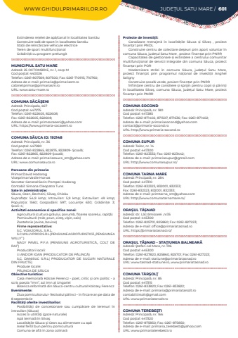 WWW.GHIDULPRIMARIILOR.RO JUDE%u021aUL SATU MARE / 601Extinderea re%u021belei de ap%u0103/canal %u00een localitatea%u00a0Sant%u0103uConstruire sal%u0103%u00a0de sport %u00een localitatea%u00a0Sant%u0103uSta%u021bii de re%u00eenc%u0103rcare vehicule electriceTeren de sport multifunc%u021bional Gr%u0103dini%u021b%u0103 cu program prelungitMUNICIPIUL SATU MAREAdres%u0103: 25 OCTOMBRIE, nr. 1, corp MCod po%u0219tal: 440026Telefon: 0261-807569, 807500; Fax: 0261-710915, 710760; Adresa de e-mail: primaria@primariasm.rocabinetprimar@primariasm.roURL: www.satu-mare.roCOMUNA S%u0102C%u0102%u015eENIAdres%u0103: Principala, 467Cod po%u0219tal: 447275Telefon: 0261-822605, 822608; Fax: 0261-822605, 822608; Adresa de e-mail: primsacaseni@yahoo.comURL: https://www.primaria-sacaseni.roCOMUNA S%u0102UCA ID: 192148Adres%u0103: Principal%u0103, nr. 36Cod po%u0219tal: 447280Telefon: 0261-822865, 822875, 822809- %u015ecoal%u0103; Fax: 0261-822865, 822809-%u015ecoal%u0103; Adresa de e-mail: primariasauca_sm@yahoo.comURL: www.comunasauca.roPersoane din primarie:Primar:David HodorogViceprimar:Vasile Horvat%u00a0Secretar General:Sorin-Pompei Hodorog%u00a0Contabil: Simona Cleopatra Tuns%u00a0Sate %u00een administra%u021bie:S%u0103uca, Cean, Becheni, Silva%u015f, Chis%u0103uSuprafa%u021ba:%u00a0 54,9 kmp; Intravilan:%u00a0 5,9 kmp; Extravilan:%u00a0 49 kmp; Popula%u021bia:%u00a0 1560; Gospod%u0103rii:%u00a0 597; Locuin%u021be:%u00a0 630; Gr%u0103dini%u021be:%u00a0 3; %u0218coli:%u00a04; Activitati economice si specifice zonei:Agricultur%u0103 (cultura gr%u00e2ului, porumb, floarea soarelui, rapi%u0163%u0103)Pomicultur%u0103 (m%u0103r, prun, cire%u015f, vi%u015fin, cais)Zootehnie (ovine, bovine)Firme reprezentative:S.C. VOIAJORUL. S.R.L.S.C.WILLY PROD S.R.L (PENSIUNE AGROTURISTIC%u0102%u00a0%u201ePENSIUNEA WILLY%u201d )NAGY PAVEL P.F.A (PENSIUNE AGROTURISTIC%u0102%u201e COL%u021a DE RAI%u201d)Produc%u0103tori locali:I.I ANDOR IOAN (PRODUCATOR DE P%u0102LINC%u0102) S.C. DANISUC S.R.L( PRODUCATOR DE SUCURI NATURALE DIN FRUCTE)Produse locale: P%u0102LINCA DE S%u0102UCAObiective turistice:Casa memorial%u0103 K%u00f6lcsei Ferencz - poet, critic %u015fi om politic - a scris poezia %u201cImn%u201d, azi imn al UngarieiBiserica reformat%u0103 din S%u0103uca-centru cultural Kolcsey FerenczEvenimente:Ziua pomicultorului- festivalul p%u0103linci %u2013 %u00een fircare an pe data de 8 septembrieFacilit%u00e3%u0163i oferite investitorilor:Posibilit%u0103%u0163i de concesionare sau cump%u0103rare de terenuri %u00een intravilan (S%u0103uca)Acces la utilit%u0103%u0163i (gaze naturale)Ap%u0103 termal%u0103 %u00een Silva%u015fLocalit%u0103%u0163ile S%u0103uca %u015fi Cean au alimentare cu ap%u0103Areal fertil bun pentru pomicultur%u0103Comuna se afl%u0103 %u00een zona colinar%u0103Proiecte de investi%u0163ii:Canalizare menajer%u0103 %u00een localit%u0103%u021bile S%u0103uca %u0219i Silva%u0219 , proiect finan%u021bat prin PNDLConstruire centru de colectare de%u0219euri prin aport voluntar %u00een comuna S%u0103uca, jude%u021bul Satu Mare , proiect finan%u021bat prin PNRRCapacitatea de gestionare %u0219i extindere a centrului comunitar multifunc%u021bional de servicii integrate din comuna S%u0103uca, proiect finan%u021bat prin PORModernizare str%u0103zi %u00een comuna S%u0103uca, jude%u021bul Satu Mare, proiect finan%u021bat prin programul na%u021bional de investi%u021bii Anghel SalignyConstruire %u0219coal%u0103%u00a0verde, proiect finan%u021bat prin PNRR %u00cenfiin%u021bare centru de consiliere %u0219i sprijin pentru copii %u0219i p%u0103rin%u021bi %u00een localitatea Silva%u0219, comuna S%u0103uca, jude%u021bul Satu Mare, proiect finan%u021bat prin PNRRCOMUNA SOCONDAdres%u0103: Principal%u0103, nr. 180Cod po%u0219tal: 447285Telefon: 0261-871402, 871507, 871636; Fax: 0261-871402; Adresa de e-mail: primariasocond@yahoo.comcontact@primaria-socond.roURL: http://www.primaria-socond.roCOMUNA SUPUR Adres%u0103: Teilor, nr. 14Cod po%u0219tal: 447300Telefon: 0261-823332; Fax: 0261-823442; Adresa de e-mail: primariasupur@gmail.comURL: http://www.comunasupur.ro/COMUNA TARNA MAREAdres%u0103: Principal%u0103, nr. 284Cod po%u0219tal: 447310Telefon: 0261-832323, 832001, 832333; Fax: 0261-832323, 832001, 832333; Adresa de e-mail: primtarna_sm@yahoo.comURL: http://www.comunatarnamare.ro/ORA%u0218UL T%u0102%u0218NADAdres%u0103: str. L%u0103cr%u0103mioarei ,nr35Cod po%u0219tal: 445300Telefon: 0261-825701, 825860; Fax: 0261-827223; Adresa de e-mail: office@primariatasnad.roURL: https://primariatasnad.ro/ORA%u0218UL T%u0102%u015eNAD - STA%u0162IUNEA BALNEAR%u0102Adres%u0103: %u015etefan cel Mare, nr. 106Cod po%u0219tal: 445300Telefon: 0261-827820, 825860, 825701; Fax: 0261-827223; Adresa de e-mail: statiune@primariatasnad.roURL: www.tasnad-statiune.ro, www.primariatasnad.roCOMUNA T%u00c2R%u015eOL%u0162Adres%u0103: Principal%u0103, nr. 85Cod po%u0219tal: 447315Telefon: 0261-833820; Fax: 0261-833822; Adresa de e-mail: primaria@primariatarsolt.rocontabil.tirsolt@gmail.comURL: www.primariatarsolt.roCOMUNA TEREBE%u015eTIAdres%u0103: Principal%u0103, nr. 166Cod po%u0219tal: 447320Telefon: 0261-875850; Fax: 0261-875850; Adresa de e-mail: primaria_terebesti@yahoo.comURL: www.primariaterebesti.ro