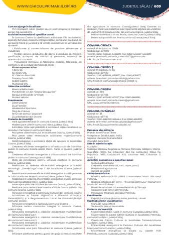 WWW.GHIDULPRIMARIILOR.RO JUDE%u021aUL S%u0102LAJ / 609Cum se ajunge in localitate:Prin transport rutier (public sau %u00een cont propriu) %u0219i transport aerian (tip aerodrom)Activitati economice si specifice zonei:%u00cen comuna Crasna %u00ee%u0219i desf%u0103%u0219oar%u0103 activitatea 178 de societ%u0103%u021bi, asocia%u021bii familiare respectiv %u00eentreprinz%u0103tori particulari cu statut de persoan%u0103 fizic%u0103 %u0219i juridic%u0103 %u0219i 12 unit%u0103%u021bi economice %u00een urm%u0103toarele domenii:- Fabricarea %u0219i comercializarea de produse alimentare %u0219i industriale-%u00a0 Prest%u0103ri servicii, produc%u021bie de p%u00e2ine %u0219i produse de mor%u0103rit, panifica%u021bie, transport de m%u0103rfuri %u0219i persoane, repara%u021bii de aparatur%u0103 %u0219i uz casnic-%u00a0 Prelucrarea lemnului %u0219i fabricarea mobilei, fabricarea de confec%u021bii %u0219i de produse din fibr%u0103 de sticl%u0103Firme reprezentative:Fibrex CoSC Kiraly SRLSC Olecom Prod SRLDimeny Granit SRLeL&Be Gastro Multiprod SRLObiective turistice:Biserica Reformat%u0103Pivni%u021bele de vin din %u201cDealul Strugurilor%u201dBarajul artificial de la V%u00eer%u0219ol%u021b Muzeul satuluiEvenimente:Zilele CrasneiZiua FamilieiWeekendul SportuluiT%u00e2rg de Cr%u0103ciunSeruri de dansuri populare Ziua B%u0103rba%u021bilor din CrasnaProiecte de investi%u0163ii:Hal%u0103%u00a0agroalimentara%u0103 %u00een comuna Crasna, jude%u021bul S%u0103lajModernizare uli%u021be %u00een comuna Crasna, jude%u021bul S%u0103lajExtindere re%u021bea ap%u0103%u00a0potabil%u0103%u00a0%u0219i extindere re%u021bea canalizare cu racorduri menajere %u00een comuna CrasnaPod peste valea Marinului %u00een localitatea Crasna, jude%u021bul S%u0103lajPod peste valea Mortauta,%u00een localitatea Hu%u0219eni,comuna Crasna, jude%u021bul S%u0103lajRetehnologizare %u0219i extindere sta%u021bie de epurare %u00een localitatea Crasna, jude%u021bul S%u0103lajCre%u0219terea eficien%u021bei energetice a infrastructurii de ilumimat public %u00een comuna Crasna-satele Marin, Ratin, %u0219i Huseni, jude%u021bul S%u0103lajCre%u0219terea eficien%u021bei energetice a infrastructurii de iluminat poblic %u00een comuna Crasna,jude%u021bul S%u0103lajSta%u021bii de re%u00eenc%u0103rcare pentru vehicule electrice %u00een comuna Crasna, jude%u021bul S%u0103lajReabilitare %u00een vederea eficientiz%u0103rii energetice a liceului tehnologic %u201eCserei-Goga%u201d-corp C din localitatea Crasna, jude%u021bul S%u0103lajReabilitare %u00een vederea eficientiz%u0103rii energetice a %u0219colii generale nr.1 din localitatea Hu%u0219eni,comuna Crasna, jude%u021bul S%u0103lajReabilitare %u00een vederea eficientiz%u0103rii energetice a %u0219colii generale Marin,din localitatea Marin, jude%u021bul S%u0103lajAmenajare pista de biciclete %u00een comuna Crasna, jude%u021bul S%u0103lajRealizare pista de biciclete %u00eentre localit%u0103%u021bile Crasna %u0219i Ratin din comuna Crasna, jude%u021bul S%u0103lajRenovare energetic%u0103%u00a0a C%u0103minului Cultural din comuna CrasnaActualizare %u00een format digital/GIS a Planului Urbanistic General(PUG) %u0219i a Regulamentului Local de Urbanism(RLU)al comunei CrasnaRenovare energetic%u0103%u00a0a Spitalului comunal Crasna%u00cenfiin%u021bare centru comunitar integrat %u00een comuna Crasna, jude%u021bul S%u0103lajRenovarea energetic%u0103%u00a0 a cl%u0103dirilor reziden%u021biale multifamiliale din comuna Crasna-Lot 1Renovarea energetic%u0103%u00a0 a cl%u0103dirilor reziden%u021biale multifamiliale din comuna Crasna-Lot 2Renovarea energetic%u0103%u00a0 a cl%u0103dirilor reziden%u021biale multifamiliale din comuna Crasna-Lot 3Construirea unui parc fotovoltaic %u00een comuna Crasna, jude%u021bul S%u0103laj%u00cenfiin%u021bare platforma pentru gunoi de grajd %u0219i resturi rezultate din agricultura in comuna Crasna,judetul Salaj Dotarea cu mobilier ,materiale didactice si echipamente digitale ale unit%u0103%u021bilor de %u00eenv%u0103%u021b%u0103m%u00e2nt preuniversitar din comuna Crasna, jude%u021bul S%u0103lajModernizare str%u0103zi %u00een sat. Marin, comuna Crasna, jude%u021bul S%u0103lajRe%u021bea ap%u0103%u00a0potabil%u0103%u00a0sat Marin,comuna Crasna jue%u021bul S%u0103lajCOMUNA CREACAAdres%u0103: Principal%u0103, nr. 179/BCod po%u0219tal: 457090Telefon: 0260-646557, 646509; Fax: 0260-646557, 646509; Adresa de e-mail: primaria_creaca2017@yahoo.comURL: https://comunacreaca.ro/COMUNA CRISTOL%u0162Adres%u0103: Principal%u0103, nr. 84Cod po%u0219tal: 457100Telefon: 0260-635958, 635977; Fax: 0260-635977; Adresa de e-mail: primariacristolt@yahoo.comURL: https://e-comune.ro/primaria-cristolt-sjCOMUNA CRI%u015eENIAdres%u0103: nr. 304Cod po%u0219tal: 457105Telefon: 0260-610480, 611527; Fax: 0360-566995; Adresa de e-mail: primaria.criseni@gmail.comURL: www.primariacriseni.roCOMUNA CUZ%u0102PLACAdres%u0103: nr. 33Cod po%u0219tal: 457110Telefon: 0260-626300, 626464; Fax: 0260-626300; Adresa de e-mail: primariacuzaplac@yahoo.comURL: https://www.primariacuzaplac.ro/Persoane din primarie:Primar:%u00a0Ionel Florin%u00a0%u0162%u00e2rleaViceprimar: Jakab Laszlo Attila%u00a0Secretar General:%u00a0Mariana%u00a0Ni%u0163%u0103%u00a0Contabil: Safar EditSate %u00een administra%u021bie:Cuz%u0103plac, Cuble%u015fu,%u00a0Stoboru,%u00a0Ruginoasa,%u00a0T%u0103ma%u015fa,%u00a0Petrindu,%u00a0G%u0103l%u0103%u015feni, Mier%u0163aSuprafa%u021ba:%u00a0 10914 ha; Intravilan:%u00a0 360 ha; Extravilan:%u00a0 10554 ha; Popula%u021bia:%u00a0 1853; Gospod%u0103rii:%u00a0 925; Locuin%u021be:%u00a0 985; Gr%u0103dini%u021be:%u00a0 3; %u0218coli:%u00a03; Activitati economice si specifice zonei:Cultura p%u0103m%u00e2ntuluiCre%u0219terea animalelor (oi, vaci, capre, porci)Predomin%u0103 agriculturaCarier%u0103 de piatr%u0103Obiective turistice:Biserica reformat%u0103 din piatr%u0103 - monument istoric din satul PetrinduBiserica ortodox%u0103 din lemn - %u2018%u2019%u00cenvierea Domnului%u2019%u2019%u00a0monument istoric din satul Cuble%u015fuBisericil