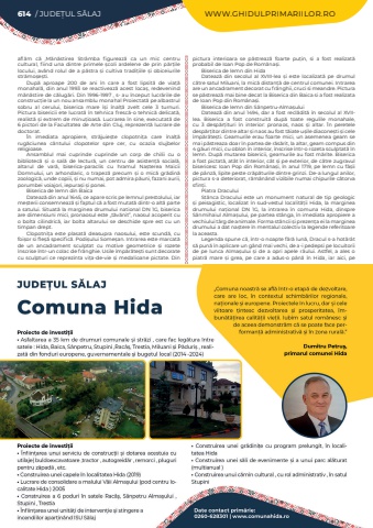 614 / JUDE%u021aUL S%u0102LAJ WWW.GHIDULPRIMARIILOR.ROafl%u0103m c%u0103 ,M%u0103n%u0103stirea Str%u00e2mba figureaz%u0103 ca un mic centru cultural, fiind una dintre primele %u0219coli ardelene de prin p%u0103r%u021bile locului, av%u00e2nd rolul de a p%u0103stra %u0219i cultiva tradi%u021biile %u0219i obiceiurile str%u0103mo%u0219e%u0219ti.Dup%u0103 aproape 200 de ani %u00een care a fost lipsit%u0103 de via%u021b%u0103 monahal%u0103, din anul 1993 se reactiveaz%u0103 acest loca%u0219, redevenind m%u0103n%u0103stire de c%u0103lug%u0103ri. Din 1996-1997 , s- au %u00eenceput lucr%u0103rile de construc%u021bie la un nou ansamblu monahal Proiectat%u0103 pe albastrul sobru al cerului, biserica mare %u00ee%u0219i %u00eenal%u021b%u0103 zvelt cele 3 turnuri. Pictura bisericii ete lucrat%u0103 %u00een tehnica fresc%u0103-o tehnic%u0103 delicat%u0103, realist%u0103 %u0219i extrem de minu%u021bioas%u0103. Lucrarea %u00een sine, executat%u0103 de 6 pictori de la Facultatea de Arte din Cluj, reprezent%u0103 lucrare de doctorat.%u00cen imediata apropiere, str%u0103juie%u0219te clopotni%u021ba care %u00eenal%u021b%u0103 rug%u0103ciunea c%u00e2ntului clopotelor spre cer, cu ocazia slujbelor religioase.Ansamblul mai cuprinde cuprinde un corp de chilii cu o bibliotec%u0103 %u0219i o sal%u0103 de lectur%u0103, un centru de asisten%u021b%u0103 social%u0103, altarul de var%u0103, biserica-paraclis cu hramul Na%u0219terea Maicii Domnului, un arhondaric, o trapez%u0103 precum %u0219i o mic%u0103 gr%u0103din%u0103 zoologic%u0103, unde copiii, %u0219i nu numai, pot admira p%u0103uni, fazani aurii, porumbei voiajori, iepura%u0219i %u0219i ponei.Biserica de lemn din BaicaDateaz%u0103 din anul 1645, ce apare scris pe lemnul prestolului, iar me%u0219terii consemneaz%u0103 %u0219i faptul c%u0103 a fost mutat%u0103 dintr-o alt%u0103 parte a satului. Situat%u0103 la marginea drumului national DN 1G, biserica are dimensiuni mici, pronaosul este %u201et%u0103v%u0103nit%u201d, naosul acoperit cu o bolta cilindric%u0103, iar bolta altarului se deschide spre est cu un timpan drept.Clopotni%u021ba este plasat%u0103 deasupra naosului, este scund%u0103, cu foi%u0219or si fle%u0219%u0103 specific%u0103. Podi%u0219ului Some%u0219an. Intrarea este marcat%u0103 de un ancadrament sculptat cu motive geometrice %u0219i rozete %u00eenscrise %u00eentr-un colac de fr%u00e2nghie. Usile %u00eemp%u0103r%u0103te%u0219ti sunt decorate cu sculpturi ce reprezinta vi%u021ba-de-vie %u0219i medalioane pictate. Din pictura interioara se p%u0103streaz%u0103 foarte pu%u021bin, si a fost realizat%u0103 probabil de Ioan Pop de Rom%u00e2na%u0219i.Biserica de lemn din HidaDateaz%u0103 din secolul al XVIII-lea %u0219i este localizat%u0103 pe drumul c%u0103tre satul Miluani, la mic%u0103 distan%u021b%u0103 de centrul comunei. Intrarea are un ancadrament decorat cu fr%u00e2nghii, cruci si meandre. Pictura se p%u0103streaz%u0103 mai bine decat la Biserica din Baica si a fost realizata de Ioan Pop din Rom%u00e2na%u0219i.Biserica de lemn din S%u00e2npetru-Alma%u0219uluiDateaz%u0103 din anul 1494, dar a fost recl%u0103dit%u0103 %u00een secolul al XVIIlea. Biserica a fost construit%u0103 dup%u0103 toate regulile monahale, cu 3 desp%u0103r%u021bituri %u00een interior: pronaos, naos %u0219i altar. %u00cen peretele desp%u0103r%u021bitor dintre altar %u0219i naos au fost t%u0103iate u%u0219ile diacone%u0219ti %u0219i cele %u00eemp%u0103r%u0103te%u0219ti. Geamurile erau foarte mici, un asemenea geam se mai p%u0103streaza doar %u00een partea de r%u0103s%u0103rit, la altar, geam compus din 4 g%u0103uri mici, cu oblon %u00een interior, %u00eenscrise %u00eentr-o rozeta sculptat%u0103 %u00een lemn. Dup%u0103 mutarea bisericii, geamurile au fost m%u0103rite. Biserica a fost pictat%u0103, at%u00e2t %u00een interior, c%u00e2t %u0219i pe exterior, de c%u0103tre zugravul bisericesc Ioan Pop din Rom%u00e2na%u0219i, %u00een anul 1719, pe lemn cu f%u00e2%u0219ii de p%u00e2nz%u0103, lipite peste cr%u0103p%u0103turile dintre grinzi. De-a lungul anilor, pictura s-a deteriorat, r%u0103m%u00e2n%u00e2nd vizibile numai chipurile c%u00e2torva sfin%u021bi.Piatra DraculuiSt%u00e2nca Dracului este un monument natural de tip geologic %u0219i peisagistic, localizat %u00een sud-vestul localit%u0103%u021bii Hida, la marginea drumului na%u021bional DN 1G, la intrarea %u00een comuna Hida, dinspre S%u00e2nmihaiul Alma%u0219ului, pe partea st%u00e2nga, %u00een imediata apropiere a vechiului t%u00e2rg de animale. Forma st%u00e2ncii %u0219i prezen%u021ba ei la marginea drumului a dat na%u0219tere %u00een mentalul colectiv la legende referitoare la aceasta.Legenda spune c%u0103, %u00eentr-o noapte f%u0103r%u0103 lun%u0103, Dracul s-a hot%u0103r%u00e2t s%u0103 pun%u0103 %u00een aplicare un g%u00e2nd mai vechi, de a-i pedepsi pe locuitorii de pe lunca Alma%u0219ului %u0219i de a opri apele r%u00e2ului. Astfel, a ales o piatr%u0103 mare %u0219i grea, pe care a adus-o p%u00e2n%u0103 %u00een Hida, iar aici, pe