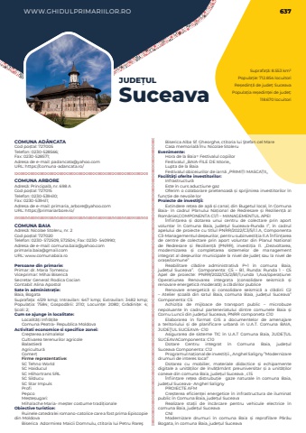 WWW.GHIDULPRIMARIILOR.RO 637Suprafa%u021b%u0103: 8.553 km%u00b2Popula%u021bie: 712.854 locuitoriRe%u0219edin%u021b%u0103 de jude%u021b: SuceavaPopula%u021bia re%u0219edin%u021bei de jude%u021b: 118.670 locuitoriJUDE%u021aULSuceavaCOMUNA AD%u00c2NCATACod po%u0219tal: 727005Telefon: 0230-528566; Fax: 0230-528571; Adresa de e-mail: padancata@yahoo.comURL: https://comuna-adancata.ro/COMUNA ARBOREAdres%u0103: Principal%u0103, nr. 698 ACod po%u0219tal: 727015Telefon: 0230-539410; Fax: 0230-539411; Adresa de e-mail: primaria_arbore@yahoo.comURL: https://primariarbore.ro/COMUNA BAIAAdres%u0103: Nicolae Stoleru, nr. 2Cod po%u0219tal: 727020Telefon: 0230- 572509, 572504; Fax: 0230- 540990; Adresa de e-mail: comuna.baia@yahoo.comprimaria.baia@gmail.comURL: www.comunabaia.roPersoane din primarie:Primar: dr. Maria TomescuViceprimar: Mihai Biseric%u0103Secretar General: Rodica CocianContabil: Alina ApostolSate %u00een administra%u021bie:Baia, BogataSuprafa%u021ba:%u00a0 4129 kmp; Intravilan:%u00a0 647 kmp; Extravilan:%u00a0 3482 kmp; Popula%u021bia:%u00a0 7584; Gospod%u0103rii:%u00a0 2110; Locuin%u021be:%u00a0 2080; Gr%u0103dini%u021be:%u00a0 4; %u0218coli:%u00a02; Cum se ajunge in localitate:Localit%u0103%u021bi %u00eenfr%u0103%u021biteComuna Peatra- Republica MoldovaActivitati economice si specifice zonei:Cre%u015fterea animalelorCultivarea terenurilor agricoleBalastier%u0103Agricultur%u0103Comer%u021bFirme reprezentative:SC Tehno WorldSC HaiduculSC Hlihortrans SRLSC SilducuSC Star ImpulsProfiPepcoMe%u0219te%u0219ugari:Mihalache Maria- me%u0219ter costume tradi%u021bionaleObiective turistice:Ruinele catedralei romano-catolice care a fost prima Episcopie din MoldovaBiserica %u00a0Adormirea Maicii Domnulu, ctitoria lui Petru Rare%u015fBiserica Alba Sf. Gheorghe, ctitoria lui %u015etefan cel Mare Casa memorial%u0103 %u00cenv. Nicolae StoleruEvenimente:Hora de la Baia= Festivalul copiilorFestivalul ,,BAIA-FILE DE Istorie,,Lupta de la Baia Festivalul obiceiurilor de iarn%u0103 ,,PRIMI%u021aI MASCA%u021aII,,Facilit%u00e3%u0163i oferite investitorilor:Infrastructur%u0103Este %u00een curs aduc%u021biune gazOferim o colaborare prietenoas%u0103 %u0219i sprijinirea investitorilor %u00een func%u021bie de nevoile lorProiecte de investi%u0163ii:Extindere re%u021bea de ap%u0103 %u0219i canal, din Bugetul local, %u00een Comuna Baia- %u00een cadrul Planului Na%u021bional de Redresare %u0219i Rezilien%u021b%u0103 al Rom%u00e2niei,COMPONENTA C1/1 %u2013 MANAGEMENTUL APEI%u00cenfiin%u021barea %u0219i dotarea unui centru de colectare prin aport voluntar %u00een Comuna Baia, jude%u021bul Suceava-Runda I%u201d, %u00een cadrul apelului de proiecte cu titlul PNRR/2022/C3/S/I.1.A, Componenta C3-Managementul de%u0219eurilor, pentru subinvesti%u021bia I1.A %u00cenfiin%u021barea de centre de colectare prin aport voluntar din Planul National de Redresare %u0219i Rezilien%u021b%u0103%u00a0 (PNRR), investi%u021bia I1. %u201eDezvoltarea, modernizarea %u0219i completarea sistemelor de management integrat al de%u0219eurilor municipale la nivel de jude%u021b sau la nivel de ora%u0219e/comune%u201dReabilitare cl%u0103dire administrativ%u0103%u00a0 P+1 %u00een comuna Baia, jude%u021bul Suceava%u201d.%u00a0 Componenta: C5 %u2013 B1, Runda: Runda 1 - C5 Apel de proiecte: PNRR/2022/C5/2/B1/1,runda 1,Axa/opera%u021biune: Operatiunea Renovarea integrata (consolidare seismic%u0103%u00a0 %u0219i renovare energetic%u0103%u00a0moderat%u0103) a cl%u0103dirilor publiceRenovare energetic%u0103 %u0219i consolidare seismic%u0103 a cl%u0103dirii C2 %u2013 Atelier %u0219coal%u0103 din satul Baia, comuna Baia, jude%u021bul Suceava%u201d Componenta: C5Achizi%u021bia de mijloace de transport public %u2013 microbuze nepoluante %u00een cadrul parteneriatului dintre comunele Baia %u0219i Cornu Luncii din jude%u021bul Suceava, PNRR componeta C10Elaborarea %u00een format GIS a documentelor de amenajare a teritoriului %u0219i de planificare urban%u0103 in U.A.T. Comuna BAIA, JUDE%u0162UL SUCEAVA- C10Asigurarea de sisteme TIC %u00een U.A.T Comuna Baia, JUDE%u021aUL SUCEAVAComponenta: C10Dotare Centru integrat %u00een Comuna Baia, jude%u021bul Suceava%u00a0Componenta: C12Programul na%u021bional de investi%u021bii %u201e Anghel Saligny %u201dModernizare drumuri de interes local%u201dDotarea cu mobilier, materiale didactice %u0219i echipamente digitale a unit%u0103%u021bilor de %u00eenv%u0103%u021b%u0103m%u00e2nt preuniversitar %u0219i a unit%u0103%u021bilor conexe din comuna Baia, jude%u021bul Suceava%u00a0, c15%u00cenfiin%u021bare re%u021bea distrubu%u021bie%u00a0 gaze naturale %u00een comuna Baia, jude%u021bul Suceava- Anghel SalignyPROIECTE AFMCre%u0219terea eficien%u021bei energetice %u00een infrastructura de iluminat public %u00een Comuna Baia, jude%u021bul SuceavaRealizare sta%u021bii de %u00eenc%u0103rcare pentru vehicule electrice %u00een comuna Baia, jude%u021bul SuceavaCNIModernizare drumuri %u00een comuna Baia %u0219i reprofilare P%u00e2r%u00e2u Bogata, %u00een comuna Baia, jude%u021bul Suceava
