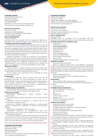 656 / JUDE%u021aUL SUCEAVA WWW.GHIDULPRIMARIILOR.ROCOMUNA OSTRAAdres%u0103: Stefan cel Mare nr.2Cod po%u0219tal: 727400Telefon: 0230-575268; Fax: 0230-575418; Adresa de e-mail: primaria_ostra@yahoo.comURL: https://www.primariacomuneiostra.ro/Persoane din primarie:Primar: Ioan Oro%u015fViceprimar: Viorica RobaniucSecretar General: Bogdan Sm%u0103r%u0103ndeanuContabil: Ghea%u0163%u0103 GeorgelSate %u00een administra%u021bie:Ostra, T%u0103rnicioaraSuprafa%u021ba:%u00a0 10153 ha; Intravilan:%u00a0 767, 50 a; Extravilan:%u00a0 9385, 50 ha; Popula%u021bia:%u00a03443; Gospod%u0103rii:%u00a01239; Locuin%u021be:%u00a01239; Gr%u0103dini%u021be:%u00a01; %u0218coli:%u00a01; Activitati economice si specifice zonei:Pe teritoriul comunei Ostra exist%u0103 importante resurse care au fost atrase %u00een circuitul productiv %u015fi anume: z%u0103c%u0103minte naturale de minereuri complexe (cupru, zinc, plumb), baritin%u0103 %u015fi lemn. For%u0163a de munc%u0103 specializat%u0103 disponibilizat%u0103 din sectorul minier, cadrul natural deosebit, al%u0103turi de ospitalitatea tradi%u021bional%u0103 bucovinean%u0103 %u015fi arhitectura gospod%u0103riilor din zon%u0103, se recomand%u0103 ca elemente de atractivitate pentru investitori Sistarea activit%u0103%u0163ilor miniere au contribuit ca pe teritoriul localit%u0103%u021bii s%u0103 existe active %u015fi capacit%u0103%u021bi de produc%u021bie disponibile, cu toate ultilit%u0103%u021bile necesare. Reprofilarea acestora spre alte activit%u0103%u0163i solicitate (crearea unor depozite, realizarea unor mici ateliere me%u015fte%u015fug%u0103re%u015fti, a unor ateliere de confec%u0163ionat mic mobilier din lemn...), ar reprezenta o valorificare profitabil%u0103 a acestor spa%u0163iiObiective turistice:Comuna Ostra nu posed%u0103 obiective turistice deosebite, dar pe teritoriul ei sunt numeroase gospod%u0103rii %u021b%u0103r%u0103ne%u015fti care ofer%u0103 condi%u021bii prielnice realiz%u0103rii agroturismului montan Fond cinegetic bine reprezentat, flora protejat%u0103 pe v%u00e2rful Smida-floarea de col%u021bEvenimente:Un element distinctiv pentru comuna Ostra este dat de poten%u0163ialul etnografic de mare atractivitate al zonei, care se manifest%u0103 at%u00e2t %u00een ceea ce prive%u015fte tipurile arhitecturale specifice, portul popular, obiceiurile %u015fi me%u015fte%u015fugurile. Conservarea %u015fi continuitatea acestora au imprimat locurilor o %u201cpersonalitate%u201d distinct%u0103 ce %u00eenc%u0103 este insuficient valorificat%u0103Facilit%u00e3%u0163i oferite investitorilor:Exist%u0103%u00a0facilit%u0103%u021bi fiscale acordate investitorilor av%u00e2nd %u00een vedere ca UAT Ostra face parte din aglomer%u0103rile defavorizateProiecte de investi%u0163ii:Modernizare infrastructura rutier%u0103, comuna Ostra, jude%u021bul%u00a0SuceavaAmenajare spa%u021biu recreere gr%u0103dini%u021b%u0103%u00a0%u00een comuna Ostra, jude%u021bul SuceavaReabilitare termic%u0103%u00a0 a Gr%u0103dini%u021bei cu Program Normal din comuna Ostra, jude%u021bul SuceavaDotarea cu mobilier, materiale didactice %u0219i echipamente digitale a unit%u0103%u021bilor de %u00eenv%u0103%u021b%u0103m%u00e2nt din comuna Ostra, jude%u021bul Suceava%u00cenfiin%u021bare parc fotovoltaic %u00een comuna OstraDezvoltarea sistemului de management local prin implementarea unor infrastructuri inteligente la nivelul comunei Ostra, jude%u021bul Suceava-TICReducerea emisiilor de gaze cu efect de ser%u0103%u00a0%u00een transporturi, prin promovarea infrastructurii pentru vehicule de transport rutier nepoluant din punct de vedere energetic: sta%u021bii de re%u00eenc%u0103rcare pentru vehicule electrice %u00een comuna Ostra, jude%u021bul SuceavaCOMUNA P%u0102LTINOASAAdres%u0103: Principal%u0103, nr. 439Cod po%u0219tal: 727415Telefon: 0230-231316; Fax: 0230-231316; Adresa de e-mail: primaria_comunei_paltinoasa@yahoo.comURL: http://primariapaltinoasa.ro/COMUNA P%u0102TR%u0102U%u0162IAdres%u0103: Principal%u0103, FNCod po%u0219tal: 727420Telefon: 0230-528020; Fax: 0230-528300; Adresa de e-mail: primariapatrauti@yahoo.comURL: http://primariapatrautisv.ro/Persoane din primarie:Primar: Adrian IsepciucViceprimar: Dan Varasciuc%u00a0Secretar General%u00a0:%u00a0Mihai Valerian C%u0103linescu%u00a0Contabil:%u00a0Marcela CiobotarSate %u00een administra%u021bie:P%u0103tr%u0103u%u0163i, PoianaSuprafa%u021ba:%u00a0 3773 ha; Intravilan:%u00a0 526 ha; Extravilan:%u00a0 3247 ha; Popula%u021bia:%u00a05600; Gospod%u0103rii:%u00a02000; Locuin%u021be:%u00a01700; Gr%u0103dini%u021be:%u00a02; %u0218coli:%u00a01; Activitati economice si specifice zonei:Agricultur%u0103Cre%u0219terea animalelorFirme reprezentative:EURO VASILAS S.R.LECOPLANT S.R.LANASPED S.R.LTOP CONSTRUCT SRLCUPOLA COMSERV SRLAUTO AXINTE MOTORS SRLOportunit%u0103%u021bi: Investi%u021bii %u00een dezvoltarea turismului ruralObiective turistice:Rezerva%u021bia natural%u0103 CrujanaBiserica %u201c%u00cen%u0103l%u0163area Sfintei Cruci%u201d din P%u0103tr%u0103u%u0163i, monument Unesco - este o biseric%u0103 ctitorit%u0103 %u00een anul 1487 de c%u0103tre domnitorul moldovean %u015etefan cel Mare %u00een satul P%u0103tr%u0103u%u0163i din comuna omonim%u0103 (jude%u0163ul Suceava). Ea este considerat%u0103 a fi cea mai veche biseric%u0103 ctitorit%u0103 de %u015etefan cel Mare ce se mai p%u0103streaz%u0103 ast%u0103zi %u00een forma ei original%u0103Biserica Sf%u00e2nta ParaschivaCabana de v%u00e2n%u0103toare a fostului dictator Ceau%u0219escuMuzeul etnograficEvenimente:Ziua Localit%u0103%u021bii- Zilele comunei - 14-15 septembrie S%u0103rb%u0103torile de iarn%u0103: Zilele 24-25 decembrie %u0219i 31decembrie %u2013 1 ianuarieColinde %u0219i ur%u0103turiFacilit%u00e3%u0163i oferite investitorilor:Terenuri agricole %u0219i non-agricoleAp%u0103 %u0219i CanalizareGazElectricitateFor%u021b%u0103 de munc%u0103 local%u0103Acces la E 85DJ 208 V traverseaz%u0103 localitatea Drumuri modernizateProiecte de investi%u0163ii:Modernizare drumuri comunaleModernizare drumuri agricoleEx