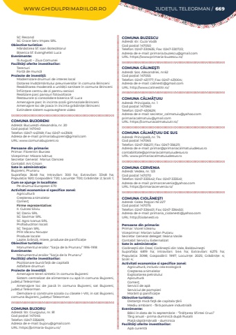 WWW.GHIDULPRIMARIILOR.RO JUDE%u021aUL TELEORMAN / 669SC Recond SC Croce Serv Impex SRLObiective turistice:M%u0103n%u0103stirea Sf. Ioan Botez%u0103torul Biserica Sf. Evanghelist LucaEvenimente:15 August %u2013 Ziua ComuneiFacilit%u00e3%u0163i oferite investitorilor:TerenuriFor%u021b%u0103%u00a0de munc%u0103Proiecte de investi%u0163ii:Modernizare drumuri de interes localDotarea %u00eenv%u0103%u021b%u0103m%u00e2ntului preuniversitar %u00een comuna BrinceniReabilitarea moderat%u0103 a unit%u0103%u021bii sanitare %u00een comuna Brinceni%u00cenfiin%u021bare centru de zi pentru senioriRealizare parc panouri fotovoltaiceRestaurare %u0219i consolidare biserica Sf. LucaAmenajare parc %u00een incinta %u0219colii gimnaziale BrinceniAmenajare loc de joaca %u00een incinta gr%u0103dini%u021bei Brinceni Extindere sistem supraveghere videoCOMUNA BUJORENIAdres%u0103: Bucure%u0219ti-Alexandria, nr. 20Cod po%u0219tal: 147040Telefon: 0247-443169; Fax: 0247-443169; Adresa de e-mail: primariabujoreni@gmail.comURL: www.comunabujoreni.roPersoane din primarie:Primar: Florentin BurceaViceprimar: Mioara Iv%u0103nu%u0219Secretar General: %u00a0Marius Oancea%u00a0Contabil: Ani Cri%u0219an%u00a0Sate %u00een administra%u021bie:Bujoreni, PrunaruSuprafa%u021ba:%u00a0 3648 ha; Intravilan:%u00a0 300 ha; Extravilan:%u00a0 3348 ha; Popula%u021bia:%u00a0920; Gospod%u0103rii:%u00a0720; Locuin%u021be:%u00a0700; Gr%u0103dini%u021be:%u00a02; %u0218coli:%u00a01; Cum se ajunge in localitate:Pe drumul European E70Activitati economice si specifice zonei:Agricultur%u0103Cre%u015fterea animalelorComer%u0163Firme reprezentative:II. Culcea SilviuSC Daniv SRLSC Savimar SRLSC Agro Ivanus SRLProfoduc%u0103tori locali:SC Terpan SRLPFA V%u0103caru Nicu%u0219orProduse locale:Lapte, br%u00e2nz%u0103, miere, produse de panifica%u021bieObiective turistice:Monumentul eroilor: %u201cSarja de la Prunaru%u201d 1916-1918Evenimente:Monumentul eroilor %u201dSorja de la Prunaru%u201dFacilit%u00e3%u0163i oferite investitorilor:Pozi%u021bionare bun%u0103 fa%u021b%u0103 de capital%u0103Asfaltare drumuriProiecte de investi%u0163ii:Amenajare teren sintetic %u00een comuna BujoreniSistem centralizat de alimentare cu ap%u0103%u00a0%u00een comuna Bujoreni, jude%u021bul%u00a0TeleormanAmenajare loc de joac%u0103%u00a0 %u00een comuna Bujoreni, sat Bujoreni, jude%u021bul%u00a0TeleormanDemolare %u0219i construire %u0219coala cu clasele I-VIII, in sat Bujoreni, comuna Bujoreni, jude%u021bul TeleormanCOMUNA BUJORUAdres%u0103: Str. Giurgiului, nr. 81Cod po%u0219tal: 147045Telefon: 0247-335609; Adresa de e-mail: bujoru@gmail.comURL: https://primaria-bujoru.ro/COMUNA BUZESCUAdres%u0103: str. Cuza Vod%u0103Cod po%u0219tal: 147050Telefon: 0247-330635; Fax: 0247-330723; Adresa de e-mail: primaria.buzescu@gmail.comURL: https://www.primaria-buzescu.ro/COMUNA C%u0102LINE%u015eTIAdres%u0103: %u0218os. Alexandriei, nr.62Cod po%u0219tal: 147055Telefon: 0247-431177; Fax: 0247-431004; Adresa de e-mail: calinesti@gmail.comURL: http://www.calinestitr.ro/COMUNA C%u0102LM%u0102%u0162UIUAdres%u0103: Principala, nr. 1Cod po%u0219tal: 147060Telefon: 0247-430629; Adresa de e-mail: secretar_calmatuiu@yahoo.comprimariacalmatuiu@ymail.com URL: https://comunacalmatuiutr.ro/COMUNA C%u0102LM%u0102%u0162UIU DE SUSAdres%u0103: Principal%u0103, nr. 74Cod po%u0219tal: 147065Telefon: 0247-356211; Fax: 0247-356211; Adresa de e-mail: primar@primariacalmatuiudesus.rocontabilitate@primariacalmatuiudesus.roURL: www.primariacalmatuiudesus.roCOMUNA CERVENIAAdres%u0103: Vedea, nr. 123Cod po%u0219tal: 147070Telefon: 0247-333542; Fax: 0247-333541; Adresa de e-mail: primarcervenia@yahoo.comURL: https://primariacervenia.ro/COMUNA CIOL%u0102NE%u015eTIAdres%u0103: Calea Ro%u015fiori Nr.227Cod po%u0219tal: 147075Telefon: 0247-336401; Fax: 0247-336450; Adresa de e-mail: primaria_ciolanesti@yahoo.comURL: http://ciolanesti.roPersoane din primarie:Primar: Viorel IcleanuViceprimar: Marian Iulian Pu%u021baruSecretar General delegat: Ileana VasileContabil: Serviciu ExternalizatSate %u00een administra%u021bie:Ciol%u0103ne%u015ftii din%u00a0Deal, Ciol%u0103ne%u015ftii din Vale, Baldovine%u015ftiSuprafa%u021ba:%u00a0 6819 ha; Intravilan:%u00a0 544 ha; Extravilan:%u00a0 6275 ha; Popula%u021bia:%u00a0 3098; Gospod%u0103rii:%u00a0 1997; Locuin%u021be:%u00a0 2025; Gr%u0103dini%u021be:%u00a0 4; %u0218coli:%u00a04; Activitati economice si specifice zonei:Agricultur%u0103, inclusiv cea ecologic%u0103Cre%u015fterea animalelorExploatarea petroluluiApicultur%u0103Comer%u0163Servicii de ap%u0103Serviciul de pompieriMor%u0103rit %u015fi panifica%u0163ieObiective turistice:Distan%u0163%u0103 mic%u0103 fa%u0163%u0103 de capitala %u0163%u0103riiMediu ambiant - f%u0103r%u0103 poluare industrial%u0103Evenimente:B%u00e2lci %u00een data de 14 septembrie - %u201c%u00cen%u0103l%u0163area Sfintei Cruci%u201dT%u00e2rg anual - prima duminic%u0103 dup%u0103 RusaliiPia%u0163%u0103 s%u0103pt%u0103m%u00e2nal%u0103 - duminicaFacilit%u00e3%u0163i oferite investitorilor:Ap%u0103 curent%u0103