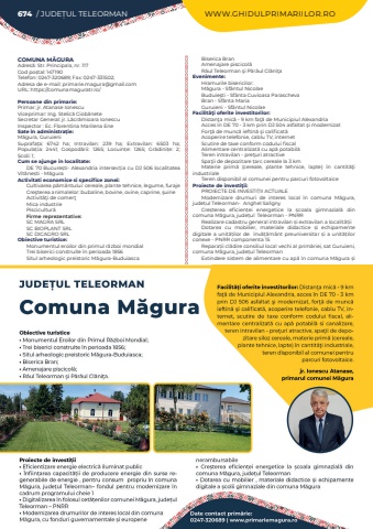 674 / JUDE%u021aUL TELEORMAN WWW.GHIDULPRIMARIILOR.ROCOMUNA M%u0102GURAAdres%u0103: Str. Principala, nr. 117Cod po%u0219tal: 147190Telefon: 0247-320689; Fax: 0247-331502; Adresa de e-mail: primarie.magura@gmail.comURL: https://comunamaguratr.ro/Persoane din primarie:Primar: jr. Atanase IonescuViceprimar: Ing. Stelic%u0103 Ciob%u0103neteSecretar General: jr. L%u0103cr%u0103mioara IonescuInspector : Ec. Florentina Marilena EneSate %u00een administra%u021bie:M%u0103gura, GuruieniSuprafa%u021ba:%u00a0 6742 ha; Intravilan:%u00a0 239 ha; Extravilan:%u00a0 6503 ha; Popula%u021bia:%u00a0 2441; Gospod%u0103rii:%u00a0 1265; Locuin%u021be:%u00a0 1265; Gr%u0103dini%u021be:%u00a0 2; %u0218coli:%u00a01; Cum se ajunge in localitate:DE 70 Bucure%u0219ti- Alexandria intersec%u021bia cu DJ 506 localitatea Vit%u0103ne%u0219ti - M%u0103guraActivitati economice si specifice zonei:Cultivarea p%u0103m%u00e2ntului: cereale, plante tehnice, legume, furajeCre%u015fterea animalelor: bubaline, bovine, ovine, caprine, %u015fuineActivit%u0103%u0163i de comer%u0163 Mica industriePiscicultur%u0103Firme reprezentative:SC MAGRA SRLSC BIOPLANT SRL SC DICAGRO SRLObiective turistice:Monumentul eroilor din primul r%u0103zboi mondialTrei biserici construite %u00een perioada 1856Situl arheologic preistoric M%u0103gura-BuduiascaBiserica BranAmenajare piscicol%u0103R%u00e2ul Teleorman %u015fi P%u00e2r%u00e2ul Cl%u0103ni%u0163aEvenimente:Hramurile bisericilor:M%u0103gura - Sf%u00e2ntul NicolaeBuduie%u015fti - Sf%u00e2nta Cuvioasa ParaschevaBran - Sf%u00e2nta MariaGuruieni - Sf%u00e2ntul NicolaeFacilit%u00e3%u0163i oferite investitorilor:Distan%u0163a mic%u0103 - 9 km fa%u0163%u0103 de Municipiul AlexandriaAcces %u00een DE 70 - 3 km prin DJ 504 asfaltat %u015fi modernizatFor%u0163%u0103 de munc%u0103 ieftin%u0103 %u015fi calificat%u0103Acoperire telefonie, cablu TV, internetScutire de taxe conform codului fiscalAlimentare centralizat%u0103 cu ap%u0103 potabil%u0103Teren intravilan - pre%u0163uri atractiveSpa%u0163ii de depozitare %u021barc%u00a0cereale la 3 kmMaterie prim%u0103 (cereale, plante tehnice, lapte) %u00een cantit%u0103%u0163i industrialeTeren disponibil al comunei pentru parcuri fotovoltaiceProiecte de investi%u0163ii:PROIECTE DE INVESTI%u021aII ACTUALEModernizare drumuri de interes local %u00een comuna M%u0103gura, jude%u021bul Teleorman-%u00a0 Anghel SalignyCre%u0219terea eficien%u021bei energetice la %u0219coala gimnazial%u0103%u00a0 din comuna M%u0103gura, jude%u021bul%u00a0 Teleorman - PNRRRealizare cadastru general intravilan %u0219i extravilan a localit%u0103%u021biiDotarea cu mobilier, materiale didactice %u0219i echipamente digitale a unit%u0103%u021bilor de%u00a0 %u00eenv%u0103%u021b%u0103m%u00e2nt preuniversitar %u0219i a unit%u0103%u021bilor conexe - PNRR%u00a0componenta 15Repara%u021bii cl%u0103dire consiliul local vechi al prim%u0103riei, sat Guruieni, comuna M%u0103gura, jude%u021bul%u00a0TeleormanExtindere sistem de alimentare cu ap%u0103%u00a0%u00een comuna M%u0103gura %u0219i