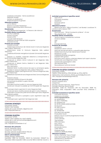 WWW.GHIDULPRIMARIILOR.RO JUDE%u021aUL TELEORMAN / 681Cre%u0219terea animalelor - ferme zootehniceDepozite cerealeComer%u021b cu am%u0103nuntulProductie de flori la ghiveciObiective turistice:Lunca S%u00e2iuluiBiserica Cuvioasa ParaschivaBiserica Adormirea Maicii DomnuluiEvenimente:T%u00e2rg%u00a0s%u0103pt%u0103m%u00e2nal organizat - %u00een fiecare zi de miercuriFacilit%u00e3%u0163i oferite investitorilor:Drumuri asfaltateAcces la DJ 546Acces la CFRLinii de %u00eenalt%u0103 tensiuneTelefonie %u015fi acces internet 100% acoperireFor%u0163%u0103 de munc%u0103Proiecte de investi%u0163ii:Investi%u021bii actualeModernizare drmumuri de interes local %u00een Comuna Segarcea Vale, jude%u021bul TeleormanModernizare str%u0103zi %u00een Comuna Segarcea Vale, jude%u021bul TeleormanCre%u0219terea eficien%u021bei energetice la %u0218coala Gimnazial%u0103 Segarcea DealDotarea cu mobilier, materiale didactice %u0219i echipamente a %u0218colii Gimnaziale Segarcea ValeConstruire %u0219i dotare C%u0103min Cultural %u00een sat Segarcea Vale, jude%u021bul TeleormanConstruire %u0219i dotare Centru Medical %u00een sat Segarcea Vale, jude%u021bul TeleormanParc fotovoltaicRealizare teren multifunc%u021bional de sport %u0219i amenajare spa%u021biu de recreere %u00een Comuna Segarcea Vale, jude%u021bul%u00a0TeleormanReabilitare cl%u0103dire Casa Agronomului, Comuna Segarcea Vale, jude%u021bul%u00a0TeleormanReabilitare Ci%u0219mele din satul Segarcea Deal, Comuna Segarcea ValeProiecte viitoareAmenajare platform%u0103 gunoi de grajdAlimentarea localit%u0103%u021bii cu gaze naturaleCanalizareExtindere iluminat public %u00een comuna Segarcea ValeConstruire trotuare %u0219i pode%u021be pe Str.Principal%u0103 Sat Segarcea DealAmenajare bazin agrement %u00een satul Segarcea DealConstruire teren multifunc%u021bional de sport %u00een satul OlteancaAmenajare (construire) piste de biciclete spre satul Segarcea Deal (l%u0103%u021birea %u0219oselei)Amenajare trotuare %u0219i parape%u021bi %u0219i parc Agrement copii, Sat Olteanca Amenajare parc agrement Sat Segarcea ValeCOMUNA SFIN%u0162E%u015eTICod po%u0219tal: 147340Telefon: 0347-524158; Adresa de e-mail: sfintesti_tr@yahoo.comURL: https://sfintesti.ro/COMUNA SILI%u015eTEACod po%u0219tal: 147345Telefon: 0247-452633; Fax: 0247-452633; Adresa de e-mail: primaria.silistea@yahoo.comcontact@silistea.roURL: http://primariasilistea-tr.ro/Persoane din primarie:Primar:%u00a0Alexandru MarinViceprimar: Viorel Fifial%u0103Secretar General: Anghel Adrian NeculaContabil: Patricia Elena NeculaSate %u00een administra%u021bie:Sili%u015ftea, Bute%u015fti, Sili%u015ftea Mic%u0103Suprafa%u021ba:%u00a0 3309 ha; Intravilan:%u00a0 302,13 ha; Extravilan:%u00a0 3006,87 ha; Popula%u021bia:%u00a02485; Gospod%u0103rii:%u00a01280; Locuin%u021be:%u00a01800; Gr%u0103dini%u021be:%u00a03; %u0218coli:%u00a04; Activitati economice si specifice zonei:Agricultur%u0103Cultivarea cerealelorZootehnieExtrac%u021bie petrolComer%u021bObiective turistice:Biserica de lemn %u201cSf%u00e2ntul Dumitru%u201d, sat Bute%u0219ti. Localizare: %u00cen cimitirul vechi. Datare: 1797Evenimente:Ziua comunei - %u201cSfin%u0163ii Constantin %u015fi Elena%u201d - 21 maiT%u00e2rg s%u0103pt%u0103m%u00e2nal - vinereaFacilit%u00e3%u0163i oferite investitorilor:Terenuri pentru concesionat, %u00eenchiriatAcces la utilit%u0103%u021bi:Ap%u0103DJEnergie electric%u0103Proiecte de investi%u0163ii:CanalizareReabilitare c%u0103min culturalSta%u021bii de re%u00eenc%u0103rcare pentru autovehiculele electriceModernizare drumuri de interes local, finan%u021batReabilitare %u0219coal%u0103Cre%u0219terea eficien%u021bei energeticeInstalare Wifi gratuit%u00cenfiin%u021bare centru pentru colectare de%u0219euri prin aport voluntarConstruc%u021bia unui dispensar umanCamere de supraveghere videoAlei betonate t%u00e2rgRecondi%u021bionat iluminat stradalCOMUNA SILI%u015eTEA GUME%u015eTICod po%u0219tal: 147350Telefon: 0756-064374s, 0763-691466 vp, 0724-236710; Adresa de e-mail: primaria_silistea_gumesti@yahoo.comURL: http://primariasilisteagumesti.ro/Persoane din primarie:Primar: Ani%u0219oara DicuViceprimar:Secretar General Interimar : Popa FloricaContabil interimar: Buic%u0103 MirelaSuprafa%u021ba:%u00a0 4458 ha; Intravilan:%u00a0 233 ha; Extravilan:%u00a0 3828 ha; Popula%u021bia:%u00a0 2452; Gospod%u0103rii:%u00a0 1268; Locuin%u021be:%u00a0 1243; Gr%u0103dini%u021be:%u00a0 1; %u0218coli:%u00a01; Activitati economice si specifice zonei:Cultivarea terenuluiCre%u015fterea animalelorFirme reprezentative:SC AGROSTEMSC SDLC FARMINGSC DOMINO SGSC PETRI KRISS AGRICULTURASC.SILGUMSC MES VLAICULA DOI PASISC ADY&DORIPFA NICULAE ANDREI%u00a0 Produc%u0103tori locali:Petrisor Ionut-LaurentiuAnghelache MirelaPacila AuricaIonita GabrielaTiga MihaelaPetre MarioaraRo%u0219u ElenaPacila IulianaSmaranda VioricaTudor ElenaProduse locale:CEREALE, BR%u00c2NZA,P%u00c2INEObiective turistice:Centru memorial %u201cMarin Preda%u201dCasa memorial%u0103 %u201cMarin Preda%u201dManastirea Sf. PantelimonManastirea Sf. Fanurie%u00a0