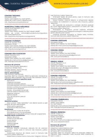 684 / JUDE%u021aUL TELEORMAN WWW.GHIDULPRIMARIILOR.ROCOMUNA TROIANULCod po%u0219tal: 147415Telefon: 0247-328003; Fax: 0247-327977; Adresa de e-mail: troianul_tr@yahoo.comURL: http://www.comunatroianul.ro/MUNICIPIUL TURNU M%u0102GURELEAdres%u0103: B-dul Republicii, nr. 2Cod po%u0219tal: 145200Telefon: 0247-416451, 416452; Fax: 0247-416453, 416587; Adresa de e-mail: primaria@municipiulturnumagurele.ro ,primariatm@yahoo.comURL: http://www.municipiulturnumagurele.ro/COMUNA %u0162IG%u0102NE%u015eTIAdres%u0103: str. Dunarii ,nr.167Cod po%u0219tal: 147420Telefon: 0247-330001, 330054; Fax: 0247-330339; Adresa de e-mail: primariatiganesti@yahoo.comURL: https://comunatiganesti.ro/COMUNA UDA CLOCOCIOVAdres%u0103: Clocociov nr. 9Cod po%u0219tal: 147356Telefon: 0347-405634; Fax: 0347-405635; Adresa de e-mail: primaria.uda@yahoo.comURL: https://primariaudaclocociov.ro/Persoane din primarie:Primar: Florica Aurelia%u00a0%u00a0B%u0103rbulescu%u00a0Viceprimar: Mih%u0103i%u0163%u0103%u00a0%u021a%u00eerleaSecretar General:%u00a0 Viorica%u00a0C%u0103rnu%u0163%u0103Contabil:%u00a0Gheorghe%u00a0BenaSate %u00een administra%u021bie:Uda Clocociov, Uda PaciureaSuprafa%u021ba:%u00a03947 ha; Intravilan:%u00a0198,52 ha; Extravilan:%u00a034748,48 ha; Popula%u021bia:%u00a01863; Gospod%u0103rii:%u00a0810; Locuin%u021be:%u00a0756; Gr%u0103dini%u021be:%u00a02; %u0218coli:%u00a01; Activitati economice si specifice zonei:Agricultur%u0103Cre%u015fterea animalelorCultivarea cerealelor p%u0103ioaseCultivarea plantelor tehnice %u015fi industrialeComer%u0163 cu am%u0103nuntul, produse alimentare %u015fi nealimentare Complex avicol nepopulatComer%u0163 - 20 societ%u0103%u0163i comercialeCabinet medical individual umanDispensar veterinarAgen%u0163ie po%u015ftal%u0103Luciu de ap%u0103 pentru pescuitTelefonieMor%u0103ritObiective turistice:Zona turistic%u0103 %u201cValea Ci%u015fmelelor%u201d care de%u0163ine izvoare cu ap%u0103 potabil%u0103, dar este neamenajat%u0103P%u0103duri pentru agrementAcces facil la R%u00e2ul Olt (5 km)Evenimente:Ziua comunei, %u00een data de 23 aprilieT%u00e2rg s%u0103pt%u0103m%u00e2nal %u00een ziua de s%u00e2mb%u0103t%u0103T%u00e2rg bianual: %u00een data de 29 iunie %u015fi %u00een data de 14 septembrieFacilit%u00e3%u0163i oferite investitorilor:Terenuri f%u0103r%u0103 chirieInfrastructur%u0103 adecvat%u0103Curent electricAcces DJ 546Telefonie digital%u0103Ap%u0103 potabil%u0103Proiecte de investi%u0163ii:%u00cenfiin%u021bare Sisteme individuale adecvata SIA de colectare %u0219i epurare a apelor uzate %u00een Comuna Uda Clocociov, jude%u021bul TeleormanModernizare Drumuri de Interes Local %u00een Comuna Uda Clocociov, jude%u021bul TeleormanModernizare %u0219i Dotare Centru Comunitar Integratin Comuna Uda Clocociov, jude%u021bul TeleormanAmenajare spa%u021biu de joac%u0103%u00a0 pentru copii %u00een Comuna Uda Clocociov, jude%u021bul TeleormanDotare Mobilier material didactic %u0219i echipamente digitale a unit%u0103%u021bilor de %u00eenv%u0103%u021b%u0103m%u00e2nt %u00een Comuna Uda Clocociov, jude%u021bul TeleormanNoi capacit%u0103%u021bi de producere a energiei electrice produs%u0103 din surse regenarabile pentru autoconsum la nivelul UAT Uda Clocociov, jude%u021bul TeleormanParticiparea la Programul privind cre%u0219terea eficien%u021bei energetice %u0219i gestionarea inteligent%u0103%u00a0a energiei %u00een cl%u0103dirile publice pentru obiectivul de investi%u021biiCre%u0219terea eficien%u021bei energetice la Cl%u0103dire Sediu Prim%u0103rie, Comuna Uda Clocociov, jude%u021bul TeleormanCOMUNA V%u00c2RTOAPECod po%u0219tal: 147425Telefon: 0247-338202; Fax: 0247-338202; Adresa de e-mail: primariavirtoapele@yahoo.comCOMUNA VEDEACod po%u0219tal: 147430Telefon: 0247-337901; Fax: 0247-337901; Adresa de e-mail: primariavedea@yahoo.comURL: www.primariavedea.roORA%u0218UL VIDELEAdres%u0103: Republicii, nr. 2Cod po%u0219tal: 145300Telefon: 0247-453017; Fax: 0247-453015; Adresa de e-mail: office@primariavidele.roprimariavidele@yahoo.comURL: www.primariavidele.roCOMUNA VII%u015eOARAAdres%u0103: Principal%u0103, nr. 673Cod po%u0219tal: 147435Telefon: 0247-360615; Fax: 0247-360506; Adresa de e-mail: primariaviisoara_tr@yahoo.comURL: https://www.primaria-viisoara.ro/COMUNA VIT%u0102NE%u015eTICod po%u0219tal: 147440Telefon: 0247-331225; Fax: 0247-331225; Adresa de e-mail: primariavitanesti@gmail.comURL: https://primariavitanesti.ro/COMUNA ZIMBREASCACod po%u0219tal: 147445Telefon: 0247-338401; Fax: 0247-338401; Adresa de e-mail: primaria.zimbreasca@gmail.comURL: https://primariazambreasca.ro/ORA%u0218UL ZIMNICEAAdres%u0103: Giurgiu, nr. 1Cod po%u0219tal: 145400Telefon: 0247-366431; Fax: 0247-366780; Adresa de e-mail: primaria@orasulzimnicea.roURL: www.orasulzimnicea.roPersoane din primarie:Primar: Petre P%u00e2rvuViceprimar: Iuliana Valentina Vi%u0219anSecretar General: Ionel Berechet%u0218ef seviciu BFC: Gica MartinescuSuprafa%u021ba:%u00a0 13647 ha; Intravilan:%u00a0 1084,3 ha; Extravilan:%u00a0 12562,7 ha; Popula%u021bia:%u00a0 13662; Gospod%u0103rii:%u00a0 4425; Locuin%u021be:%u00a0 5843; Gr%u0103dini%u021be:%u00a0 4; %u0218coli:%u00a04; Licee:%u00a01;