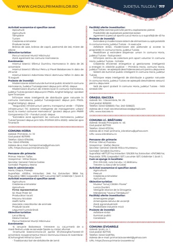 WWW.GHIDULPRIMARIILOR.RO JUDE%u021aUL TULCEA / 717Activitati economice si specifice zonei:Apicultur%u0103Agricultur%u0103T%u00e2mpl%u0103rieTurismCre%u0219terea animalelorProduse locale:Br%u00e2nza de oaie, br%u00e2nza de capr%u0103, pastram%u0103 de ied, miere de albineObiective turistice:Parcul na%u021bional Mun%u021bii M%u0103cinului Zon%u0103 agrement lac comuna HamcearcaEvenimente:Hramul biserici Sf%u00e2ntul Dumitru Hamcearca %u00een data de 26 octombrieHramul bisericii Sf%u00e2ntul Petru %u0219i Pavel Balabancea %u00een data de 29 iunieHramul bisericii Adormirea Maicii domnului Nifon %u00een data de 15 augustProiecte de investi%u0163ii:Modernizarea sistemului de iluminat public stradal %u00een comuna Hamcearca, Jude%u021bul Tulcea(proiect depus prin AFM)- depusModernizare drumuri de interes local %u00een comuna Hamcearca, jude%u021bul Tulcea (proiect depus prin PNDL Anghel Saligny)- aprobat spre finan%u021bare%u00cenfiin%u021bare re%u021bea inteligent%u0103 de distribu%u021bie gaze naturale %u00een comuna Hamcearca, jude%u021bul Tulcea(proiect depus prin PNDL Anghel Saligny)- depus%u201dAsigurarea infrastructurii pentru transportul verde %u2013 ITS/alte infrastructuri TIC (sisteme inteligente de management urban/ local) la nivelul comunei Hamcearca%u201d (proiect depus prin PNRR Componen%u021ba C10 %u2013 Fondul Local)- depus%u201dExtindere zon%u0103 agrement lac comuna Hamcearca, jude%u021bul Tulcea%u201d(proiect depus prin SDL-POPAM 2014-2020)- selectat spre finan%u021bareCOMUNA HORIA Adres%u0103: Prim%u0103riei, nr. 10Cod po%u0219tal: 827095Telefon: 0240-576006; Fax: 0240-576006; Adresa de e-mail: horiaprimaria@yahoo.comURL: https://www.primariahoria.ro/Persoane din primarie:Primar: Marian%u00a0TaifasViceprimar:%u00a0 Mihai%u00a0Ro%u0219caSecretar General: Felicia%u00a0CosteaContabil: Popescu IleanaSate %u00een administra%u021bie:Horia, Clo%u015fca, Flore%u015ftiSuprafa%u021ba:%u00a0 4102ha; Intravilan:%u00a0 246 ha; Extravilan:%u00a0 3856 ha; Popula%u021bia:%u00a01380; Gospod%u0103rii:%u00a0627; Locuin%u021be:%u00a0627; Gr%u0103dini%u021be:%u00a01; %u0218coli:%u00a03; Activitati economice si specifice zonei:AgriculturaCre%u0219terea animalelorApiculturaFirme reprezentative:SC Rival Prest SrlProduc%u0103tori locali:Mocanu NicolaieAsafti SofiaAsocia%u021bia cresc%u0103torilor de animaleProduse locale:Legume,fructe,br%u00e2nz%u0103Obiective turistice:Lacul BarajDealul Consul Parcul Na%u021bional Mun%u021bii M%u0103cinuluiEvenimente:-6 ianuarie Boboteaza -%u00eentrecere cu cai,urmat%u0103%u00a0 de o mas%u0103%u00a0festiv%u0103%u00a0unde se serve%u0219te fasole cu ciolan afumat-Hramurile bisericii:Horia-23 aprilie Sf.Gheorghe,Floresti-01 octombrie Acoperamantul Maicii Domnului.Closca-8 noiembrieSf.Arhangheli Mihail %u0219i Gavril- Tradi%u021bionalul bal-de s%u0103rb%u0103torile de iarn%u0103Facilit%u00e3%u0163i oferite investitorilor:Suprafe%u021be extinse potrivite pentru exploatarea pietreiPosibilit%u0103%u021bi de exploatare poten%u021bial eolian Agrement %u0219i pescuit sportiv Lacul Horia cu o suprafa%u0163%u0103 de 43 haProiecte de investi%u0163ii:Extindere %u015fi modernizare sistem de alimentare cu ap%u0103 potabil%u0103 %u00een comuna Horia, jude%u021bul Tulcea - %u00een execu%u021bieAsfaltare str%u0103zi, modernizare alei pietonale %u015fi accese la propriet%u0103%u021bi %u00een comuna Horia, jude%u021bul TulceaReabilitare %u015fi extindere dispensar uman %u00een comuna Horia, jude%u021bul Tulcea - faz%u0103 proiect%u00cenfiin%u0163are centru de colectare prin aport voluntar %u00een comuna Horia, jude%u021bul Tulcea - licita%u021bieCre%u015fterea eficien%u021bei energetice %u015fi gestionarea inteligent%u0103 a energiei %u00een cl%u0103dirile publice -- Prim%u0103ria Horia, comuna Horia, jude%u021bul Tulcea - se a%u015fteapt%u0103 deschiderea sesiunii pentru depunereSistem de iluminat public inteligent %u00een comuna Horia, jude%u021bul Tulcea%u00cenfiin%u0163are re%u0163ea inteligent%u0103 de distribu%u021bie a gazelor naturale %u00een comuna Horia, jude%u021bul Tulcea se a%u015fteapt%u0103 deschiderea sesiunii pentru depunereSal%u0103 de sport %u015fcolar%u0103 %u00een comuna Horia, jude%u021bul Tulcea - list%u0103 sintez%u0103 CNIORA%u0218UL ISACCEAAdres%u0103: Str. 1 Decembrie, Nr. 25Cod po%u0219tal: 825200Telefon: 0240-506600; Fax: 240-506623; Adresa de e-mail: secretariatisaccea@gmail.comURL: www.isaccea.roCOMUNA I.C. BR%u0102TIANUAdres%u0103: Strada Principala nr. 45Cod po%u0219tal: 827100Telefon: 0240-573134; Adresa de e-mail: primaria_icbratianu@yahoo.comURL: www.icbratianu.roPersoane din primarie:Primar: D%u0103nu%u021b%u00a0Pu%u0219ca%u0219uViceprimar : %u0218tefan%u00a0Reznic%u00a0Secretar General: D%u0103nil%u0103 Milica MunteanuContabil: %u0162and%u0103r%u0103 DumitruSuprafa%u021ba:%u00a04877,27 ha; Intravilan:%u00a0129,305 ha; Extravilan:%u00a04747,965 ha; Popula%u021bia:%u00a01375; Gospod%u0103rii:%u00a0527; Locuin%u021be:%u00a0527; Gr%u0103dini%u021be:%u00a01; %u0218coli:%u00a01; Cum se ajunge in localitate:Prin DN 22E, ruta Garv%u0103u- I.C.Br%u0103tianu Trecere cu bacul de la Gala%u021biActivitati economice si specifice zonei:Agricultur%u0103PescuitCre%u015fterea animalelorApicultur%u0103%u00a0Obiective turistice:Muzeul %u201cIonu%u0163 C%u0103t%u0103lin Florea%u201dLunca Dun%u0103riiVestigiile istorice de la DinogetiaM%u0103n%u0103stirea %u201cIzvorul T%u0103m%u0103duirii%u201dFacilit%u00e3%u0163i oferite investitorilor:Amenajarea plajeiAmenajarea satului de vacan%u0163%u0103Zon%u0103 agroindustrial%u0103Posibilitate industrie mic%u0103Proiecte de investi%u0163ii:Asfaltare str%u0103ziIluminat public CanalizareCOMUNA IZVOARELEAdres%u0103: %u015ecolii, nr. 1Cod po%u0219tal: 827105Telefon: 0240-548794; Adresa de e-mail: primariaizvoareletl@yahoo.comURL: https://www.primaria-izvoarele.ro/