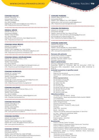 WWW.GHIDULPRIMARIILOR.RO JUDE%u021aUL TULCEA / 719COMUNA MALIUCAdres%u0103: Platanilor, nr. 1Cod po%u0219tal: 827135Telefon: 0240-546543; Fax: 0372-003861; Adresa de e-mail: primaria@comuna-maliuc.roURL: https://www.comuna-maliuc.ro/ORA%u0218UL M%u0102CINAdres%u0103: Florilor, nr. 1Cod po%u0219tal: 825300Telefon: 0240-571354; Fax: 0240-573950; Adresa de e-mail: primaria_macin@yahoo.comURL: https://www.macin.ro/COMUNA MIHAI BRAVUAdres%u0103: Principal%u0103, nr. 72Cod po%u0219tal: 827140Telefon: 0372-789288; Fax: 0240-707113; Adresa de e-mail: primaria_mihaibravu@yahoo.comURL: https://www.primaria-mihaibravu.ro/COMUNA MIHAIL KOG%u0102LNICEANUAdres%u0103: str. Mihai Eminescu .nr.94Cod po%u0219tal: 827145Telefon: 0240-563001; Fax: 0240-563177; Adresa de e-mail: contact@primariakogalniceanu.roURL: http://www.primariakogalniceanu.roCOMUNA MURIGHIOLAdres%u0103: str. Lacului .nr 8Cod po%u0219tal: 827150Telefon: 0240-545802, 545969; Fax: 0240-545971; Adresa de e-mail: primaria_murighiol@yahoo.comcontact@primaria-murighiol.roURL: https://www.primaria-murighiol.ro/COMUNA NALBAN%u0162Adres%u0103: Sublocotenent Marian Ri%u021bcu, nr. 14Cod po%u0219tal: 827160Telefon: 0240-548503; Fax: 0240-548595; Adresa de e-mail: primaria_nalbant@yahoo.comURL: http://primarianalbant.roCOMUNA NICULI%u0162ELAdres%u0103: Central%u0103, nr. 2Cod po%u0219tal: 827165Telefon: 0240-542104;Fax: 0240-542281; Adresa de e-mail: primarianiculitel@yahoo.comURL: www.primaria-niculitel.roCOMUNA NUF%u0102RUAdres%u0103: Domni%u0163a Maria, nr. 37Cod po%u0219tal: 827170Telefon: 0240-549054; Fax: 0240-549062; Adresa de e-mail: office@primarianufaru.roURL: www.primarianufaru.roCOMUNA OSTROVAdres%u0103: str. %u0218colii .nr 6Cod po%u0219tal: 827175Telefon: 0240-577336; Fax: 0240-577488; Adresa de e-mail: secretariat@primariaostrovtulcea.roURL: https://www.primariaostrovtulcea.ro/COMUNA PARDINAAdres%u0103: Aleea Veche, nr. 14Cod po%u0219tal: 81102Telefon: 0371-386607; Fax: 0371-386607; Adresa de e-mail: primaria_pardina@yahoo.roURL: https://www.primariapardina.ro/COMUNA PECENEAGAAdres%u0103: str, Primariei .nr.32Cod po%u0219tal: 827185Telefon: 0240-577130; Fax: 0240-577130; Adresa de e-mail: primaria_peceneaga@yahoo.comprimaria@comunapeceneaga-tl.roURL: https://comunapeceneaga-tl.ro/COMUNA SARICHIOIAdres%u0103: Principal%u0103, nr. 148Cod po%u0219tal: 827190Telefon: 0240-563538; Fax: 0240-563511; Adresa de e-mail: contact@primariasarichioi.roURL: www.primariasarichioi.roPersoane din primarie:Primar:Vitali Cristian Finoghen%u00a0Viceprimar: Florin CostacheSecretar General: C%u0103t%u0103lin Turcu%u00a0Contabil: Liliana SavinSate %u00een administra%u021bie:Sarichioi, Sabangia, Enisala, Zebil, VisternaSuprafa%u021ba:%u00a0 28239 ha; Intravilan:%u00a0 866 ha; Extravilan:%u00a0 27373 ha; Popula%u021bia:%u00a0 6761; Gospod%u0103rii:%u00a0 3428; Locuin%u021be:%u00a0 2815; Gr%u0103dini%u021be:%u00a0 5; %u0218coli:%u00a06; Activitati economice si specifice zonei:Construc%u0163iiPescuit %u015fi acvacultur%u0103Agricultur%u0103 - cultivare legume %u015fi cerealeTurismFirme reprezentative:SC Konstant Group SRLSC Transmeteorit SRLSC Delta Fish SRLSC Arcada SRLSC Cril-Com SRLSocietate Agricol%u0103 Spicul ZebilSC Ramali Construct SRLSC Minifarm SRLSC Jacana Invest SRL%u00a0Obiective turistice:Complex Lagunar Razim - SinoeInsula Popina - Rezerva%u021bia Biosferei Delta dun%u0103rii RBDDLacul BabadagCasa %u0163%u0103r%u0103neasc%u0103 Enisala (muzeu)Safari Village EnisalaCetatea Heracleea-EnisalaMihail Moruzov - muzeu %u00een cadrul %u0219coliiPensiuniCasa Filip - SarichioiRavet - SarichioiTaverna Le GaFish restaurant pesc%u0103resc %u00een SarichioiLa Tauc - restaurant pesc%u0103resc ZebilDelta Royal - SabangiaLa Cupric - SarichioiPoarta Apelor - SarichioiRustic - SarichioiEvenimente:Hramul %u201cSfintei Treimi%u201d EnisalaHramul bisericii %u201cNa%u0219terea Maicii Domnului%u201d SarichioiHramul %u201cSf%u00e2ntul Dumitru%u201d ZebilHramul bisericii %u201cSf%u00e2ntul Vasile cel Mare%u201d SarichioiHramul bisericii %u201dSfin%u021bii Arhangheli Mihail %u0219i Gravila%u201d SabangiaM%u0103n%u0103stirea Vistera cu hramul: Na%u0219terea Maicii Domnului, Cuvioasa Parascheva%u201cFestivalul vinului pelin%u201d Zebil%u201cFestivalul lacului Razelm%u201d Sarichioi%u201cFestivalul Pro Istoria Fest%u201d Enisala