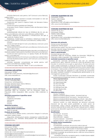Achizi%u021bie Remorc%u0103%u00a0auto pentru UAT Comuna Lunca Banului, jude%u021bul%u00a0Vaslui%u00cenfiin%u021bare Grupuri sanitare la %u0218coala Gimnazial%u0103%u00a0 nr.1 din sat Lunca Banului %u0219i %u0218coala O%u021betoaiaConstruire parc joac%u0103 %u00een Spa%u021biul Public de Recreere Colacu Lunca BanuluiConstruire %u0219an%u021buri pereate sat OtetoaiaAmenajare Teren Fotbal %u00een Spatiul Public de Recreere Colacu Lunca Banului%u00cen curs:MODERNIZARE DRUM DC 34A %u0218I STR%u0102ZILE 2B, 3C, 4D, din satul Lunca Banului, comuna Lunca Banului, jude%u021bul VasluiProiect Regional de dezvoltare a infrastructurii de ap%u0103%u00a0 %u0219i ap%u0103%u00a0uzat%u0103%u00a0din Jude%u021bul VasluiReabilitare, modernizare %u0219i extindere a Sistemului Public de Iluminat Public pentru Comuna Lunca Banului, Jude%u021bul%u00a0VasluiViitoare:Construire Sal%u0103%u00a0de Sport %u00een sat Lunca Banului, Comuna%u00a0Lunca Banului, Jude%u021bul%u00a0VasluiConstruire C%u0103min Cultural %u00een sat Lunca Banului, Comuna%u00a0Lunca Banului, jude%u021bul%u00a0Vaslui%u00cenfiin%u021bare sistem de distribu%u021bie gaze naturale Lunca Banului %u0219i Otetoaia, jude%u021bul%u00a0Vaslui pentru locuitorii Comunei Lunca BanuluiConstruire baz%u0103%u00a0 sportiv%u0103%u00a0 tip 2 %u00een Spa%u021biul Public de Recreere Colacu Lunca BanuluiModernizare drumuri %u00een Comuna Lunca Banului, Jude%u021bul%u00a0VasluiAchizi%u021bie Buldoexcavator pentru UAT Comuna Lunca Banului, Jude%u021bulu%u00a0VasluiAchizi%u021bie excavator conven%u021bional pe %u0219enile pentru UAT Comuna Lunca Banului, Jude%u021bul%u00a0VasluiConstruire spa%u021bu t%u00e2rg tip %u201c Bazar%u201d %u00een sat Lunca BanuluiCOMUNA M%u0102LU%u015eTENICod po%u0219tal: 737350Adresa de e-mail: primaria_malusteni@yahoo.comURL: www.malusteni.roPersoane din primarie:%u00a0Primar:%u00a0Gheorghe%u00a0B%u00e2%u021buViceprimar: Ionel BujorenuSecretar General: Maria -Elena%u00a0%u00a0Bl%u0103naruContabil: Maricela%u00a0M%u00e2nzu%u00a0Sate %u00een administra%u021bie:M%u0103lu%u015fteni, Lupe%u015fti, M%u00e2nz%u0103te%u015fti, Ghireasca, %u0162u%u0163cani, M%u00e2n%u0103stireaSuprafa%u021ba:%u00a0 5553 ha; Intravilan:%u00a0 547 ha; Extravilan:%u00a0 5006 ha; Popula%u021bia:%u00a0 2300; Gospod%u0103rii:%u00a0 998; Locuin%u021be:%u00a0 1338; Gr%u0103dini%u021be:%u00a0 5; %u0218coli:%u00a04; Activitati economice si specifice zonei:Agricultur%u0103Cre%u015fterea animalelorViticultur%u0103Mor%u0103ritComer%u0163Obiective turistice:Zona fosilier%u0103 M%u0103lu%u015fteniFacilit%u00e3%u0163i oferite investitorilor:Teren %u00een arend%u0103Proiecte de investi%u0163ii:Construc%u021bie %u0219i dotare centru comunitar integrat %u00een comuna M%u0103lu%u0219teni, jude%u021bul Vaslui Asigurarea infrastructurii pentru transportul verde-ITS/ alte infrastructuri TIC( SISTEME INTELIGENTE DE MANAGEMENT URBAN/LOCAL)COMUNA MICLE%u015eTICod po%u0219tal: 737360Telefon: 0235-348135, 348136; Fax: 0235-348195; Adresa de e-mail: primar@primariamiclesti.rosecretar@primariamiclesti.rocontact@primariamiclesti.ro, contabilitate@primariamiclesti.roURL: www.primariamiclesti.roCOMUNA MUNTENII DE JOSCod po%u0219tal: 737365Telefon: 0235-313065; Fax: 0235-315865; Adresa de e-mail: office@munteniidejos.roURL: www.munteniidejos.roCOMUNA MUNTENII DE SUSAdres%u0103: DN 24, Nr. 1Cod po%u0219tal: 737512Telefon: 0235-361626; Fax: 0235-361626; Adresa de e-mail: contact@munteniidesus.roURL: www.munteniidesus.roPersoane din primarie:Primar: ec.Ion VartolomeiViceprimar: Marian IgnatAdministrator public: ing. Dan Laurian BrezianuSecretar General: Sergiu VartolomeiContabil: Manuela BozianuSate %u00een administra%u021bie:Muntenii de Sus, Satu NouSuprafa%u021ba:%u00a0 2239 ha; Intravilan:%u00a0 303,62 ha; Extravilan:%u00a0 1935,38 ha; Popula%u021bia:%u00a04289; Gospod%u0103rii:%u00a01156; Gr%u0103dini%u021be:%u00a01; %u0218coli:%u00a02; Activitati economice si specifice zonei:Economia comunei Muntenii de Sus are un caracter predominant agrar, datorit%u0103 num%u0103rului mare de persoane care locuiesc %u00een comun%u0103 %u0219i se ocup%u0103 cu agricultura. Pe raza comunei avem unit%u0103%u021bi industriale cu for%u021b%u0103 de munc%u0103 tot din localitate %u00een diverse domenii: confec%u021bii, t%u00e2mpl%u0103rie aluminiu %u0219i lemn, panifica%u021bie %u0219i transport. Toate aceste unit%u0103%u021bi sunt %u00een proprietate privat%u0103. Unele au mari dificult%u0103%u021bi de adaptare la noile cerin%u021be ale economiei de pia%u021b%u0103, necesit%u0103 investi%u021bii %u00een echipamente performante %u0219i un management performant.Exist%u0103 numeroase asocia%u021bii familiare %u0219i societ%u0103%u021bi comerciale care presteaz%u0103 activitatea de comer%u021b cu ridicata %u0219i cu am%u0103nuntulFirme reprezentative:SC Udi Aluminiu SRLSC Imprimante SRLSC Miu Conf SRLSC Lary Dory SRLSC Edimpe Auto SRLSC Steli Rodica SRLSC B%u00eersa SRLObiective turistice:Muzeul Tradi%u021biilorBiserica ortodox%u0103 Sf%u00e2ntul Andrei - Muntenii de SusBiserica ortodox%u0103 Sfin%u021bii Trei Ierarhi - Muntenii de SusBiserica ortodox%u0103 Sfin%u021bii Apostoli Petru %u0219i Pavel - Satu NouBiserica ortodox%u0103 Sf%u00e2nta Cuvioasa Paraschiva - Satu NouSectorul turistic nu este dezvoltat pe teritoriul comunei Muntenii de Sus de%u0219i exist%u0103 posibilit%u0103%u021bi ca acest sector s%u0103 func%u021bioneze: cadrul natural, apropierea de Municipiul Vaslui, drumul na%u021bional DN 24 c%u0103tre Ia%u0219i. Pe viitor trebuie avut %u00een vedere promovarea dezvolt%u0103rii agroturismului %u0219i amenajarea unor zone de agrement.Evenimente:Ziua femeii - 8 martieZiua copilului - 1 iunieZiua comunei - augustFluiera%u0219 Vasluian - noiembrieSerbare Cr%u0103ciun - elevi, %u0219colari, pre%u0219colariFacilit%u00e3%u0163i oferite investitorilor:Oportunit%u0103%u021bi:Accesibilitate, localizare, structur%u0103 %u0219i cadrul natural- dezvoltarea de cartiere reziden%u021biale av%u00e2nd %u00een vedere dorin%u021