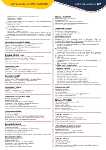 WWW.GHIDULPRIMARIILOR.RO JUDE%u021aUL V%u00c2LCEA / 757Modernizarea tuturor drumurilor comunaleModernizare DJ 658Modernizare DC 171Construire pod peste p%u00e2r%u00e2ul Muereasca %u00een satul Muereasca de Sus, comuna MuereascaProiecte de viitorAmenajare spa%u021bii de joac%u0103 pentru copii %u00een satul Andreie%u0219ti %u0219i %u00een satul MuereascaCanalizarea localit%u0103%u0163iiAlimentare cu gaze naturaleModernizarea %u0219colii generale cu clasele V-VIII Muereasca de Sus Reabilitare %u0219i modernizare siloz de fructe %u00een vederea %u00eenfiin%u021b%u0103rii Centrului afterschool sat Muereasca, comuna Muereasca, jude%u021bul V%u00e2lceaCOMUNA NICOLAE B%u0102LCESCUAdres%u0103: strada Rot%u0103r%u0103%u015fti, num%u0103r 27; Cod po%u0219tal: 247429Telefon: 0250-761089; Fax: 0250-761025; Adresa de e-mail: primaria.nbalcescu@gmail.comnbalcescu@vl.e-adm.roURL: www.nicolae-balcescu.roORA%u0218UL OCNELE MARIAdres%u0103: Alexandru Ioan Cuza, nr. 37; Cod po%u0219tal: 245900Telefon: 0250-772043; Fax: 0250-772270; Adresa de e-mail: ocnele_mari@vl.e-adm.roURL: www.ocne.roCOMUNA OLANUCod po%u0219tal: 247440Telefon: 0250-762306, 762334; Fax: 0250-762302; Adresa de e-mail: primariaolanu@yahoo.comCOMUNA ORLE%u015eTICod po%u0219tal: 247450Telefon: 0250-763301, 0250-763563; Fax: 0250-763301; Adresa de e-mail: primariaorlesti@yahoo.comURL: www.primariaorlesti.roCOMUNA O%u0162E%u015eANICod po%u0219tal: 247455Telefon: 0250-860676; Fax: 0250-860676; Adresa de e-mail: otesani@vl.e-adm.roCOMUNA P%u0102USE%u015eTI-M%u0102GLA%u015eIAdres%u0103: Principal%u0103, nr. 24Cod po%u0219tal: 247470Telefon: 0250-776533; Fax: 0250-776533; Adresa de e-mail: ausesti_maglasi@vl.e-adm.roprimaria_pausestimg@yahoo.comURL: http://www.primariapausesti-maglasi.roCOMUNA P%u0102U%u015eE%u015eTIAdres%u0103: Principal%u0103, nr. 47Cod po%u0219tal: 247460Telefon: 0250-774060, 774261; Fax: 0250-774060, 774261; Adresa de e-mail: primariapausestiotasau@yahoo.comURL: http://www.comunapausesti-otasau.roCOMUNA PERI%u015eANIAdres%u0103: Str. Principal%u0103, Nr. 149Cod po%u0219tal: 247480Telefon: 0250-757280, 757202; Fax: 0250-757202; Adresa de e-mail: perisani@vl.e-adm.roprimaria_perisani@yahoo.comCOMUNA PESCEANAAdres%u0103: Principal%u0103, nr. 9Cod po%u0219tal: 247500Telefon: 0350-525000; Fax: 0350-525000; Adresa de e-mail: pesceana@vl.e-adm.roprimaria_pesceana@yahoo.com URL: http://primariapesceana-valcea.roCOMUNA PIETRARIAdres%u0103: Principal%u0103, nr. 244-245Cod po%u0219tal: 247510Telefon: 0250-864166; Fax: 0250-864232; Adresa de e-mail: primariapietrari@yahoo.comURL: www.comunapietrari.roPersoane din primarie:Primar:Nicolae Moraru%u00a0Viceprimar:Gheorghe R%u0103descu%u00a0Secretar General:Gheorghe Mohora%u00a0Contabil: Alina R%u0103dulescuSate %u00een administra%u021bie:Pietrari, Pietrari de SusSuprafa%u021ba:%u00a0 1947 ha; Intravilan:%u00a0 295 ha; Extravilan:%u00a0 1652 ha; Popula%u021bia:%u00a03326; Gospod%u0103rii:%u00a01467; Locuin%u021be:%u00a01663; Gr%u0103dini%u021be:%u00a02; %u0218coli:%u00a02; Activitati economice si specifice zonei:Prelucrarea produselor agricole %u00een sistem privat (individual)Mor%u0103rit %u015fi panifica%u0163ieComer%u0163 privatObiective turistice:Schitul Climent (1728) %u015fi alte edificii monahalePosibilit%u0103%u0163i de construire a unei microbaze de tratament balnear%u00a0pentru afec%u0163iuni ale aparatului locomotor, reumatismale, etc., datorit%u0103 existen%u0163ei apelor minerale %u00een zon%u0103Evenimente:T%u00e2rg s%u0103pt%u0103m%u00e2nal - duminicaHora costumelor - festival jude%u0163ean al portului popular - %u00een ziua de FloriiZiua localit%u0103%u0163ii - 27 iunie, anualFacilit%u00e3%u0163i oferite investitorilor:Reduceri la impozitul pe venit pentru oamenii de afaceriProiecte de investi%u0163ii:Canalizare %u015fi epurare ape menajere uzateAsfaltare 5,1 km drumuri comunaleExtindere alimentare cu ap%u0103Centru %u00eengrijire persoane v%u00e2rstiniceModernizare c%u0103min culturalAsfaltare%u00a0 %u0219i modernizare drumuri %u0219i trotuare%u00a0Construc%u0163ie sal%u0103 de sport multifunc%u021bional%u0103Construc%u021bie centru cultural multifunc%u021bional%u00cenfiin%u021bare sta%u021bii de%u00a0 re%u00eenc%u0103rcare a autovehiculelor electrice COMUNA POPE%u015eTICod po%u0219tal: 247515Telefon: 0250-764552; Fax: 0250-764552; Adresa de e-mail: primariapopestivl@yahoo.comURL: www.comunapopesti.roCOMUNA PRUNDENIAdres%u0103: Tudor Vladimirescu, nr. 183Cod po%u0219tal: 247525Telefon: 0250-810399; Adresa de e-mail: primprud@yahoo.comprundeni@vl.e-adm.roURL: www.primariaprundeni.roCOMUNA RACOVI%u0162ACod po%u0219tal: 247530Telefon: 0250-756027; Fax: 0250-756027; Adresa de e-mail: primracovita@yahoo.comURL: www.primaria-racovita.roMUNICIPIUL R%u00c2MNICU V%u00c2LCEAAdres%u0103: General Praporgescu, nr. 14Cod po%u0219tal: 240718Telefon: 0250-731016; Fax: 0250-731843; Adresa de e-mail: primaria@primariavl.roURL: www.primariavl.roCOMUNA ROE%u015eTICod po%u0219tal: 247540Telefon: 0250-764560; Fax: 0350-524408; Adresa de e-mail: primroesti@yahoo.com, roesti@vl.e-adm.roURL: www.comunaroesti.ro