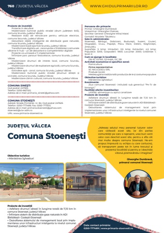 Proiecte de investi%u0163ii:Proiecte %u00een derulare:Modernizare iluminat public stradal (drum jude%u021bean 645), comuna Scundu, jude%u021bul V%u00e2lceaRealizare sta%u021bii de re%u00eenc%u0103rcare pentru vehicule electrice, comuna Sscundu, jude%u021bul V%u00e2lceaDezvoltare re%u021bele inteligente de distribu%u021bie gaze naturale, comuna Scundu, judetul V%u00e2lceaModernizare baz%u0103 sportiv%u0103 Scundu, jude%u021bul V%u00e2lceaTransformare digitala uat - reconversie a 12 biblioteci comunale v%u00e2lcene %u00een hub %u2013 uri de dezvoltare a Competentelor digitaleProiecte ce urmeaz%u0103%u00a0a fi implementate:%u00cenfiin%u021bare parc panouri fotovoltaice, comuna Scundu, jude%u021bul V%u00e2lceaModernizare drumuri de interes local, comuna Scundu, jude%u021bul V%u00e2lceaModernizare drumuri de exploatare agricol%u0103, comuna Scundu, jude%u021bul V%u00e2lceaExtindere ap%u0103%u00a0%u2013 canal, comuna Scundu, jude%u021bul V%u00e2lceaModernizare iluminat public stradal (drumuri s%u0103te%u0219ti %u0219i vicinale), comuna Scundu, Jude%u021bul V%u00e2lceaModernizare c%u0103min cultural, comuna Scundu, jude%u021bul V%u00e2lceaCOMUNA SINE%u015eTICod po%u0219tal: 247595Telefon: 0250-867120; Adresa de e-mail: primaria_sinesti@yahoo.comCOMUNA STOENE%u015eTIAdres%u0103: Strada Prim%u0103riei. nr. 84; Cod po%u0219tal: 247625Telefon: 0250-777489; Fax: 0250-777510; Adresa de e-mail: primaria.stoenesti@yahoo.comstoenesti@vl.e-adm.roURL: www.primaria-stoenesti.roPersoane din primarie:Primar: Gheorghe Dumbrav%u0103Viceprimar: Gheorghe ChelceaSecretar General: Gheorghe Mihai MateiContabil: Nicoleta T%u0103tulescuSate %u00een administra%u021bie:Stoene%u015fti, B%u00e2rlogu, Dobriceni, Budura%u015fti, Suseni, Gruieri, Mogo%u015fe%u015fti, Gruiu, Pope%u015fti, Piscu Mare, Deleni, Neghine%u015fti, Zmeur%u0103tuSuprafa%u021ba:%u00a0 5 kmp; Intravilan:%u00a0 0,5 kmp; Extravilan:%u00a0 4,5 kmp; Popula%u021bia:%u00a0 3205; Gospod%u0103rii:%u00a0 1800; Locuin%u021be:%u00a0 2000; Gr%u0103dini%u021be:%u00a0 1; %u0218coli:%u00a02; Cum se ajunge in localitate:DN 67. DJ 651, DJ 646A, DC 155Activitati economice si specifice zonei:PomiculturaFirme reprezentative:SC NICULESCU SRL Produse locale:Meste%u0219ug%u0103ria tradi%u021bional%u0103: produc%u021bia de ie %u0219i costume populareObiective turistice:M%u0103n%u0103stirea JgheaburiEvenimente:Ziua comunei Stoene%u0219ti- intitulat%u0103%u00a0 sub genericul %u201cPe fir de borangic%u201dFacilit%u00e3%u0163i oferite investitorilor:Utilit%u0103%u021bi: alimentare cu ap%u0103%u00a0%u0219i canalizareProiecte de investi%u0163ii:Asfaltare drumuri s%u0103te%u0219ti %u00een lungime total%u0103%u00a0 de 11,10 km %u00een comuna Stoene%u0219ti, jude%u021bul V%u00e2lcea%u00cenfiin%u021bare sistem de distribu%u021bie gaze naturale %u00een ADI B%u0103rb%u0103te%u0219tiCoste%u0219ti-Stoene%u0219tiDezvoltarea sistemului de management local prin implementarea unor infrastructuri%u00a0inteligente la nivelul comunei Stoene%u0219ti, jude%u021bul V%u00e2lcea760 / JUDE%u021aUL V%u00c2LCEA WWW.GHIDULPRIMARIILOR.RO