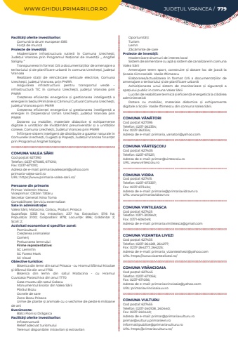 WWW.GHIDULPRIMARIILOR.RO JUDE%u021aUL VRANCEA / 779Facilit%u00e3%u0163i oferite investitorilor:Comun%u0103 la drum european E85For%u0163%u0103 de munc%u0103Proiecte de investi%u0163ii:Modernizare infrastructura rutier%u0103%u00a0 %u00een Comuna Ureche%u0219ti, Jude%u021bul Vrancea prin Programul Na%u021bional de Investi%u021bii ,, Anghel Saligny %u201cTranspunerea %u00een format GIS a documenta%u021biilor de amenajare a teritoriului %u0219i de planificare urban%u0103 %u00een comuna Ureche%u0219ti, jude%u021bul VranceaRealizare sta%u021bii de re%u00eenc%u0103rcare vehicule electrice, Comuna Ureche%u0219ti, jude%u021bul Vrancea, prin PNRR.Asigurarea infrastructurii pentru transportul verde %u2013 infrastructur%u0103 TIC %u00een comuna Ureche%u0219ti, jude%u021bul Vrancea%u00a0 prin PNRRCre%u0219terea eficien%u021bei energetice %u0219i gestionarea inteligen%u021b%u0103 a energiei %u00een Sediul Prim%u0103riei %u0219i C%u0103minul Cultural Comuna Ureche%u0219ti, jude%u021bul Vrancea prin PNRRCre%u0219terea eficien%u021bei energetice %u0219i gestionarea inteligen%u021b%u0103 a energiei %u00een Dispensarul Uman Ureche%u0219ti, jude%u021bul Vrancea prin PNRRDotarea cu mobilier, materiale didactice %u0219i echipamente digitale a unit%u0103%u021bilor de %u00eenv%u0103%u021b%u0103m%u00e2nt preuniversitar %u0219i a unit%u0103%u021bilor conexe, Comuna Ureche%u0219ti, Judetul Vrancea prin PNRR%u00cenfiin%u021bare sistem inteligent de distributie a gazelor naturale %u00een Comunele Ureche%u0219ti, Guge%u0219ti %u0219i Pope%u0219ti, Jude%u021bul Vrancea finan%u021bat prin Programul Anghel SalignyCOMUNA VALEA S%u0102RIICod po%u0219tal: 627390Telefon: 0237-671085, 671010; Fax: 0237-671010; Adresa de e-mail: primariavaleasarii@yahoo.comprimaria-valea-sarii.roURL: https://www.primaria-valea-sarii.ro/Persoane din primarie:Primar: Valentin%u00a0Marcu%u00a0Viceprimar: C%u0103t%u0103lin T%u0103t%u0103ruSecretar General: Nina%u00a0TomaContabilitate: Serviciu externalizatSate %u00een administra%u021bie:Valea S%u0103rii, Matacina, Colacu, Poduri, PrisacaSuprafa%u021ba:%u00a0 5353 ha; Intravilan:%u00a0 237 ha; Extravilan:%u00a0 5116 ha; Popula%u021bia:%u00a0 2100; Gospod%u0103rii:%u00a0 878; Locuin%u021be:%u00a0 896; Gr%u0103dini%u021be:%u00a0 2; %u0218coli:%u00a02; Activitati economice si specifice zonei:Pomicultur%u0103Cre%u0219terea animalelorComer%u021bPrelucrarea lemnuluiFirme reprezentative:SC LemnfinSC Forest MarkSC VisvalObiective turistice:Biserica din lemn din satul Prisaca - cu Hramul Sf%u00e2ntul%u00a0Nicolae %u015fi Sf%u00e2ntul%u00a0Ilie din anul 1756Biserica din lemn din satul Matacina - cu Hramul Cuvioasa%u00a0Paraschiva din anul 1770Casa muzeu din satul ColacuMonumentul Eroilor din Valea S%u0103riiP%u00e2r%u00e2ul BozuOcnele de sareZona Bozu PrisacaUrme de plante %u0219i animale cu o vechime de peste 6 milioane de aniEvenimente:B%u00e2lci Florii %u0219i%u00a0Dr%u0103gaicaFacilit%u00e3%u0163i oferite investitorilor:Infrastructur%u0103Relief adecvat turismuluiTerenuri disponibile: intravilan %u0219i extravilanOportunit%u0103%u021bi:TurismLemnZ%u0103c%u0103minte de sareProiecte de investi%u0163ii:Modernizare drumuri de interes localSistem de alimentare cu ap%u0103 %u0219i sistem de canalizare %u00een comuna Valea S%u0103riiAmenajare teren sport, construire %u0219i dotare loc de joac%u0103 la %u0218coala Gimnazial%u0103- Vasile IftimescuElaborarea/actualizarea %u00een format GIS a documenta%u021biilor de amenajare a teritoriului %u0219i de planificare urban%u0103Achizi%u021bionarea unui sistem de monitorizare %u0219i siguran%u021b%u0103 a spa%u021biului public in comuna Valea S%u0103riiLucr%u0103ri de reabilitare termic%u0103 %u0219i eficien%u021b%u0103 energetic%u0103 la cl%u0103direa administrativ%u0103Dotare cu mobilier, materiale didactice %u0219i echipamente digitale a Scolii- Vasile Iftimescu din comuna Valea S%u0103rii.COMUNA V%u00c2N%u0102TORICod po%u0219tal: 627395Telefon: 0237-262334; Fax: 0237-262334; Adresa de e-mail: primaria_vanatori@yahoo.comCOMUNA V%u00c2RTE%u015eCOIUCod po%u0219tal: 627405Telefon: 0237-675211; Adresa de e-mail: primar@virtescoiu.roURL: www.virtescoiu.roCOMUNA VIDRACod po%u0219tal: 627415Telefon: 0237-673337; Fax: 0237-673424; Adresa de e-mail: primarie@primariavidravn.roURL: www.primariavidravn.roCOMUNA VINTILEASCACod po%u0219tal: 627425Telefon: 0371-303940; Fax: 0371-606049; Adresa de e-mail: primaria.vintileasca@gmail.comCOMUNA VIZANTEA LIVEZICod po%u0219tal: 627435Telefon: 0237-264281, 264277; Fax: 0237-264277, 264225; Adresa de e-mail: primaria_vizantealivezi@yahoo.comURL: https://www.vizantealivezi.ro/COMUNA VR%u00c2NCIOAIACod po%u0219tal: 627445Telefon: 0237-671056; Fax: 0237-671056; Adresa de e-mail: primariavrincioaia@yahoo.comURL: primariavrincioaia.uv.roCOMUNA VULTURUCod po%u0219tal: 627455Telefon: 0237-240108, 240440; Fax: 0237-240440; Adresa de e-mail: primar@primariavulturu.roprimar@vulturu.primarievn.ro informatiipublice@primariavulturu.roURL: https://primariavulturu.ro/