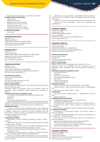 WWW.GHIDULPRIMARIILOR.RO JUDE%u021aUL BIHOR / 97Biserica din lemn din Saca - declarat%u0103 monumentFacilit%u00e3%u0163i oferite investitorilor:Teren %u015fi lemnZ%u0103c%u0103m%u00e2nt de brucitRe%u0163eaua de drumuri asfaltat%u0103Re%u0163ea de ap%u0103 %u00een toat%u0103 comunaConstruirea unei %u015fcoliRealizarea re%u0163elei de canalizareConstruirea unui centru medicalProiecte de investi%u0163ii:CanalizareCOMUNA BUDUSL%u0102UAdres%u0103: nr. 82Cod po%u0219tal: 417105Telefon: 0259-459100; Fax: 0259-459100; Adresa de e-mail: primaria@buduslau.roURL: www.buduslau.bihor.roCOMUNA BULZAdres%u0103: nr 127Cod po%u0219tal: 417110Telefon: 0259-328010, 0359-197692; Fax: 0259-328010; Adresa de e-mail: primaria.bulz@cjbihor.roprimariabulz@gmail.comURL: https://comunabulz.ro/COMUNA BUNTE%u015eTIAdres%u0103: nr. 28Cod po%u0219tal: 417115Telefon: 0259-329180; Fax: 0259-329180; Adresa de e-mail: registratura@comunabuntesti.roURL: www.comunabuntesti.roPersoane din primarie:Primar: Sorin Mihai%u00a0Deg%u0103u%u00a0Viceprimar:%u00a0Secretar General: Florin Mircea%u00a0%u00a0Puie%u00a0Contabil: Ana Maria Fren%u021bSate %u00een administra%u021bie:Bunte%u015fti, Br%u0103det, Dumbr%u0103veni, Ferice, Lele%u015fti, Poieni de Jos, Poieni de Sus, S%u0103ud, St%u00e2nce%u015ftiSuprafa%u021ba:%u00a0 7386 ha; Intravilan:%u00a0 3242 ha; Extravilan:%u00a0 12307 ha; Popula%u021bia:%u00a0 4464; Gospod%u0103rii:%u00a0 1219; Locuin%u021be:%u00a0 1416; Gr%u0103dini%u021be:%u00a0 7; %u0218coli:%u00a04; Activitati economice si specifice zonei:Principalele activit%u0103%u021bi specifice comunei Bunte%u0219ti sunt:AgriculturaTurismulPrelucrarea masei lemnoaseO parte din popula%u021bia comunei lucreaz%u0103 %u00een industrie, principalul angajator fiind grupul de firme Transilvania pe platformele de la Sudrigiu, Rieni %u0219i Stei sau firmele de prelucrare a lemnuluiObiective turistice:Turismul nu poate trece neinteresat prin comun%u0103, f%u0103r%u0103 s%u0103 se opreasc%u0103 m%u0103car la cele dou%u0103 biserici de lemn de la St%u00e2nce%u0219ti %u0219i Br%u0103det, construite %u00een secolul al XVI-lea. Ponderea cea mai %u00eensemnat%u0103 %u00een sectorul turistic o are de%u021binerea de c%u0103tre comuna Bunte%u0219ti a platoului carstic Padi%u0219Poiana V%u0103r%u0103%u015foaiaProiecte de investi%u0163ii:Alimentare cu ap%u0103%u00a0 localit%u0103%u021bile Bunte%u0219ti, Lele%u0219ti %u0219i S%u0103ud - finalizatModernizare drumuri comunale %u00een localit%u0103%u021bile%u00a0Lele%u0219ti, Bunte%u0219ti %u0219i Poieni de Jos - finalizatModernizare c%u0103mine culturale %u00een localit%u0103%u021bile%u00a0Br%u0103det, Bunte%u0219ti, Dumbr%u0103vani, Lele%u0219ti,Poieni de Sus, St%u00e2nce%u0219ti - finalizatModernizare %u0219coala general%u0103%u00a0localitatea Bunte%u0219ti- finalizatProiecte de viitorAlimentare cu ap%u0103%u00a0 potabil%u0103%u00a0 , canalizare %u0219i sta%u021bie de epurare pentru localit%u0103%u021bile Br%u0103det, St%u00e2nce%u0219ti %u0219i Dumbr%u0103vaniCrearea unui spa%u021biu public de agrement %u0219i a unui instrument modern de asisten%u021b%u0103%u00a0social%u0103%u00a0%u00een comuna Bunte%u0219ti, localitatea%u00a0Poieni de Sus- finalizatAlimentare cu ap%u0103%u00a0 potabil%u0103%u00a0 a localita%u021bilor Poieni de Sus %u0219i Poieni de Jos %u0219i canalizare %u00een restul localit%u0103%u021bilor comunei Bunte%u0219ti in derulareContruire c%u0103min cultural %u00een localitatea S%u0103ud, Comuna Bunte%u0219tiCapel%u0103%u00a0 mortuar%u0103%u00a0 localit%u0103%u021bile%u00a0 %u00a0 Poeni de Jos,Poieni de Sus,St%u00e2nce%u0219tiCOMUNA C%u0102BE%u015eTIAdres%u0103: Principal%u0103, nr. 10Cod po%u0219tal: 417125Telefon: 0259-325287, 325203; Fax: 0259-325203; Adresa de e-mail: primaria.cabesti@yahoo.comURL: http://cabesti-bh.roCOMUNA C%u0102P%u00c2LNAAdres%u0103: Principal%u0103, nr. 115Cod po%u0219tal: 417130Telefon: 0259-312016; Fax: 0259-312016; Adresa de e-mail: primaria.capilna@cjbihor.roURL: www.primaria-capilnabh.roPersoane din primarie:Primar: R%u0103zvan Bir%u0103uViceprimar:Secretar General:%u00a0Radu Agud%u00a0Contabil: Alina AvramSate %u00een administra%u021bie:C%u0103p%u00eelna, Rohani, Ginta, S%u0103ld%u0103bagiu Mic,%u00a0Suplacu de TincaSuprafa%u021ba:%u00a0 5489 ha; Intravilan:%u00a0 388 ha; Extravilan:%u00a0 5101 ha; Popula%u021bia:%u00a0 1564; Gospod%u0103rii:%u00a0 1250; Locuin%u021be:%u00a0 1261; Gr%u0103dini%u021be:%u00a0 4; %u0218coli:%u00a02; Activitati economice si specifice zonei:Cultivarea terenuluiZootehnieComer%u0163 cu am%u0103nuntulActivit%u0103%u0163i me%u015fte%u015fug%u0103re%u015fti localeAgriculturaPrelucrarea lemnuluiCre%u015fterea animalelorObiective turistice:Biserica de lemn %u201cSf%u00e2ntul Nicolae%u201d (1724) - sat C%u0103p%u00eelnaBiserica de lemn %u201cSf%u00e2ntul Ierarh Nicolae%u201d (1769) - sat S%u0103ld%u0103bagiu MicPensiune agroturistic%u0103 %u201cAdjur%u201d - GintaEvenimente:T%u00e2rg de animale %u015fi agroalimentar%u0103 - s%u0103pt%u0103m%u00e2nal %u00een ziua de vineriDansuri populareFacilit%u00e3%u0163i oferite investitorilor:Acordarea de reducere la taxe %u0219i impozite localeFor%u021b%u0103 de munc%u0103 disponibil%u0103Posibilitatea de concesionare, arendare %u0219i cump%u0103rare de terenExisten%u021ba unor spa%u021bii %u0219i cl%u0103diri, posibil a fi utilizate de c%u0103tre investitoriDeschiderea autorit%u0103%u021bilor locale la realizarea de parteneriateProiecte de investi%u0163ii:Modernizare %u0219i eficientizare sistem de iluminat public %u00een Comuna C%u0103p%u00e2lnaStudiu de fezabilitate %u0219i Proiect Tehnic pentru Amenajare parc fotovoltaice n Comuna C%u0103p%u00e2lnaIntocmire Studiu de fezabilitate sistem de Canalizare %u00een Comuna C%u0103p%u00e2lna%u00centocmire SF Alimentare cu gaz a Comunei C%u0103p%u00e2lnaEficientizare cl%u0103dire Prim%u0103ria veche C%u0103p%u00e2lnaLucr%u0103ri de modernizare DC %u0219i str%u0103zi %u00een localitatea C%u00eep%u00e2lnaEficientizare cl%u0103dire Prim%u0103ria C%u0103p%